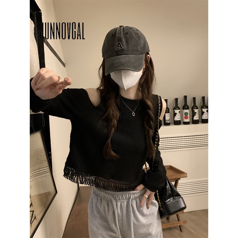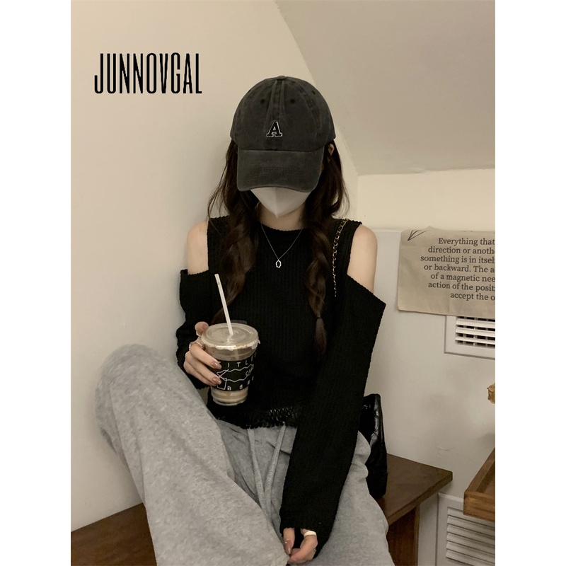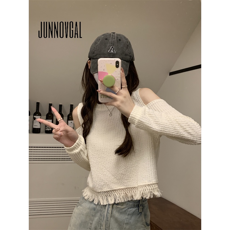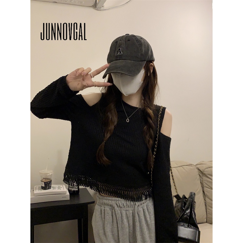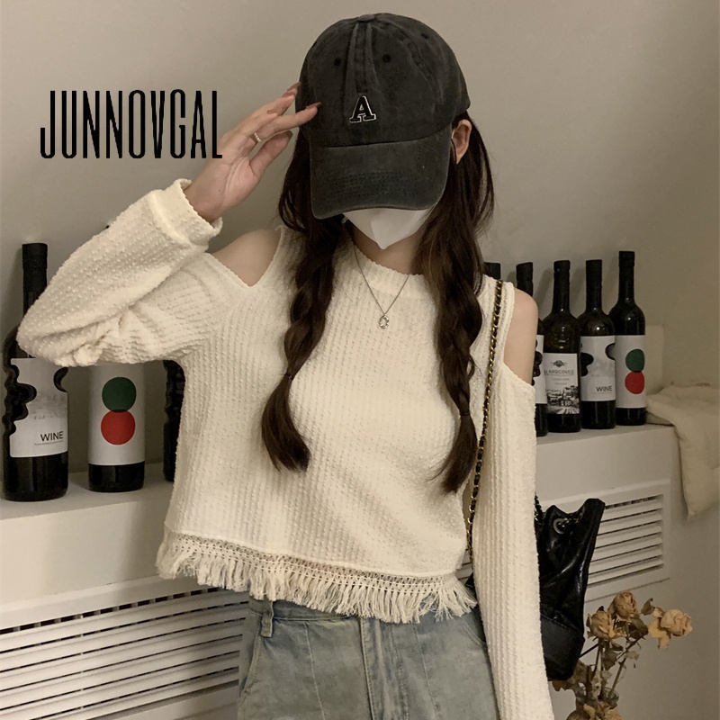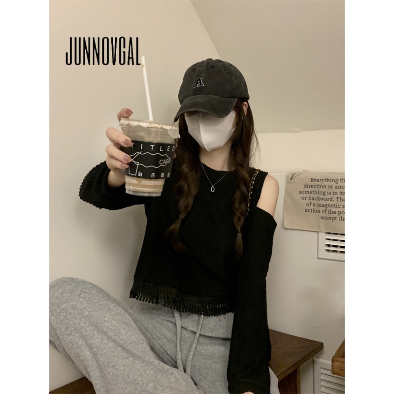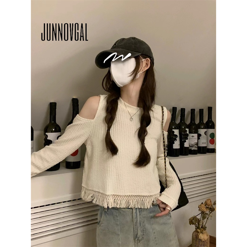 JUNNOVGAL เสื้อยืดผู้หญิงถักสีทึบคอกลมกลวงออกลําลองสไตล์ใหม่แขนยาว