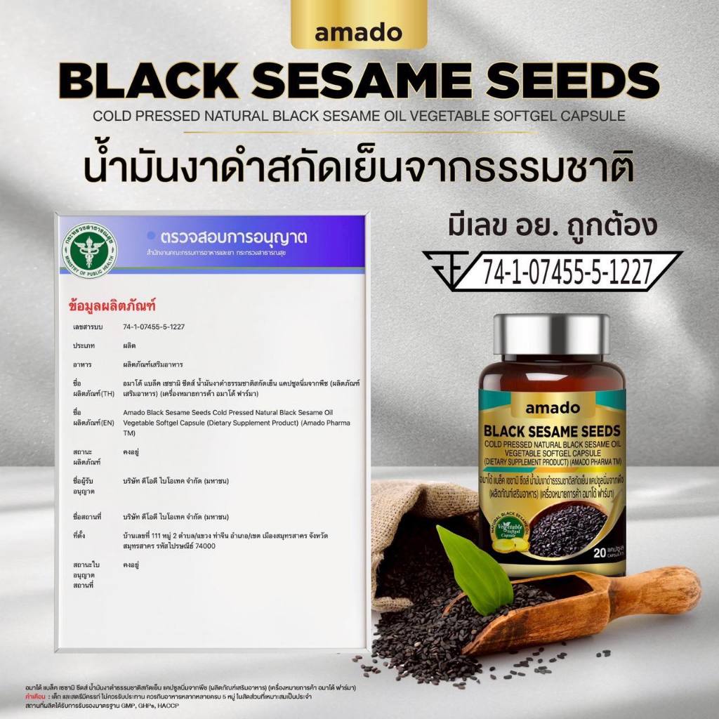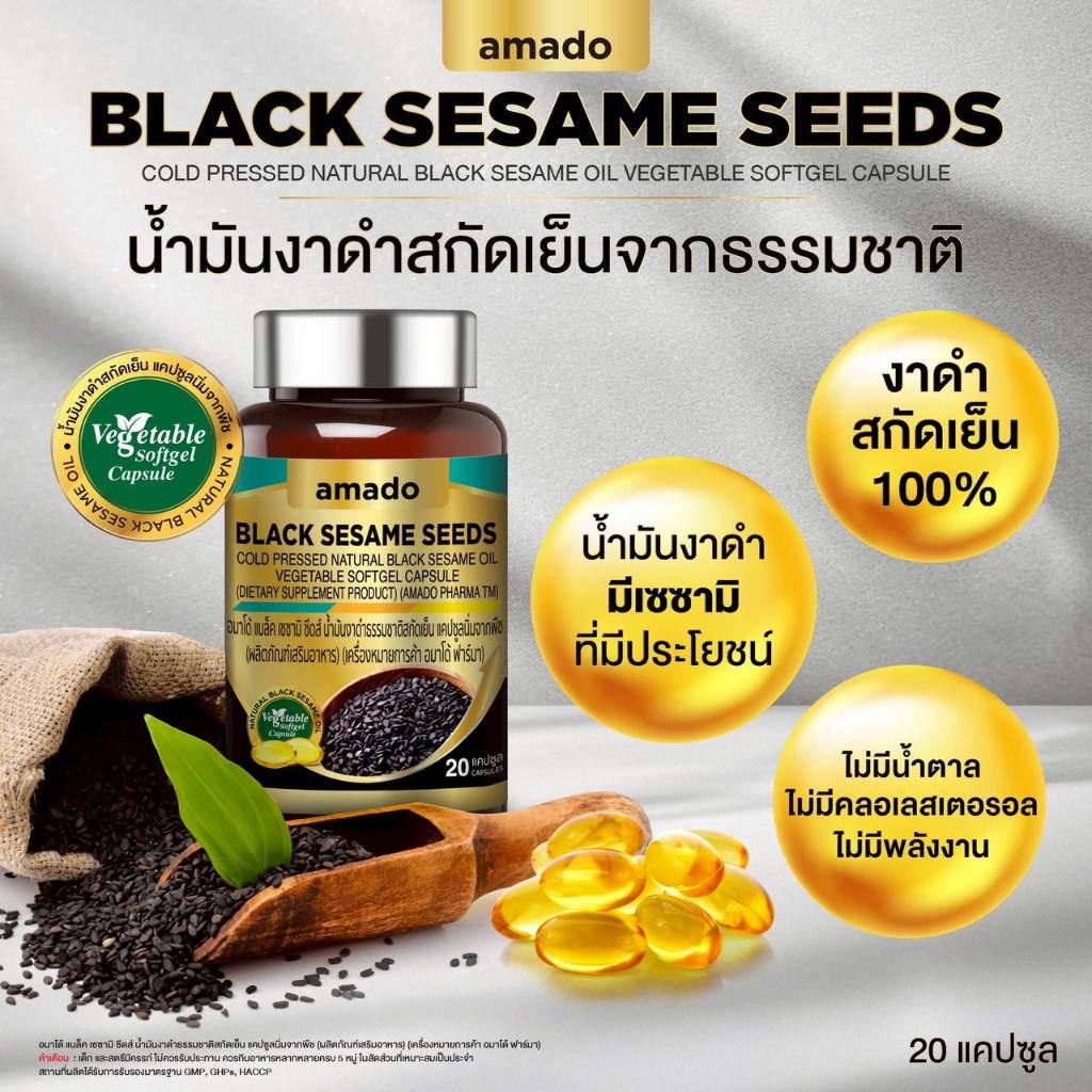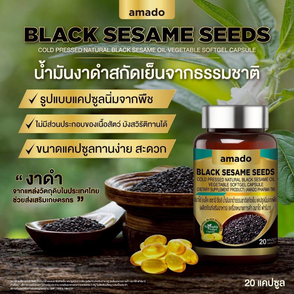 Amado Black Sesame Seeds อมาโด้ แบล็ค เซซามิ ซีดส์ [20 แคปซูล] น้ำมันงาดำ ธรรมชาติ สกัดเย็น