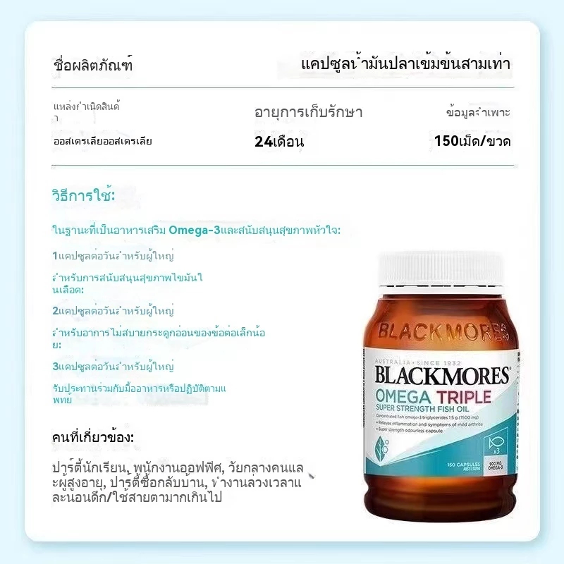 ข้อเสนอมีเวลาจำกัด Blackmores Omega Triple Concentrated Fish Oil 150 Capsules น้ำมันปลา 1,500 mg สุขภาพสมอง หัวใจExp2027