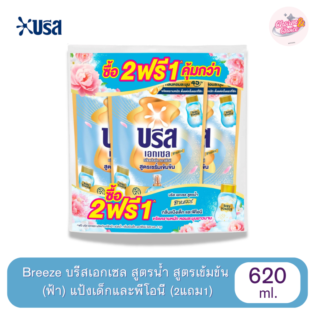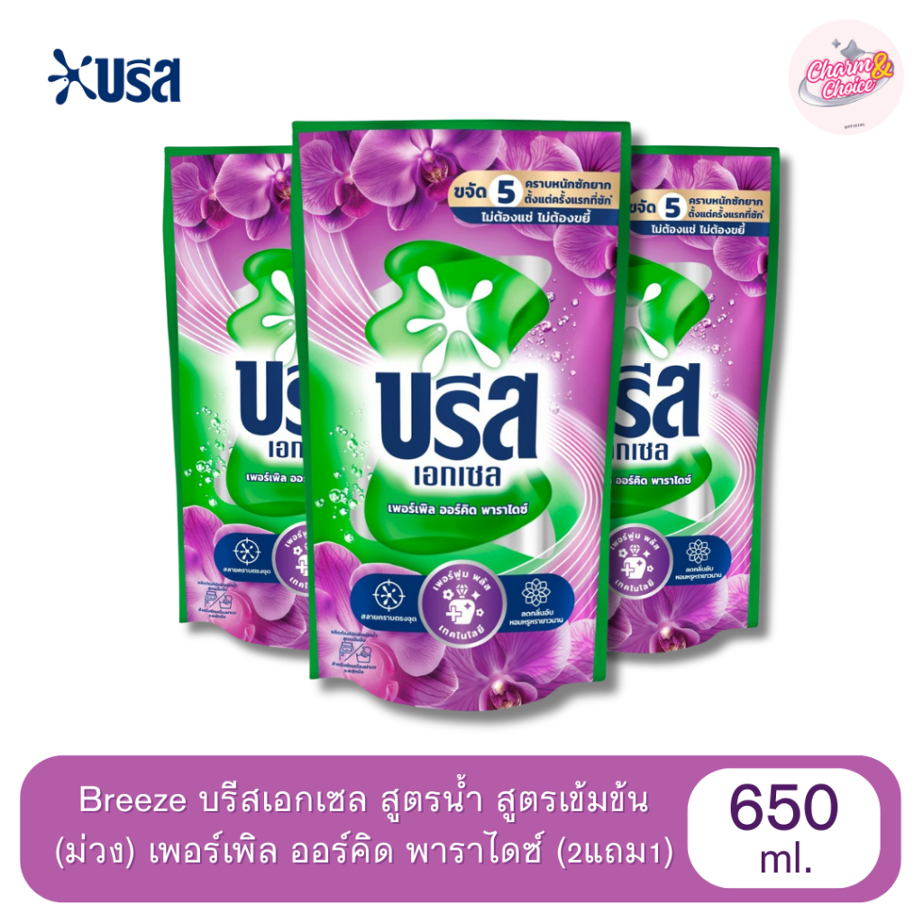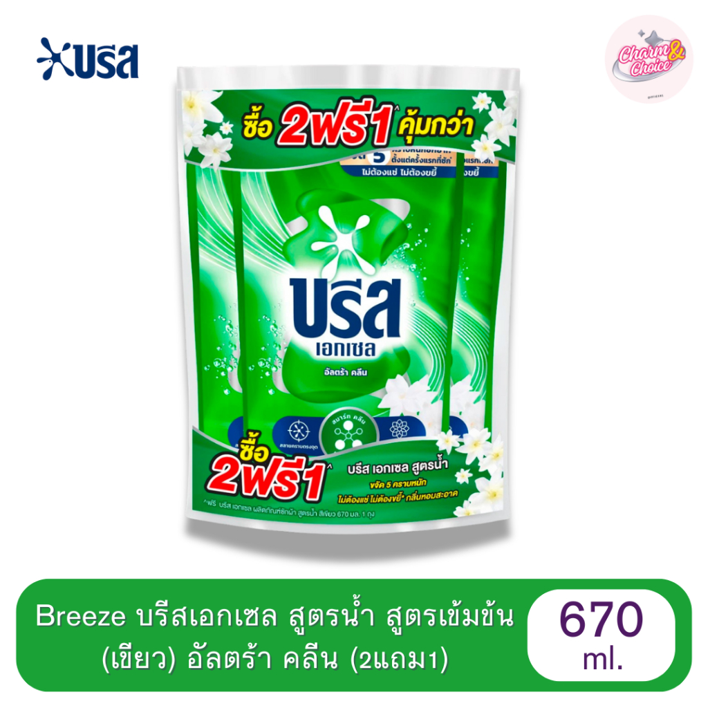 (2 แถม 1) Breeze ผลิตภัณฑ์ซักผ้าชนิดน้ำ บรีส เอ็กเซล สูตรเข้มข้น ขจัดคราบฝังลึก 620 มล. – 670 มล. แพ็ค 3 ถุง