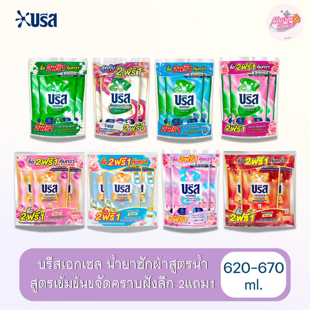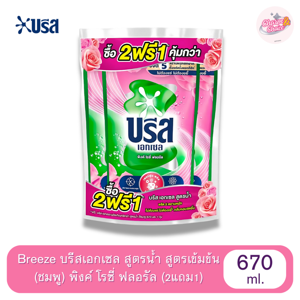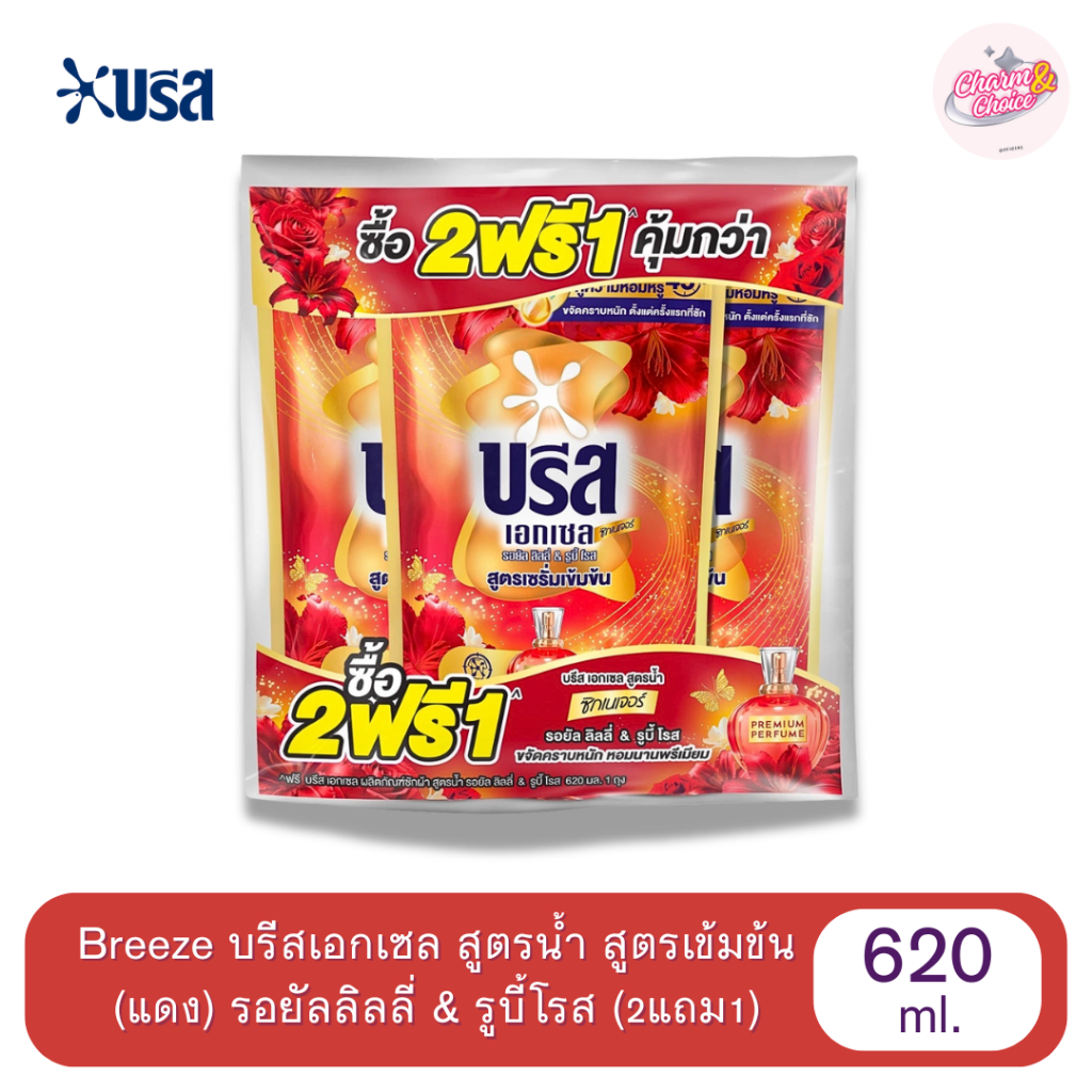 (2 แถม 1) Breeze ผลิตภัณฑ์ซักผ้าชนิดน้ำ บรีส เอ็กเซล สูตรเข้มข้น ขจัดคราบฝังลึก 620 มล. – 670 มล. แพ็ค 3 ถุง