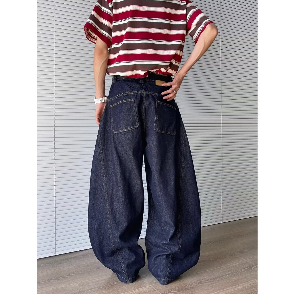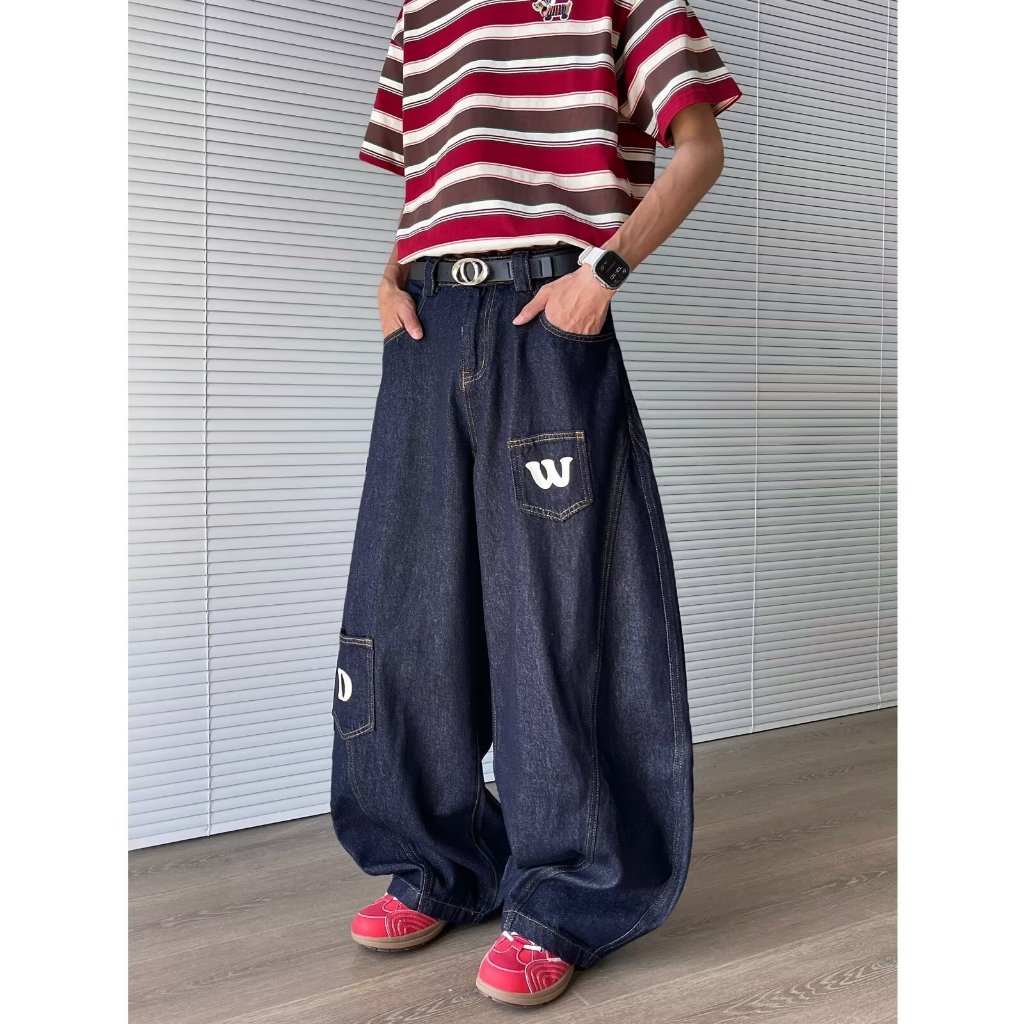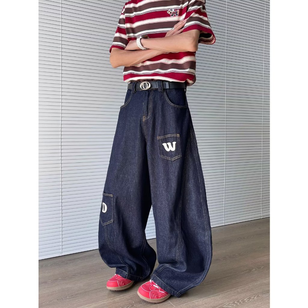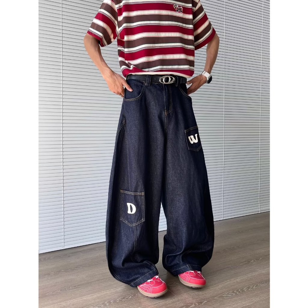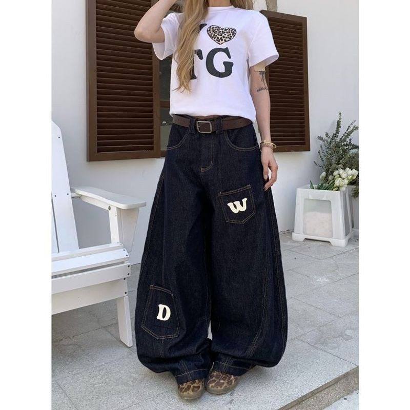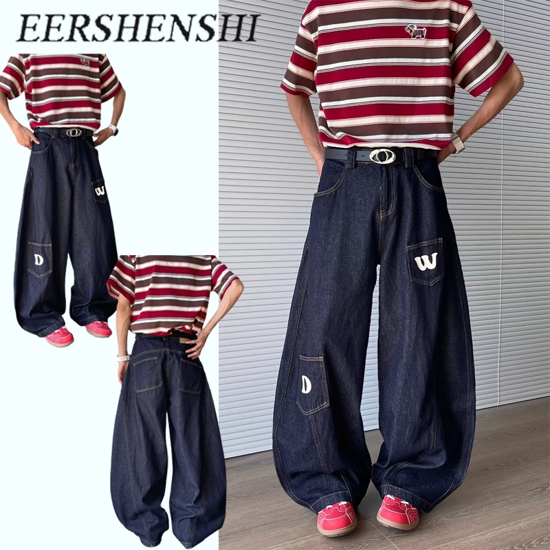 Eershenshi กางเกงยีนส์โปรไฟล์มาเซเต้ ใหม่การออกแบบพิมพ์ตัวอักษรอเมริกันกางเกงถูพื้นขากว้างหลวม