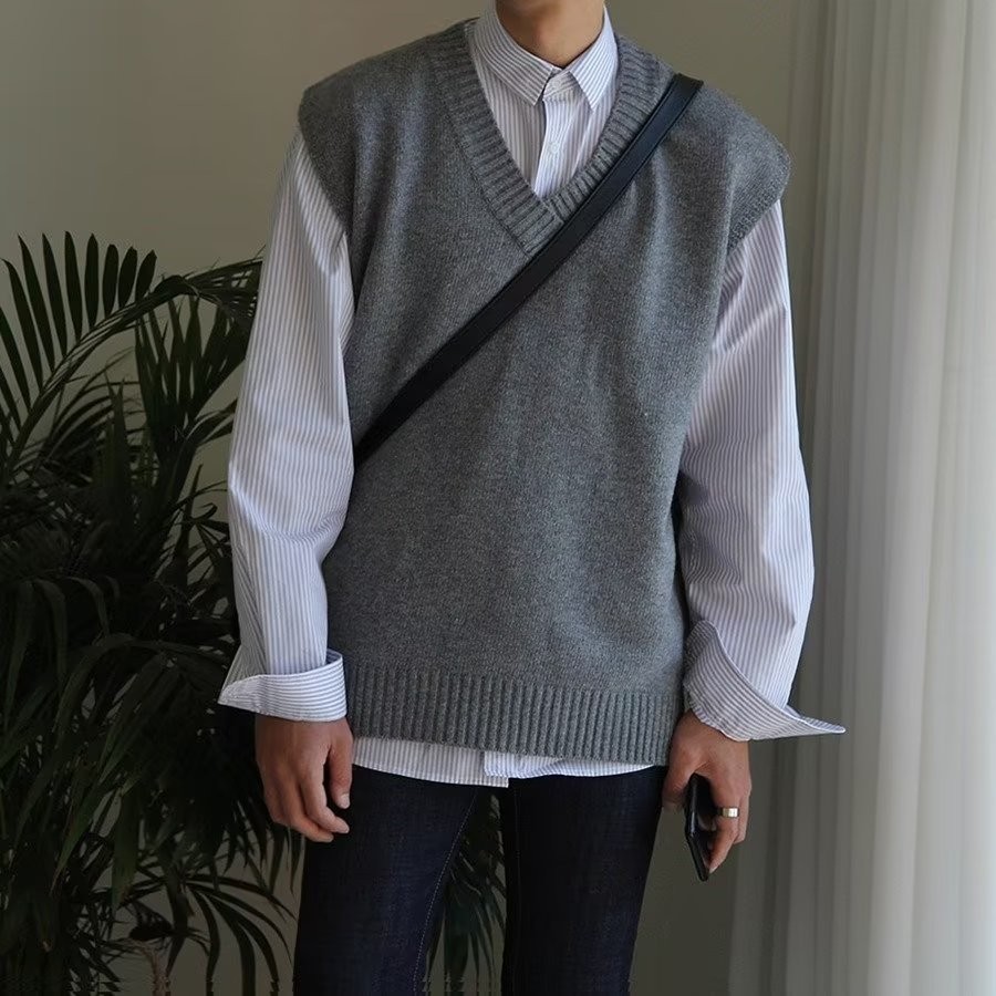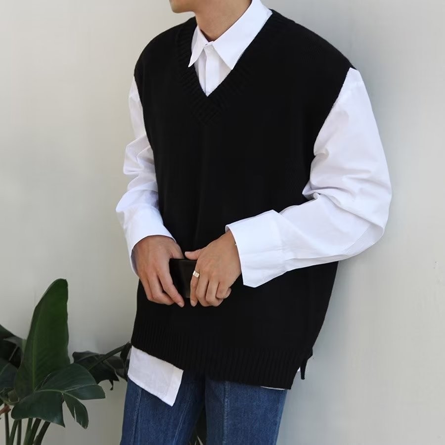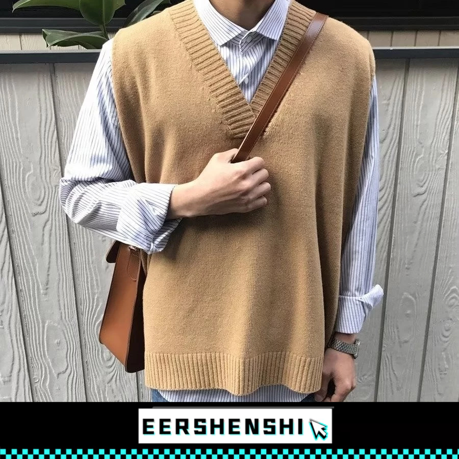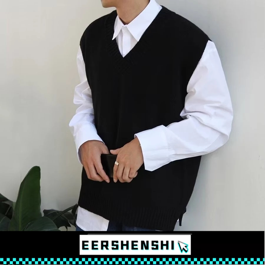 EERSHENSHI ผู้ชายเสื้อกั๊กถักสีทึบจับคู่เสื้อลําลองคลาสสิกด้านบน