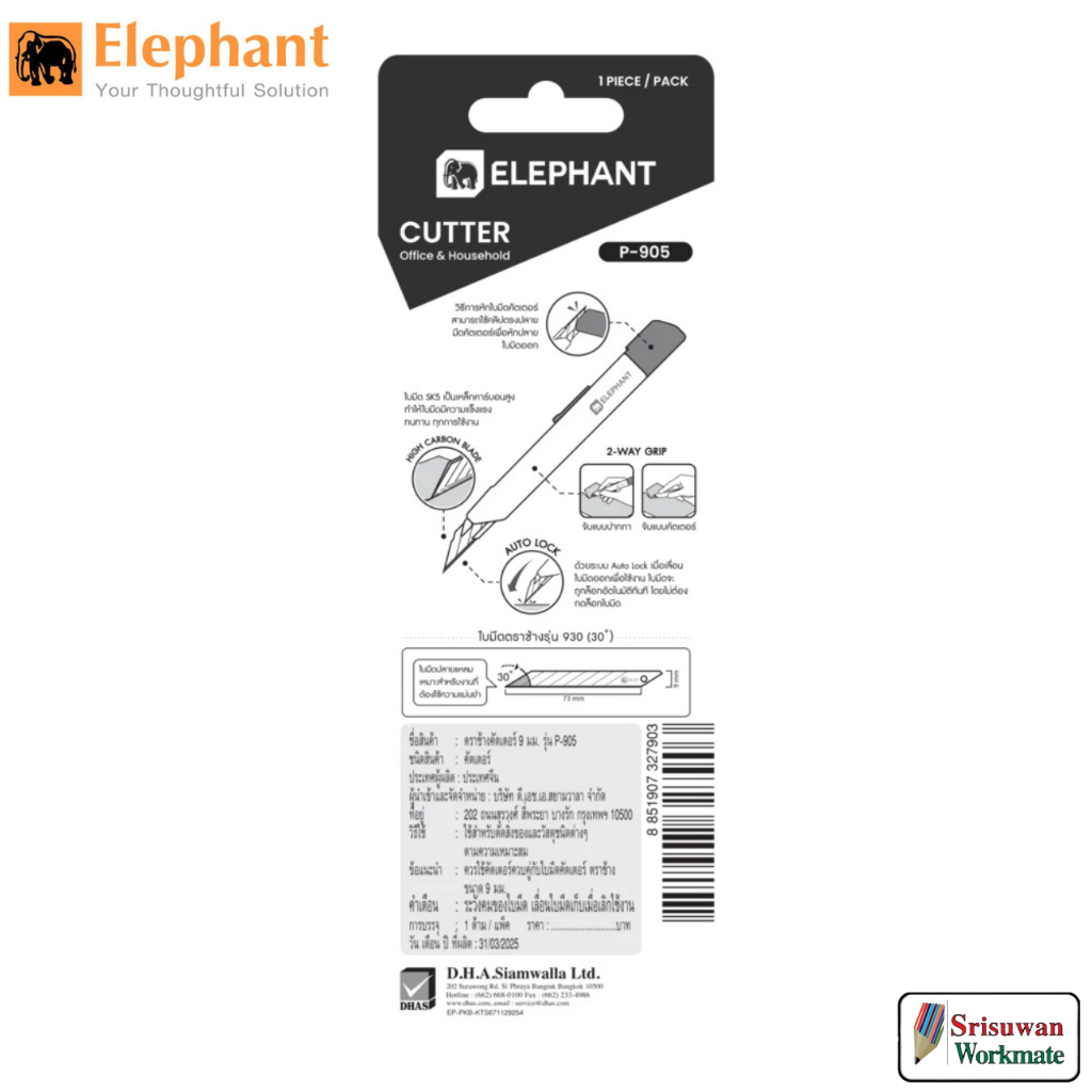 Elephant ตราช้าง คัตเตอร์ มีดคัตเตอร์ 18 มม. รุ่น H-1804 พร้อมที่เปิดอเนกประสงค์ จำนวน 1 อัน