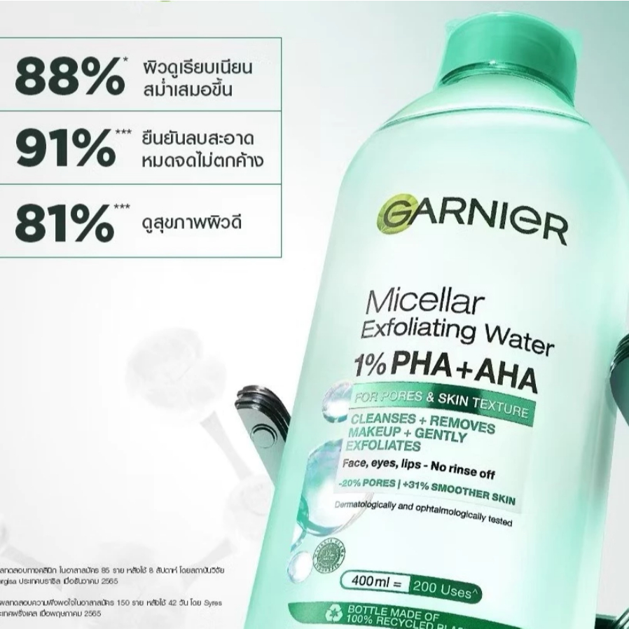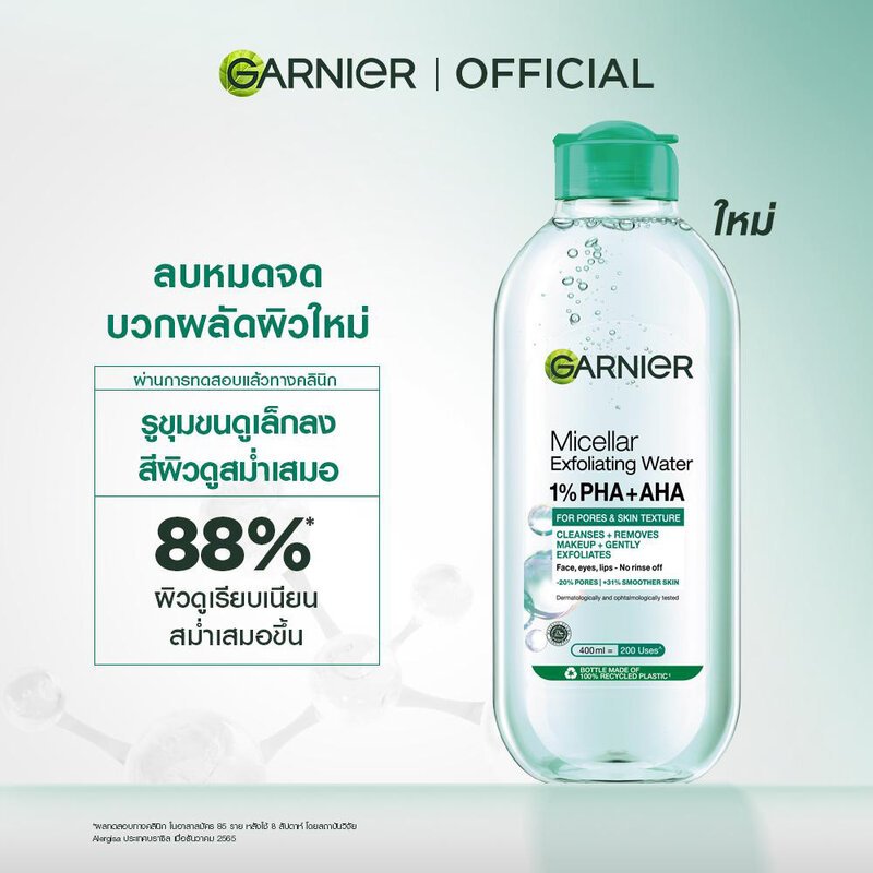 GARNIER MICELLAR CLEANSING WATER EXFOLIATING การ์นิเย่ ไมเซล่า คลีนซิ่ง วอเตอร์ เอ็กซ์ฟอลิเอตติ้ง Green 125 ml.