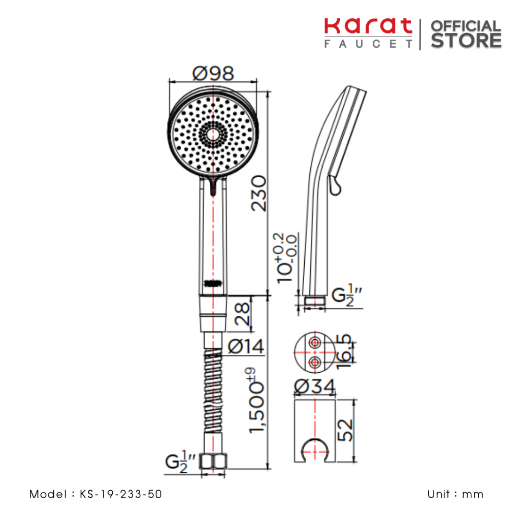 Karat Faucet ฝักบัวสายอ่อน 3 ระดับ ขนาด 9.8 ซม. พร้อมสายสแตนเลส KS-19-233-50