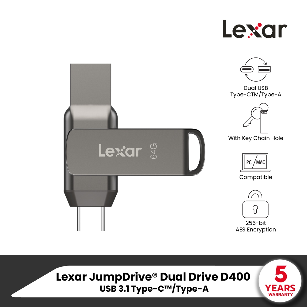 Lexar D400 64GB Dual USB Type-C/A USB 3.1 Flash Drive 2-in-1 (แฟลชไดรฟ์ทูอินวัน) (LJDD400064G) Metal, Android PC Mac