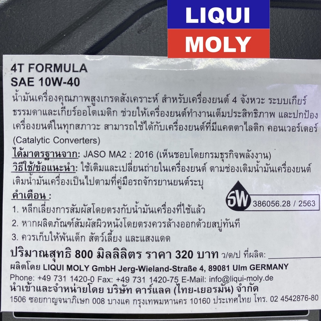 น้ำมันเครื่องมอเตอร์ไซด์ LIQUI MOLY 10W40 4T 0.8ลิตร รถมอเตอร์ไซค์ 4 จังหวะ HondaWave, SCOOPY, FINO
