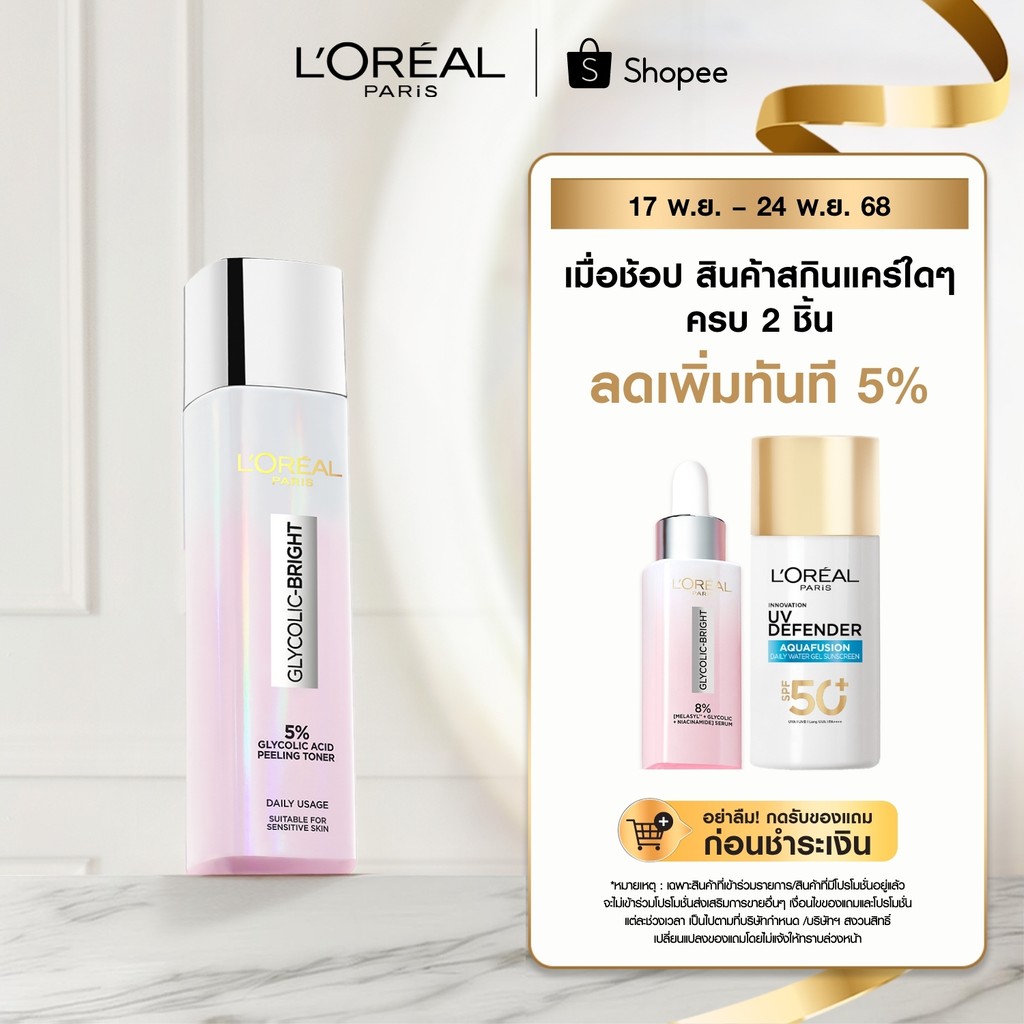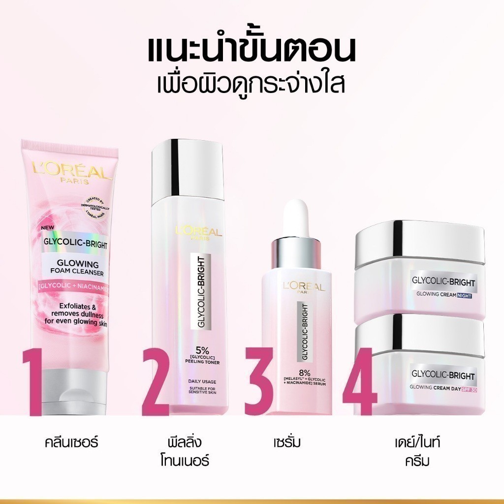 ลอรีอัล ปารีส L’Oréal Paris Glycolic Bright Peeling Toner 128ml โทนเนอร์ผลัดเซลล์ผิว เพื่อผิวดูเรียบเนียน กระจ่างใส