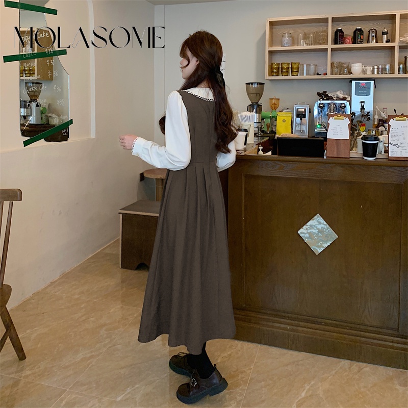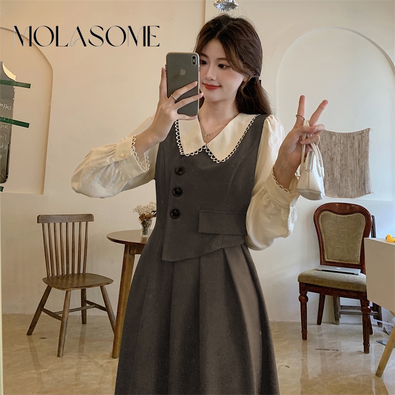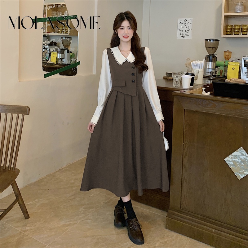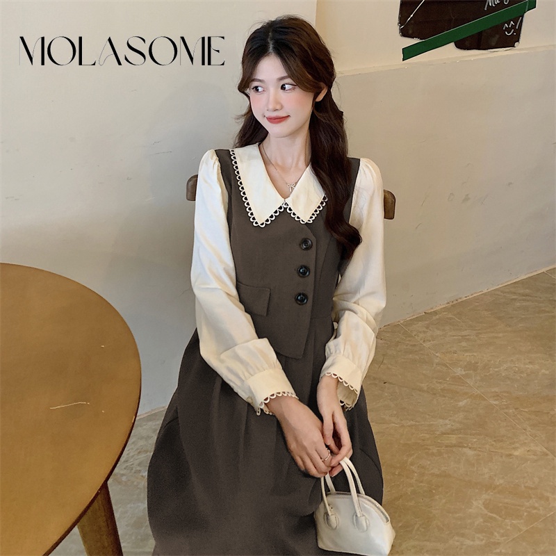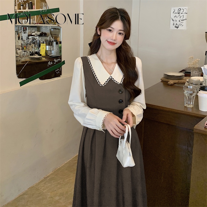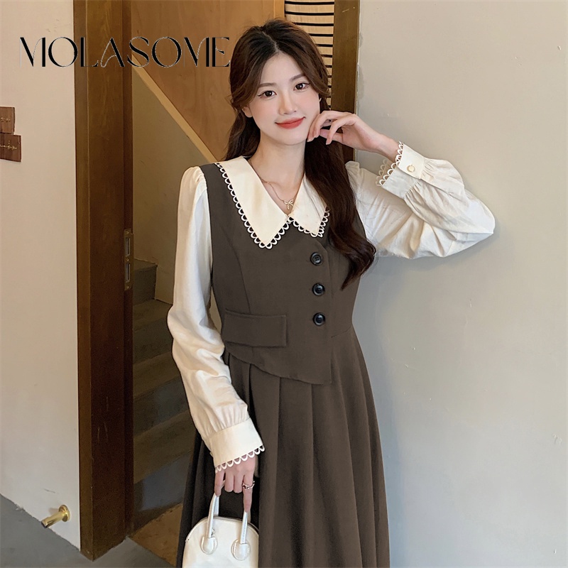 MOLASOME ผู้หญิง Retro ปลอมสองชิ้นแขนยาวสีตัดกัน Maxi Dress
