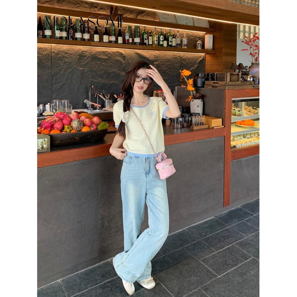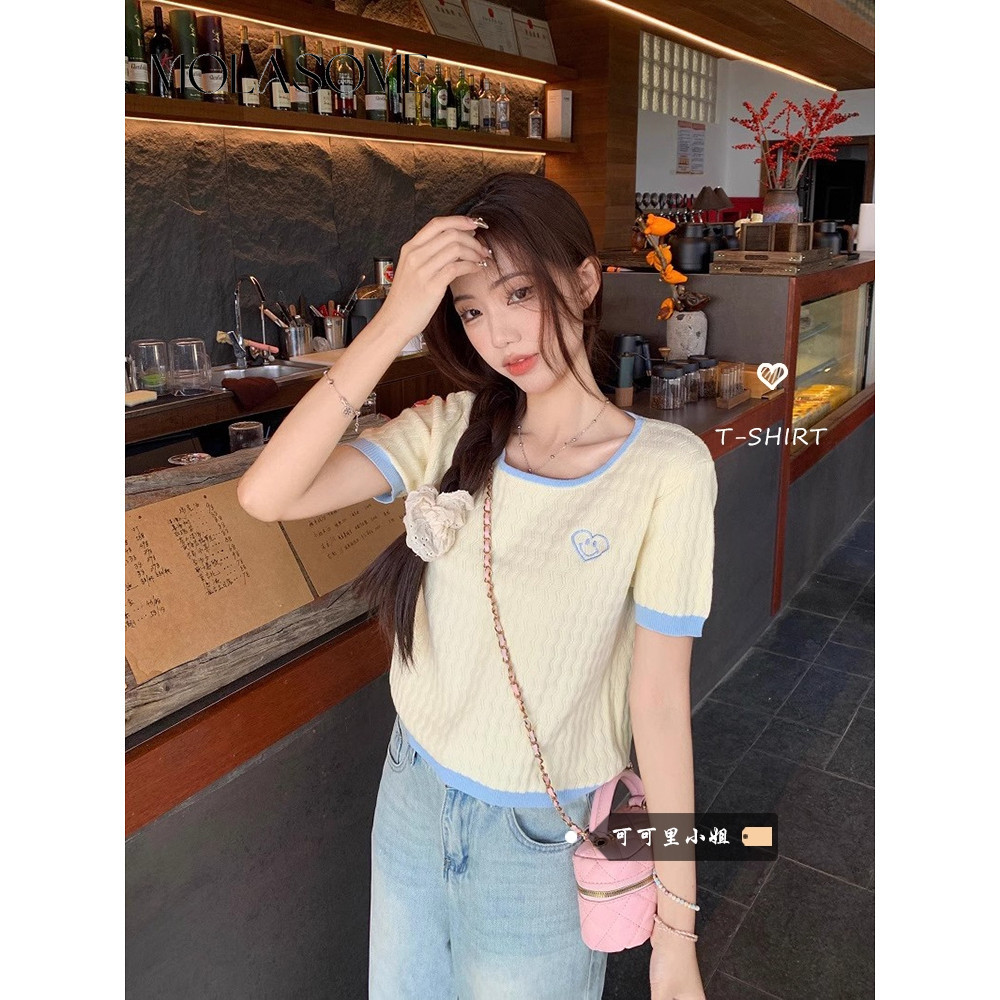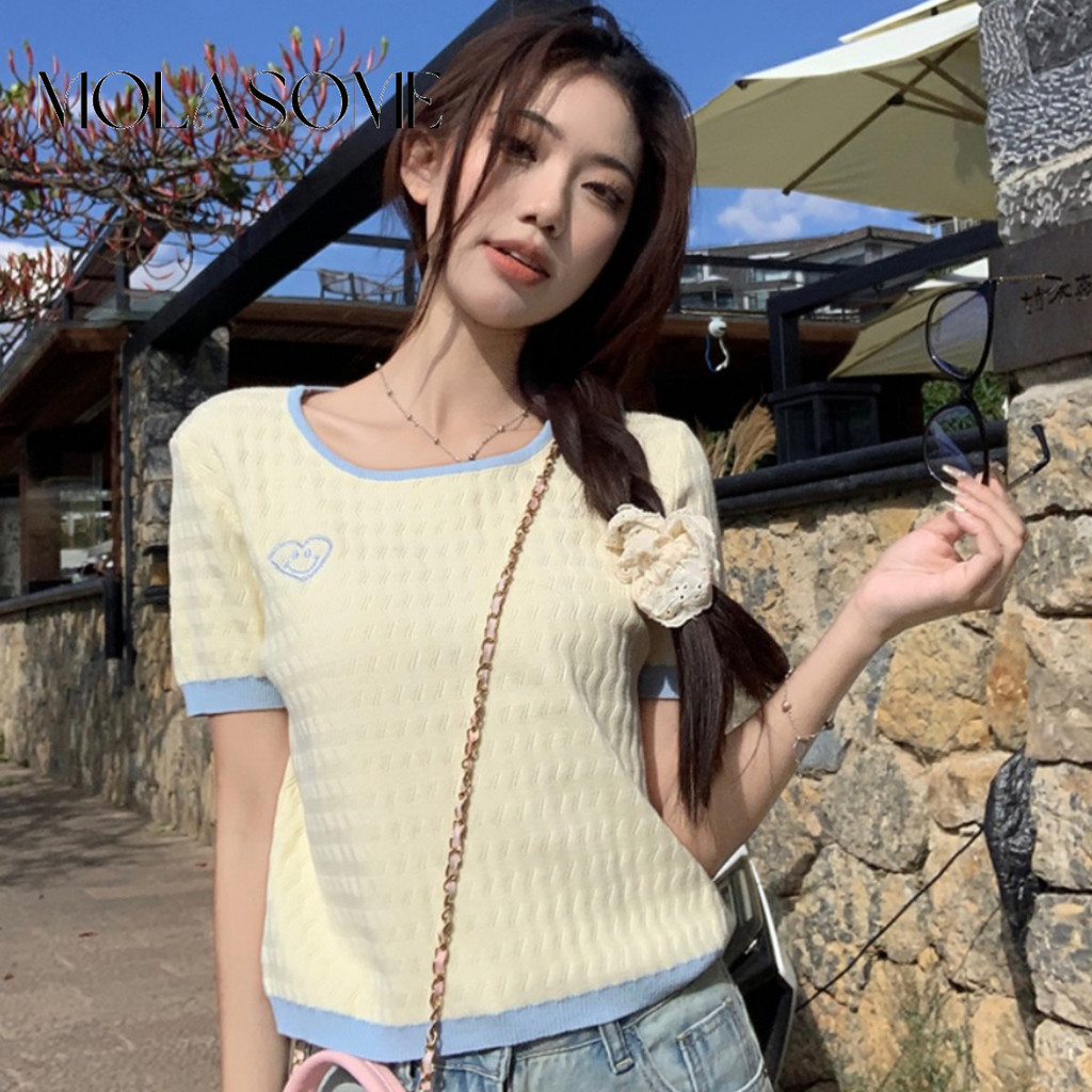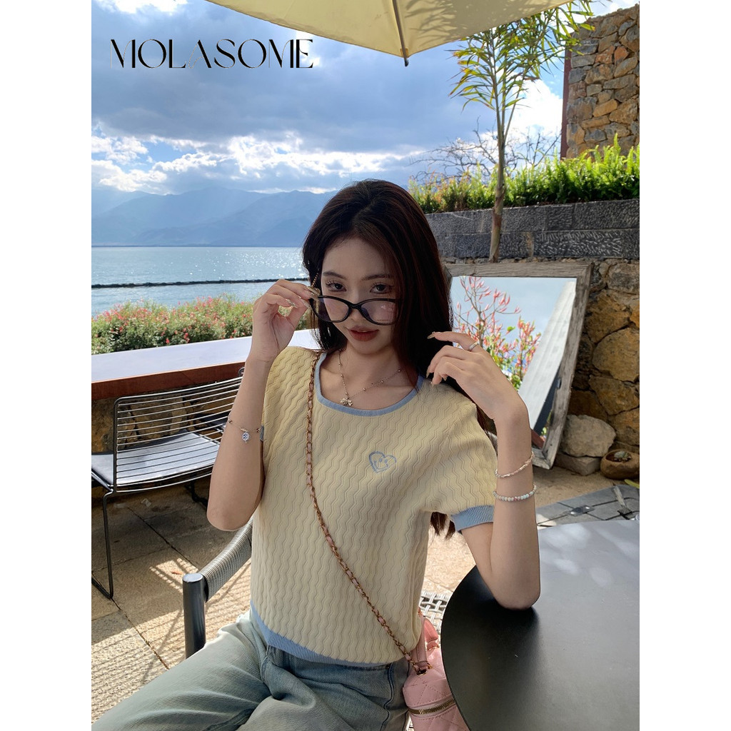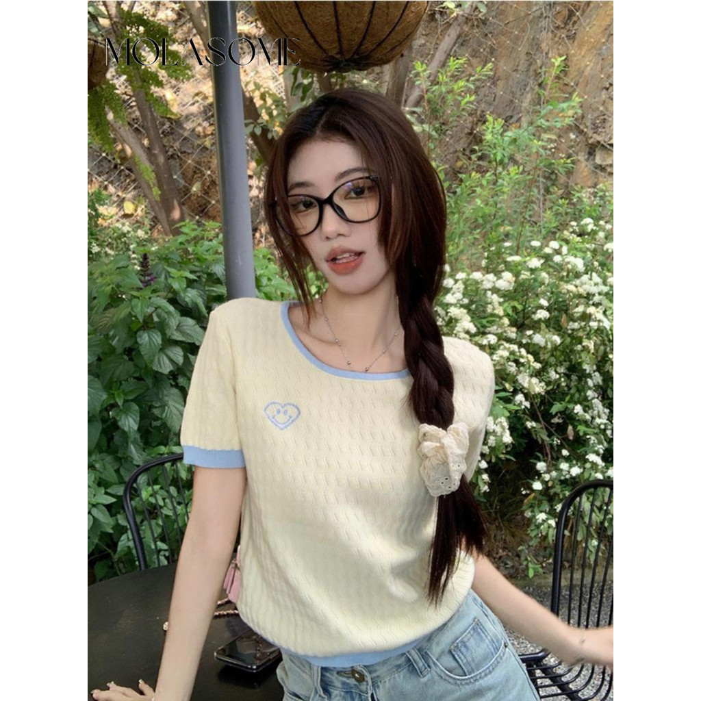 โมลาโซเมะ ผู้หญิงแฟชั่นใหม่สีคมชัดคอกลมแขนสั้นสลิมฟิตทุกการแข่งขันเสื้อยืด