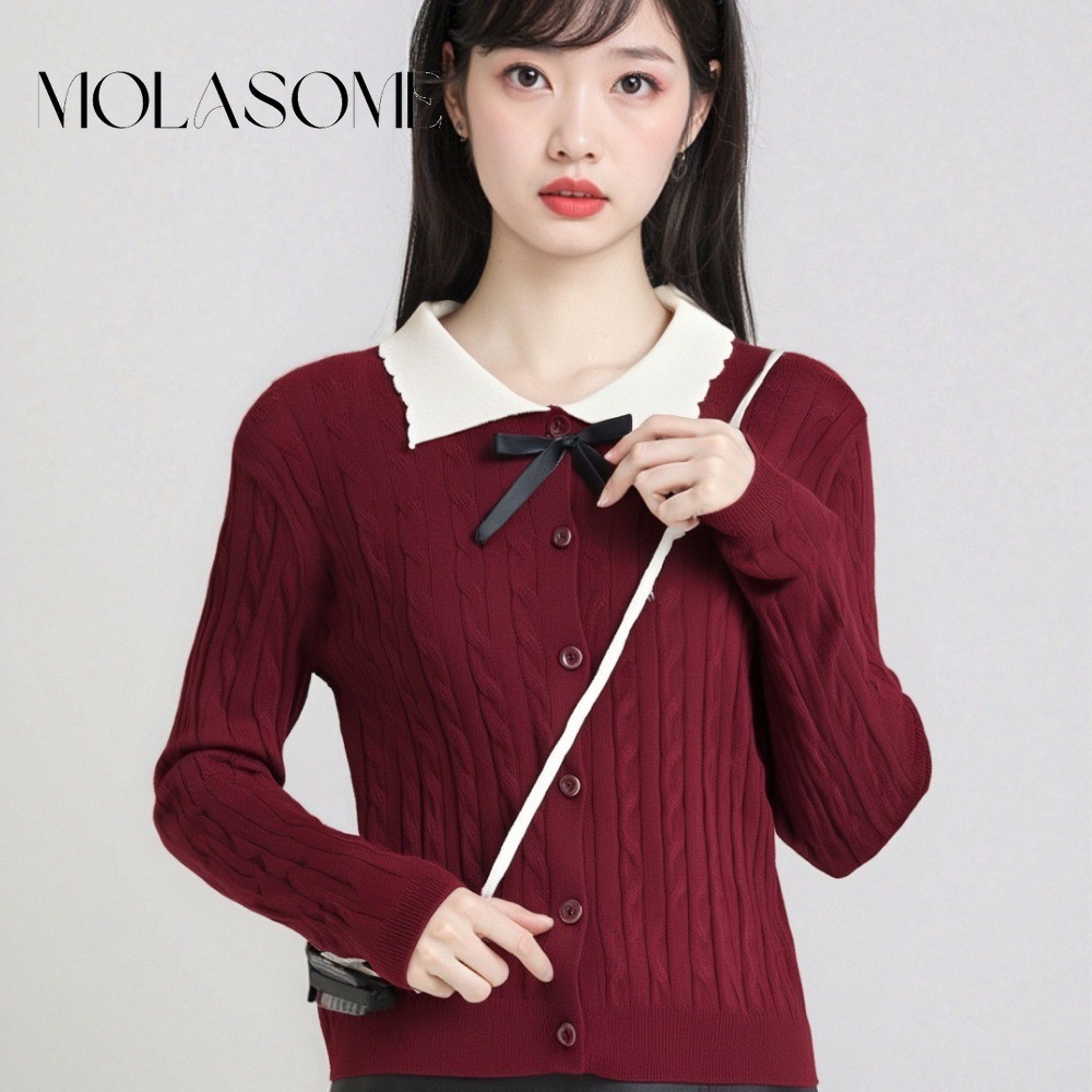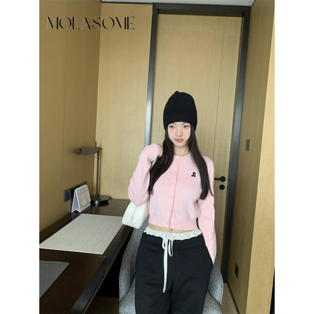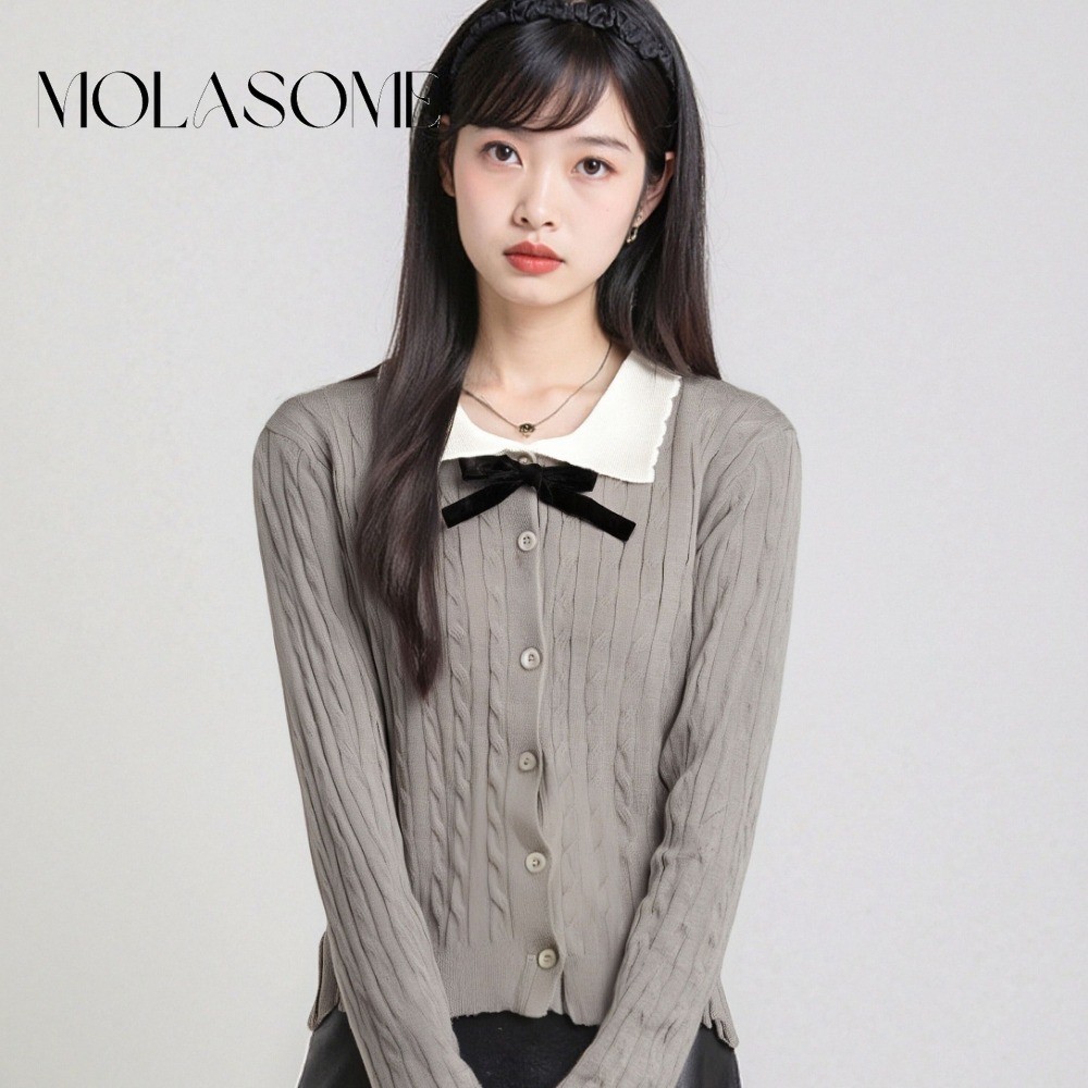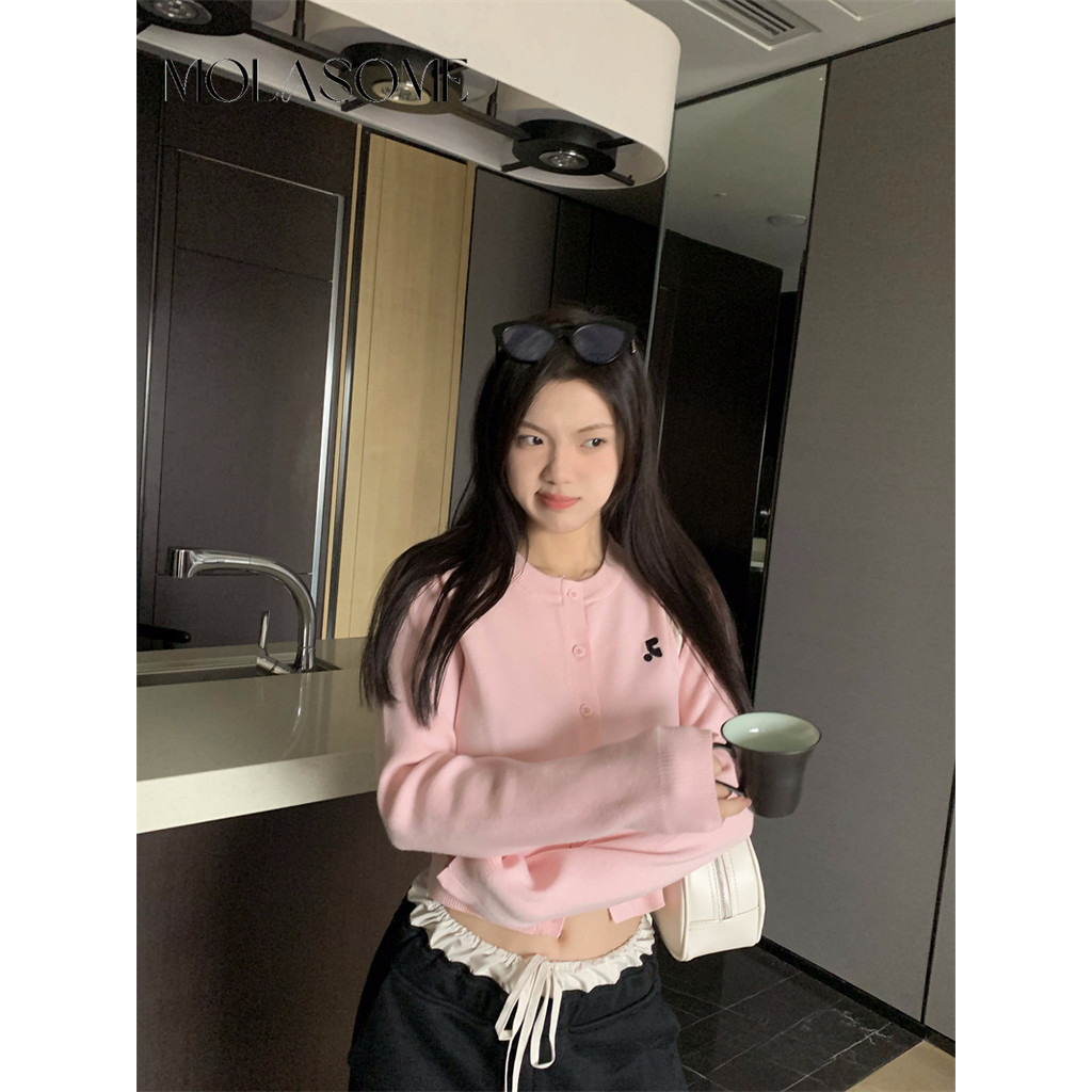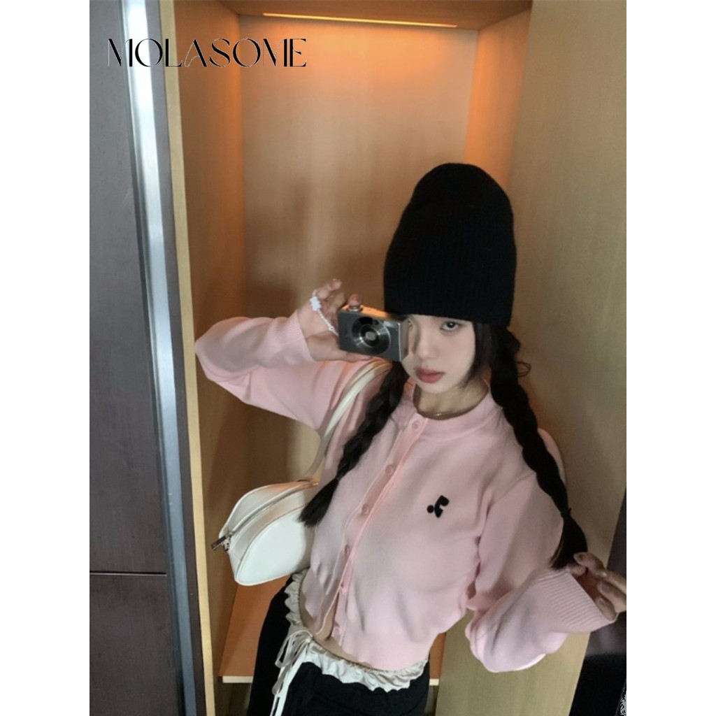 โมลาโซเมะ ผู้หญิงแฟชั่นใหม่สีทึบคอกลมแขนยาวถักเสื้อคาร์ดิแกนทุกการแข่งขัน