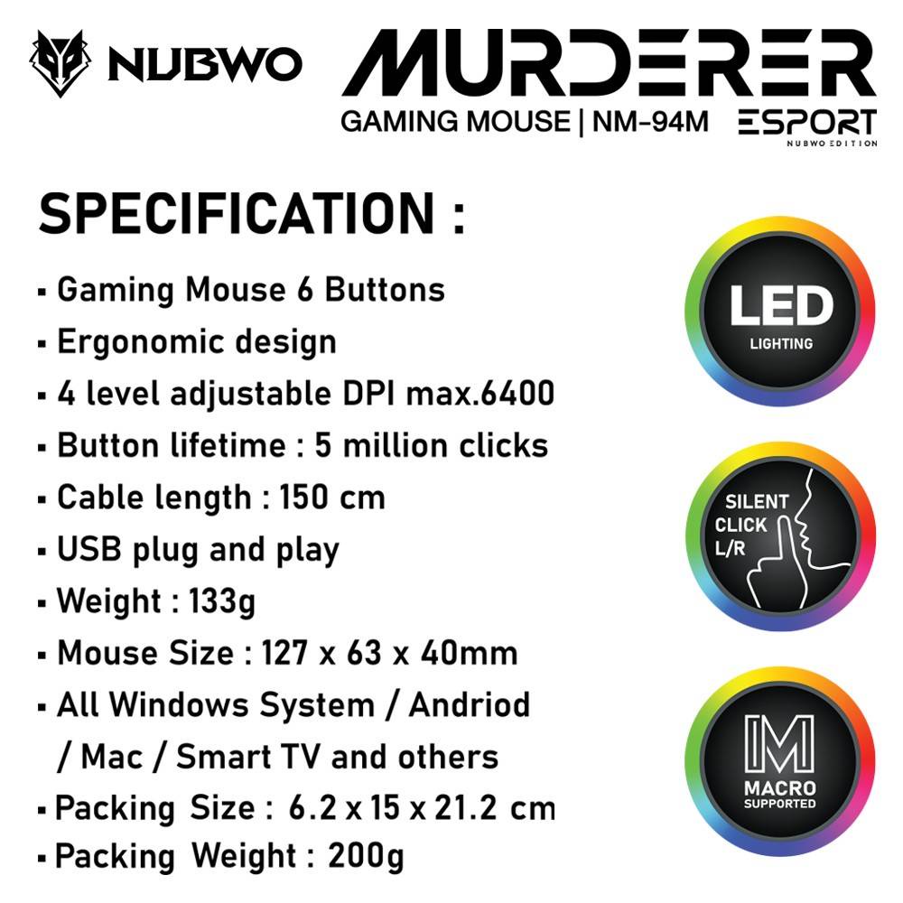 เสียงคลิกเงียบ ไฟสุดเท่ NUBWO NM-94MMURDERER GAMING✔แท้/ ตั้งมาโครได้