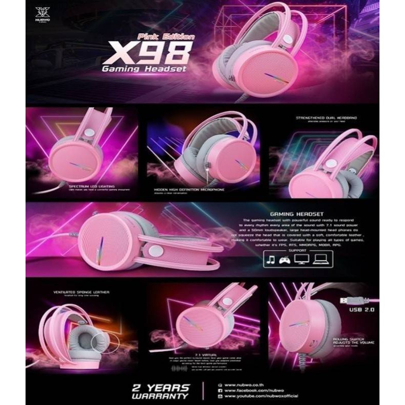Nubwo X98 Gaming Headset หูฟังเกมมิ่ง 7.1 ไฟ LED PINK ประกัน 1ปีศูนย์ไทย