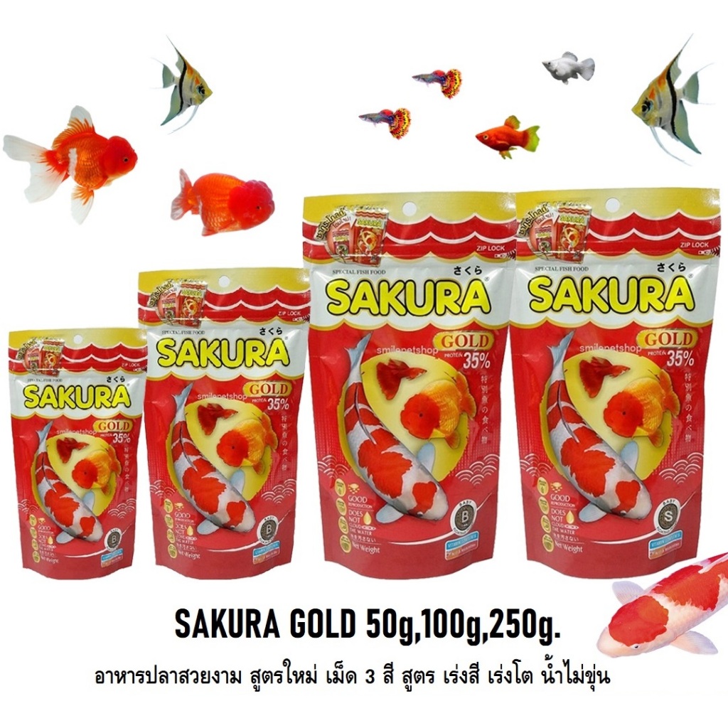 SAKURA GOLD 50g,100g,250g.(อาหารปลาสวยงาม สูตรใหม่ เม็ด 3 สี สูตร เร่งสี เร่งโต น้ำไม่ขุ่น)