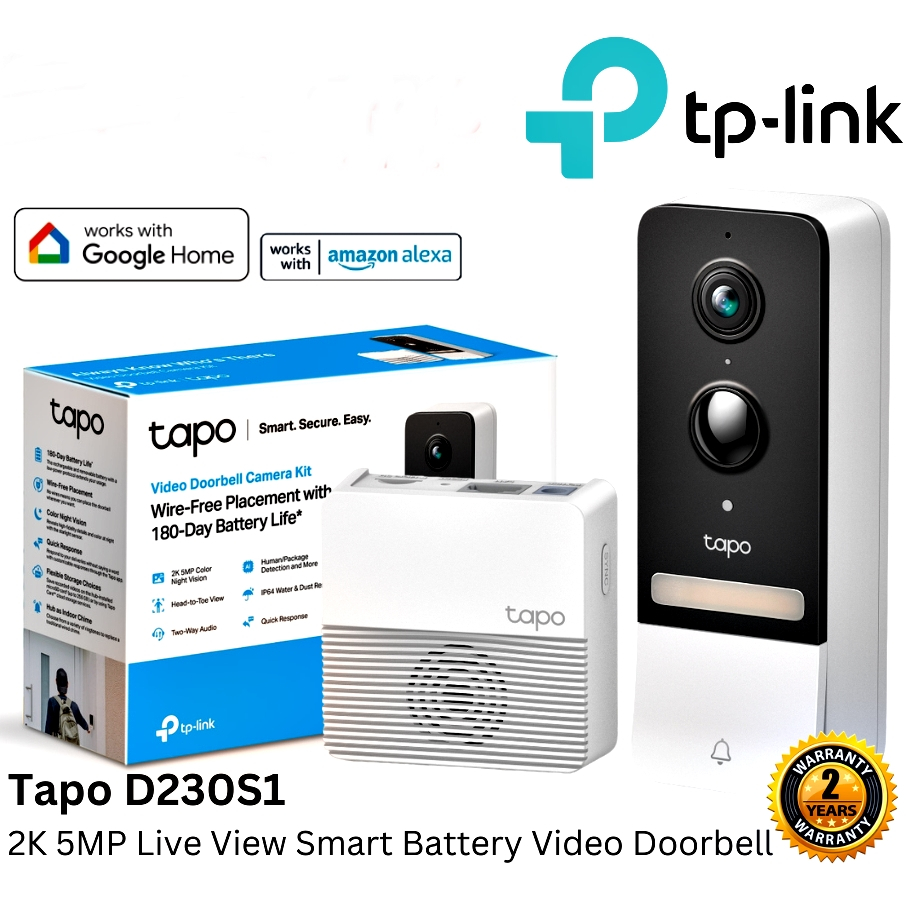 กริ่งประตูอัจฉริยะ TP-LINK (Tapo D230S1) Tapo Smart Battery Video Doorbell กล้องความละเอียด 2K 5MP ดูและโต้ตอบได้ทันที