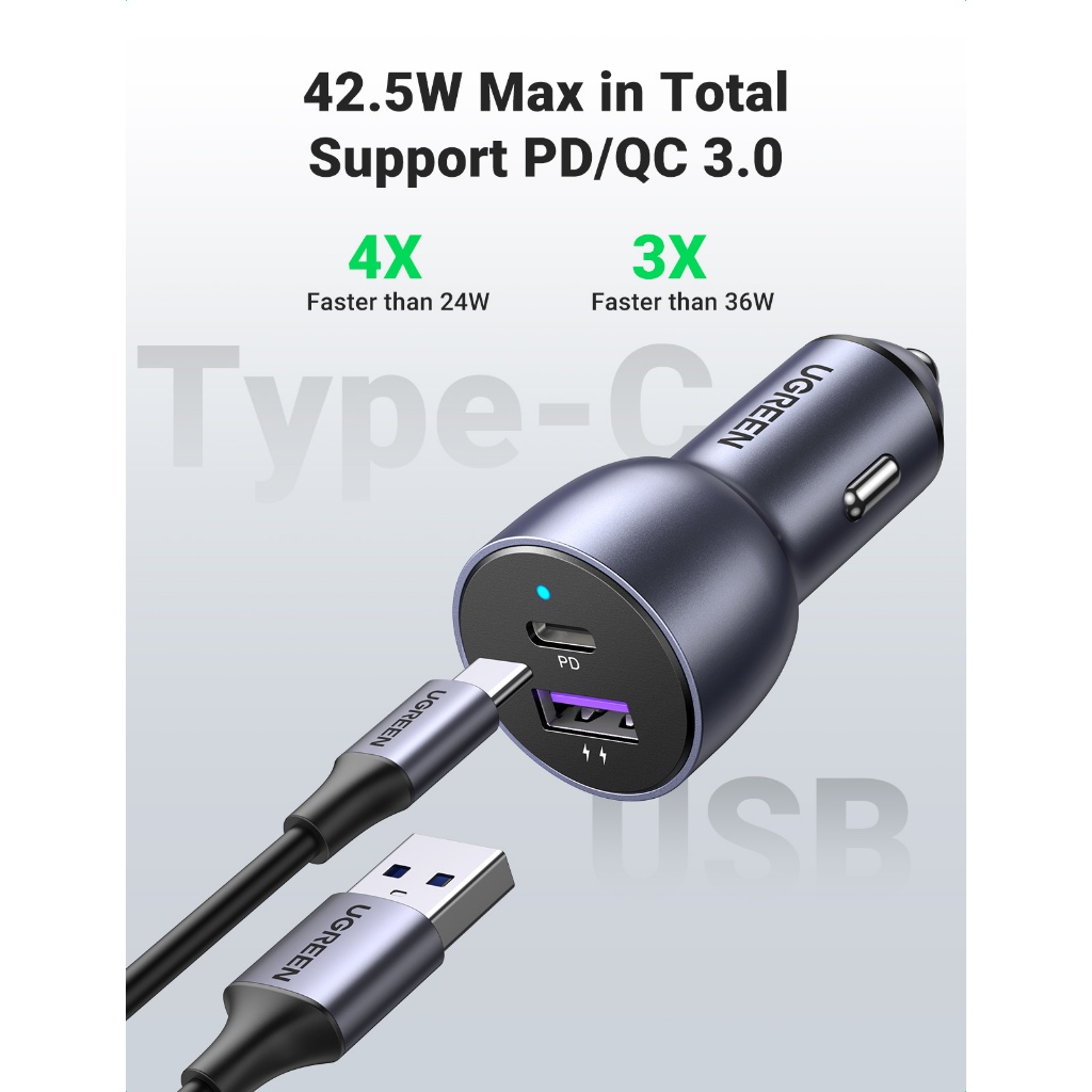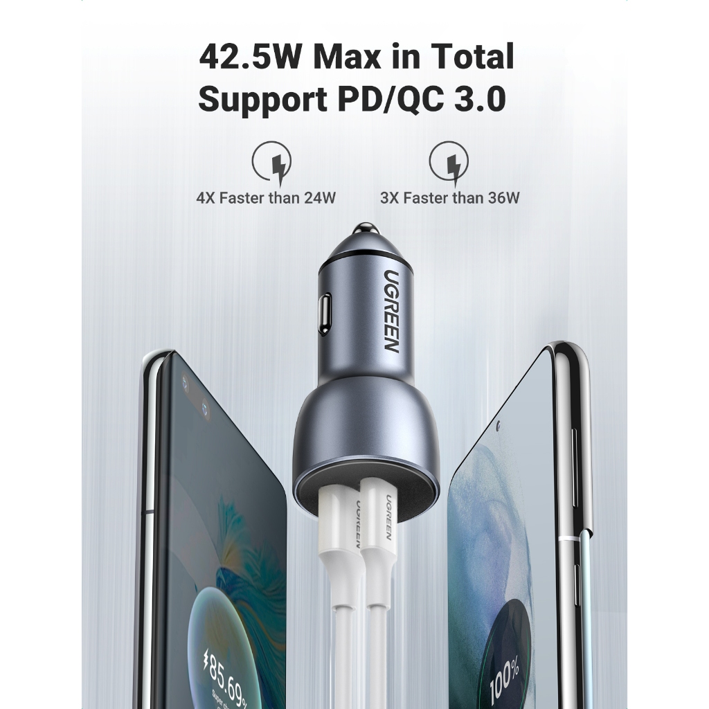 Ugreen ที่ชาร์จแบตในรถ USB C, 42.5W Type C Car Charger PD 30W&QC 18W, Fast Car Charger Adapter เข้ากันได้กับ iPhone 15/14/13/12/11, iPad Pro/Mini/Air, Galaxy S23/S22/S21/S20/S10/S10/S10/