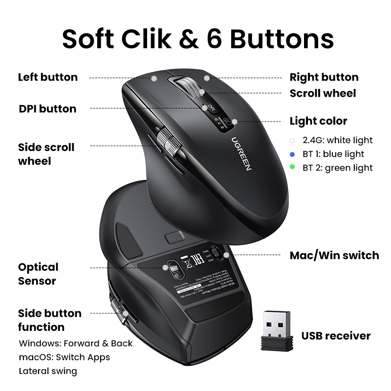 Ugreen Hyper-Fast Scroll เมาส์ไร้สายบลูทูธ 5.4 2.4G Ergonomic 5000DPI สําหรับ MacBook แท็บเล็ตแล็ปท็อปคอมพิวเตอร์ PC เม้าส์