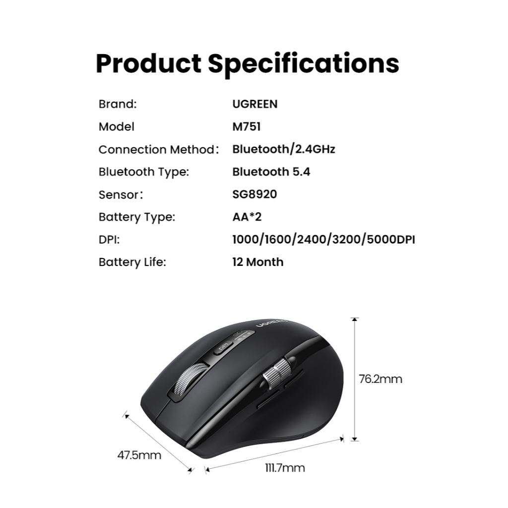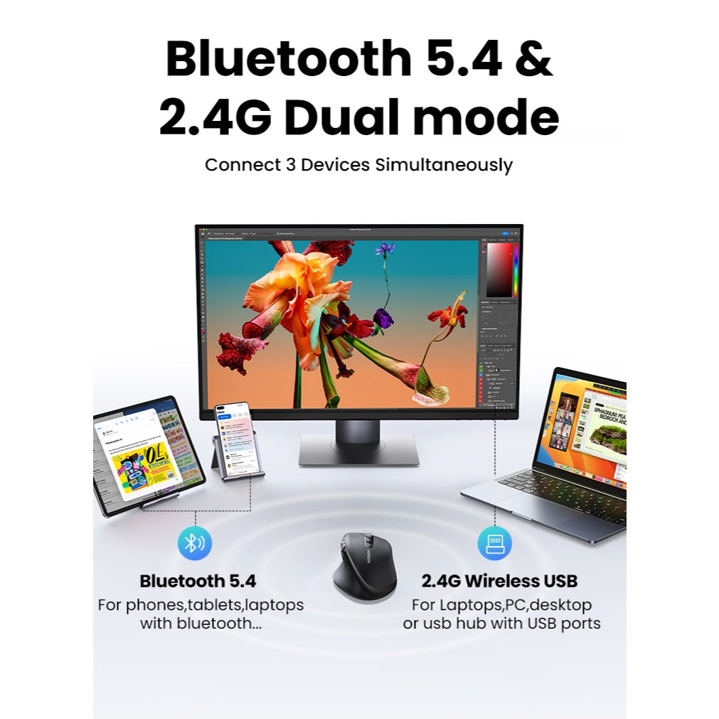 Ugreen Wireless Mouse เมาส์ไร้สายบลูทูธ 5.4 2.4G Ergonomic 5000DPI สําหรับ แท็บเล็ตแล็ปท็อปคอมพิวเตอร์ รุ่น 45792