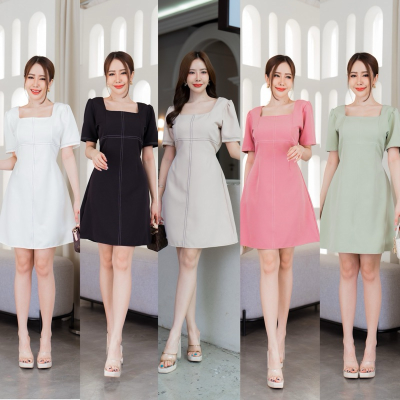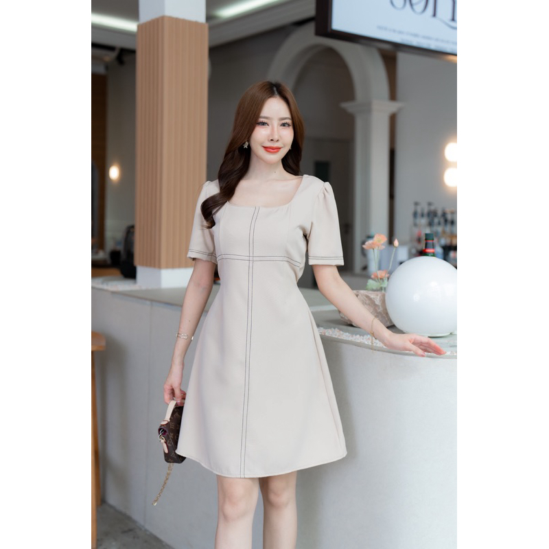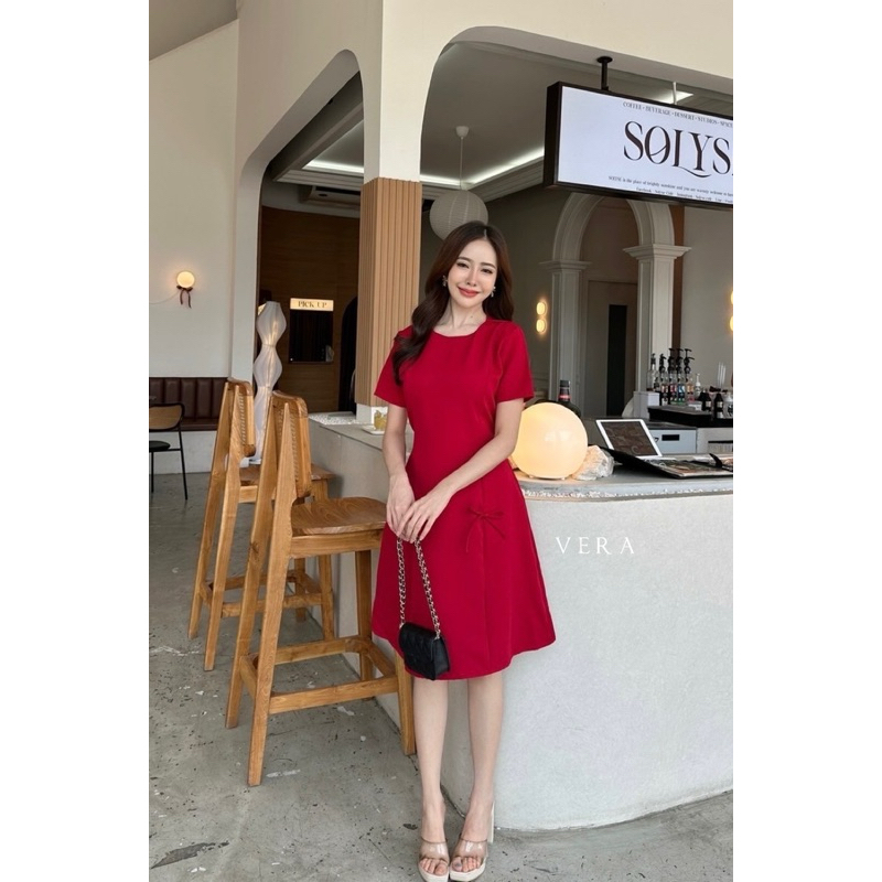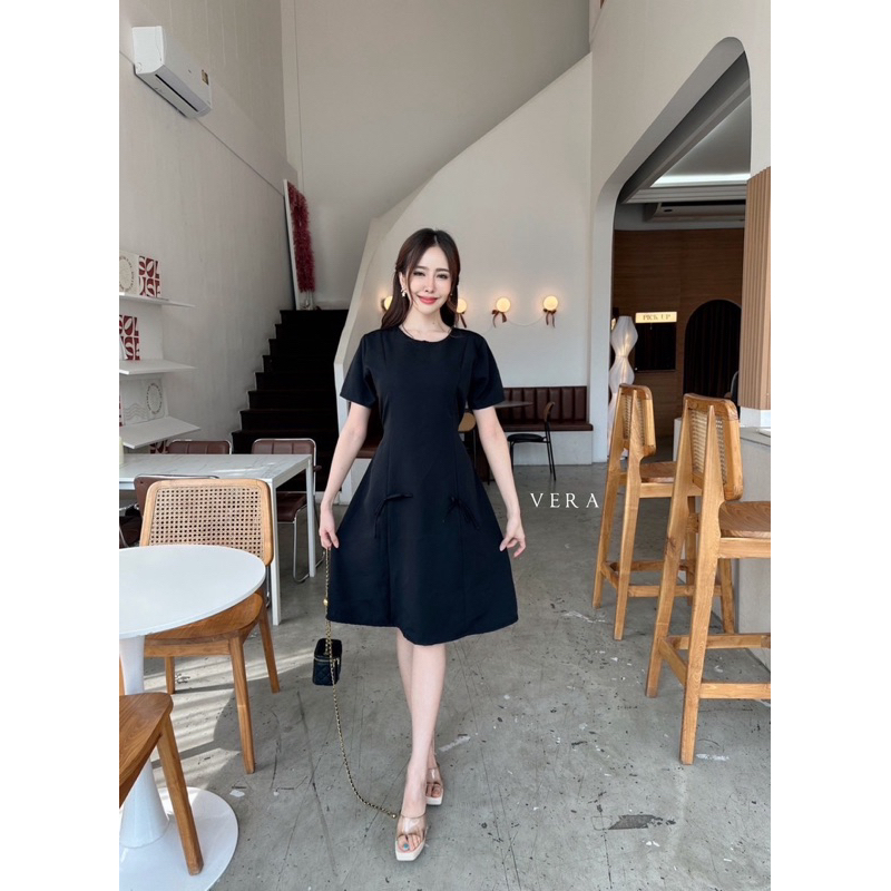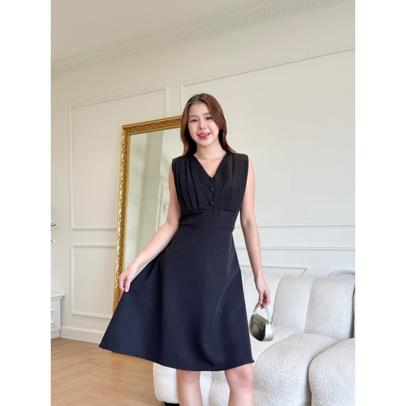 Classic Dress เดรสแฟชั่น เดรสออกงานเเขนกุดเเต่งจีบไหล่ แต่งกระดุมปั๊ม3เม็ด ป้าย VERA