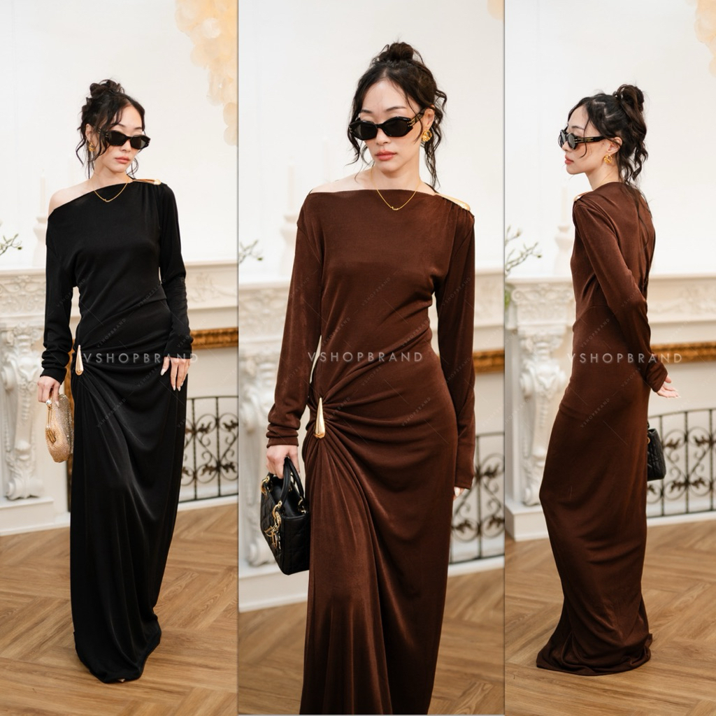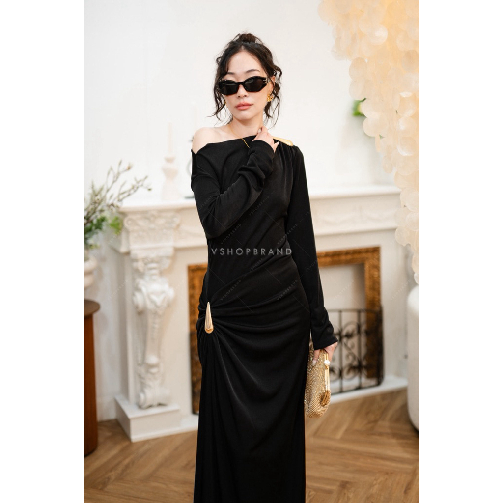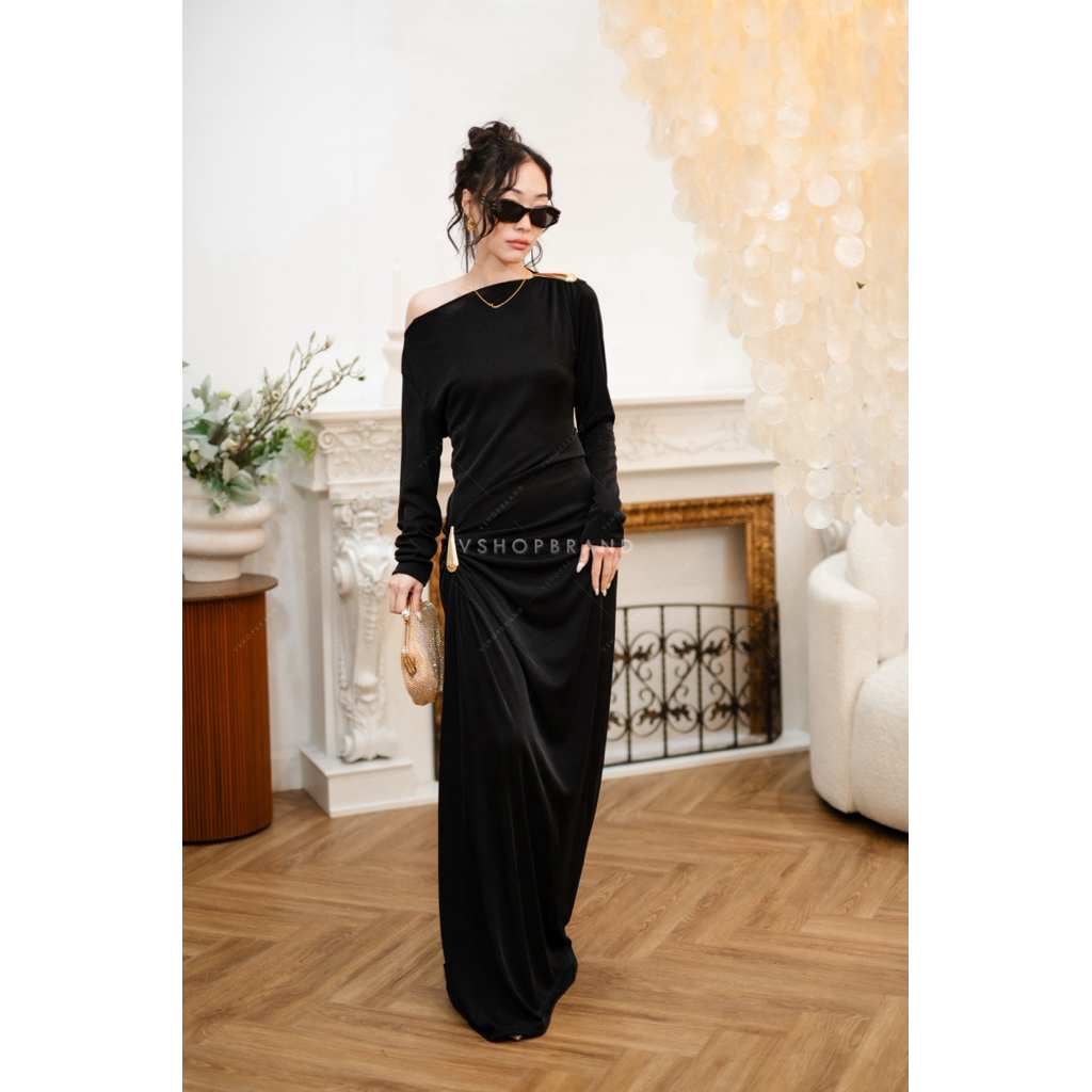 พร้อมส่ง ชุดออกงาน Maxi เดรสแขนกุดกลิตเตอร์ชายฟรุ้งฟริ้ง งานป้าย vshopbrand
