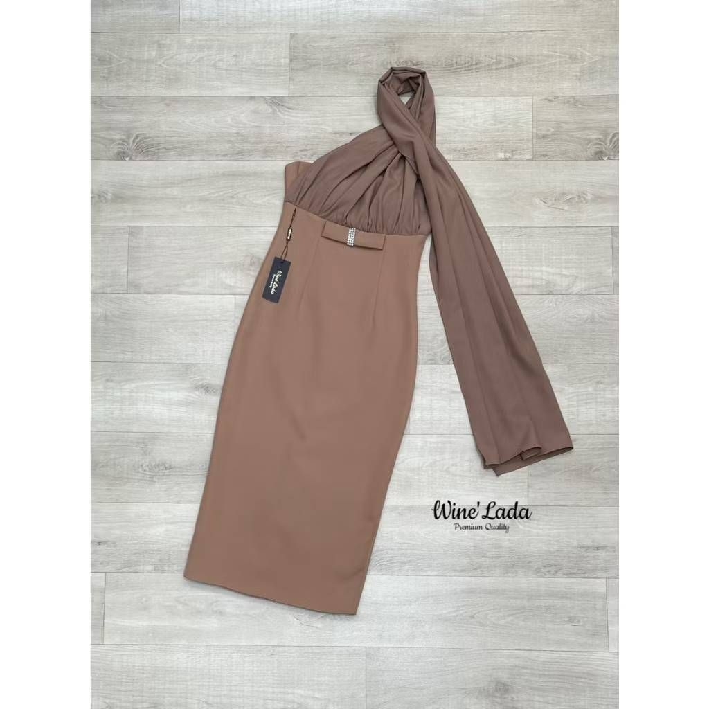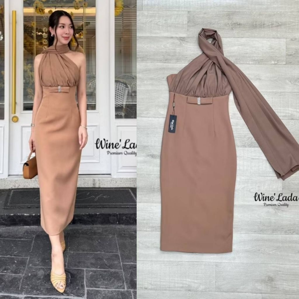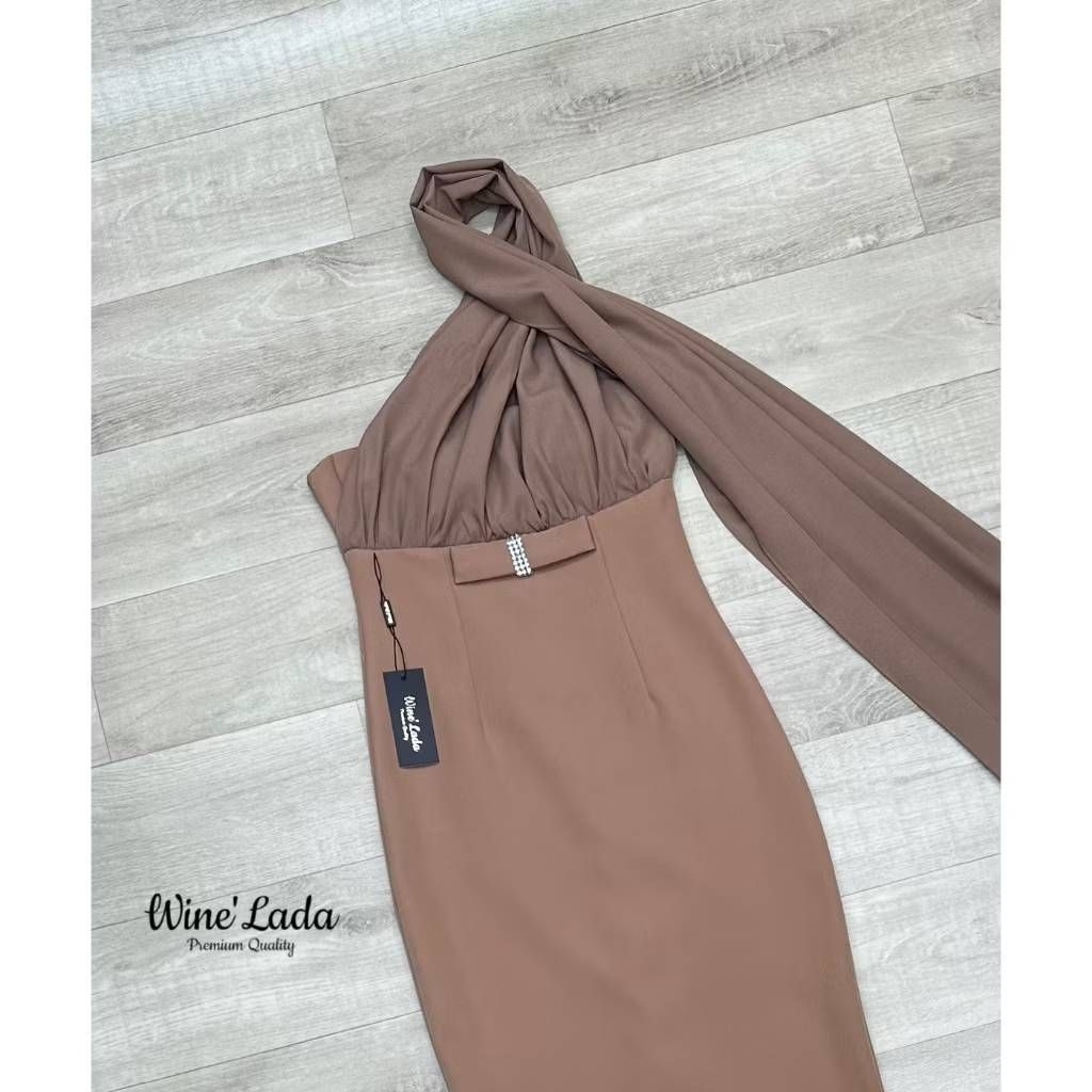 S M L XL มือ1 WINE LADA เดรสเกาะอกใส่ออกงานสีน้ำตาล แต่งสไบคล้องคอไปด้านหลัง ใส่สวยผู้ดีสุดๆ ป้าย WINE LADA