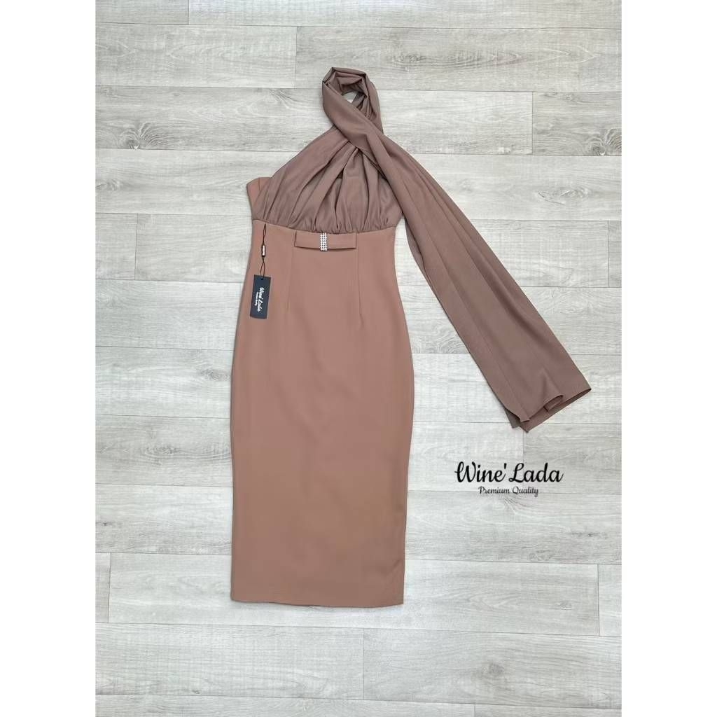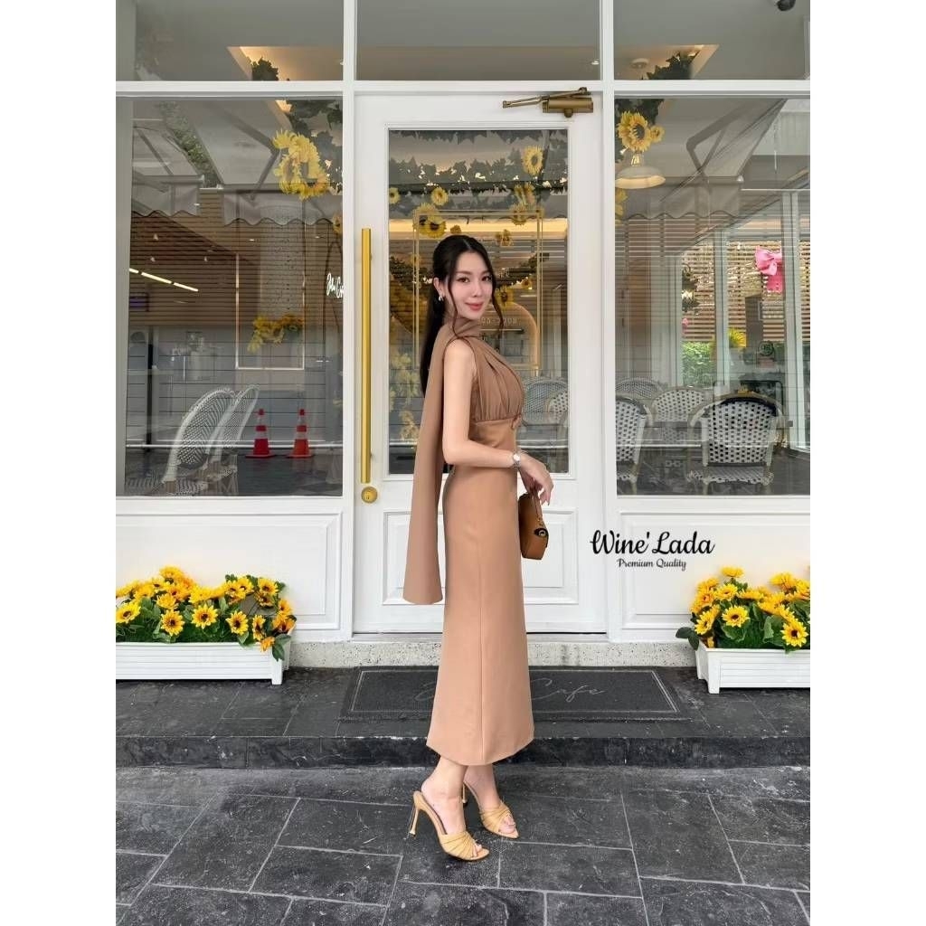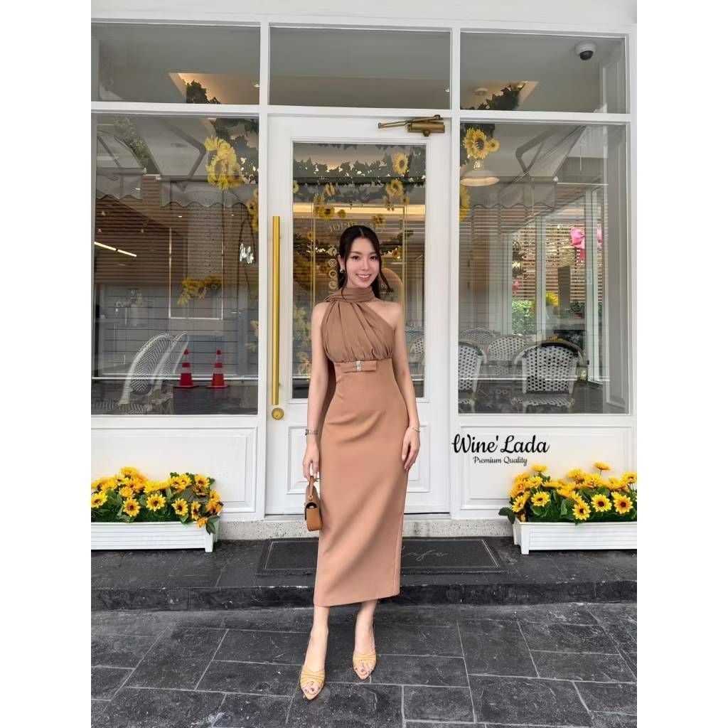 S M L XL มือ1 WINE LADA เดรสเกาะอกใส่ออกงานสีน้ำตาล แต่งสไบคล้องคอไปด้านหลัง ใส่สวยผู้ดีสุดๆ ป้าย WINE LADA