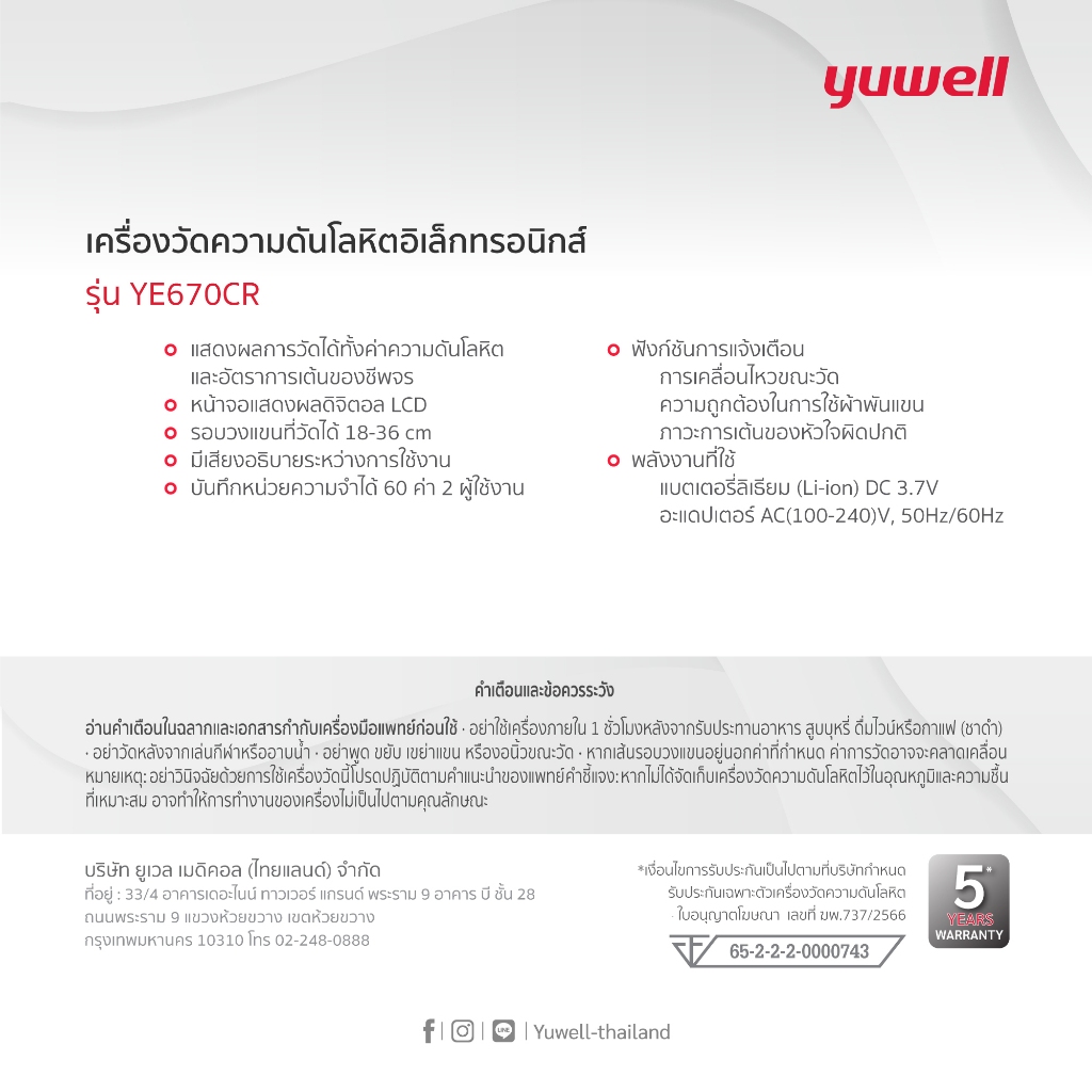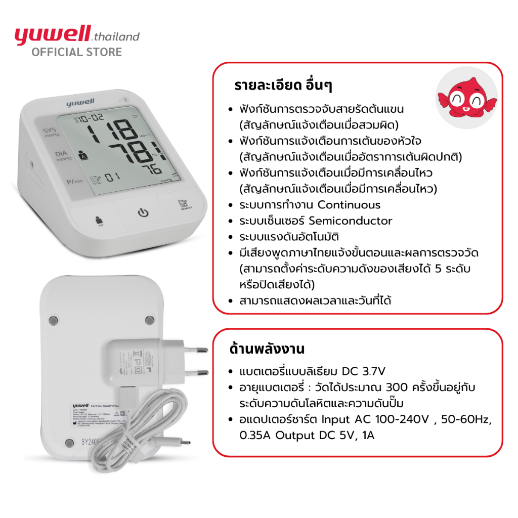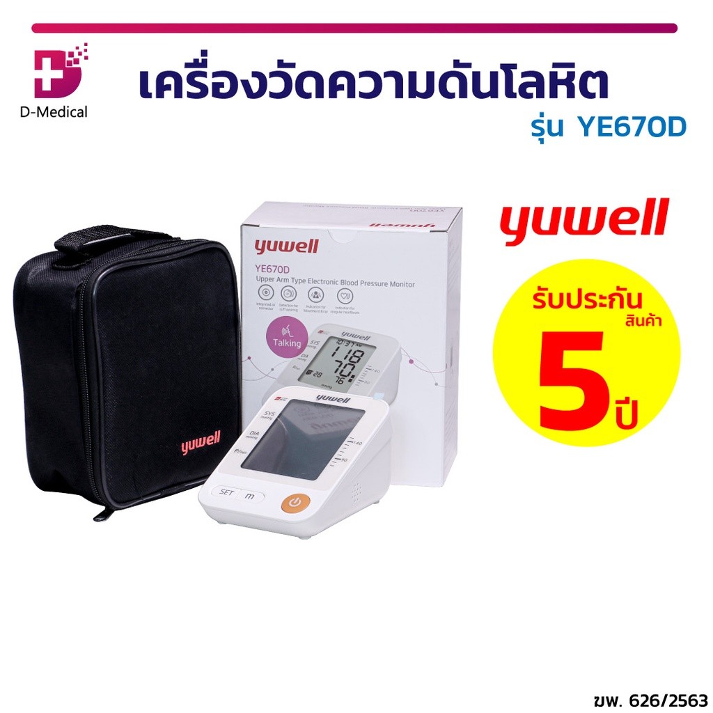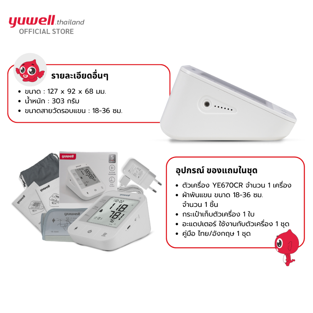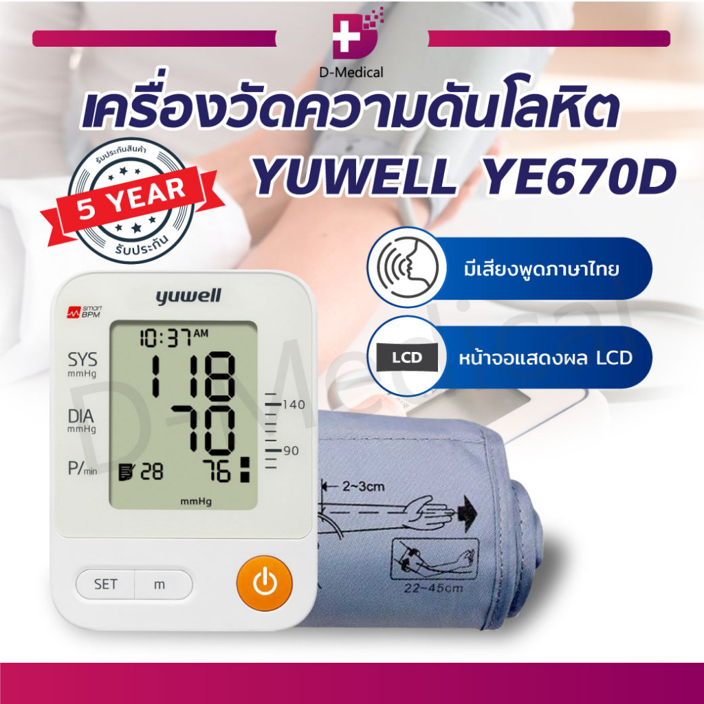 เครื่องวัดความดันโลหิต Yuwell รุ่น YE670CR (มีเสียงพูดไทยแบบชาร์ตแบตเตอรี่ในตัว) ประกันศูนย์ไทย 5 ปี