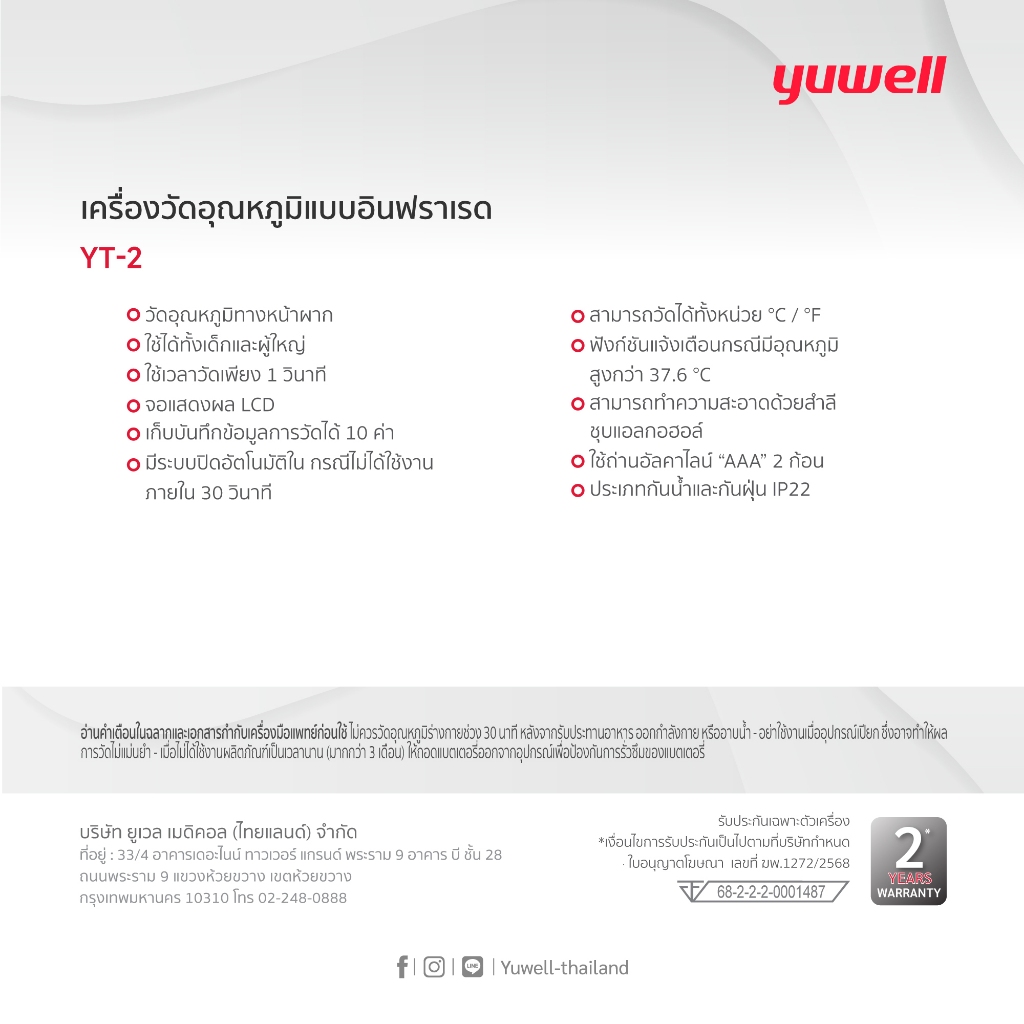 เครื่องวัดอุณหภูมิร่างกายอินฟราเรด YUWELL รุ่น YT-2