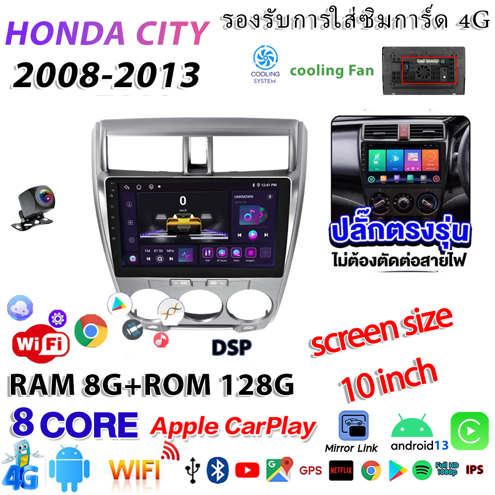 WG 🚘 8Core 8+128G พัดลมในตัว 10นิ้ว จอแอนดรอยด์ติดรถยนต์ HONDA CITY 2008-2013 Android13 CarPlay GPS WiFi BT 360°/4G SIM