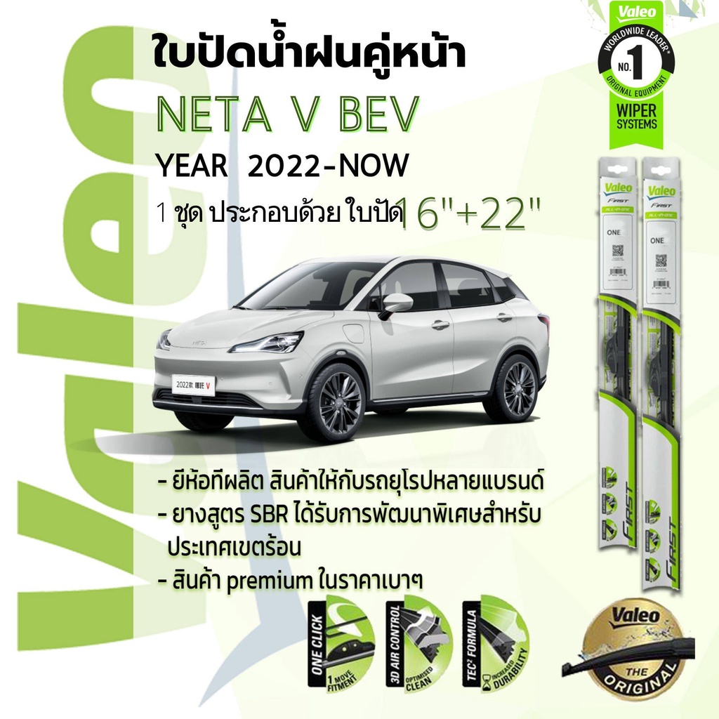 ใบปัดน้ำฝน คู่หน้า VALEO FIRST frameless รุ่นตะขอ ก้านอ่อน สำหรับรถ NETA V BEV ขนาด 16”+22” ปี 2022-NOW