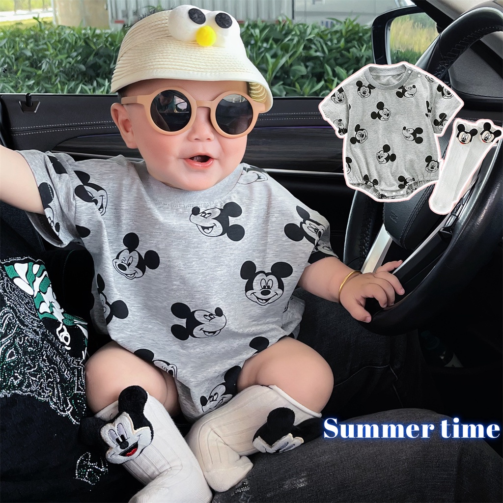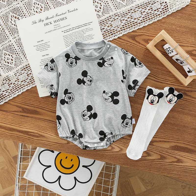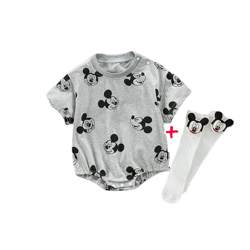 Ins ฤดูร้อน ใหม่ เด็กผู้ชาย เด็กผู้หญิง แขนสั้น บอดี้สูท + ถุงเท้า 0-24 เดือน ผ้าฝ้าย เด็กทารก การ์ตูน รอมเปอร์ สไตล์เกาหลี
