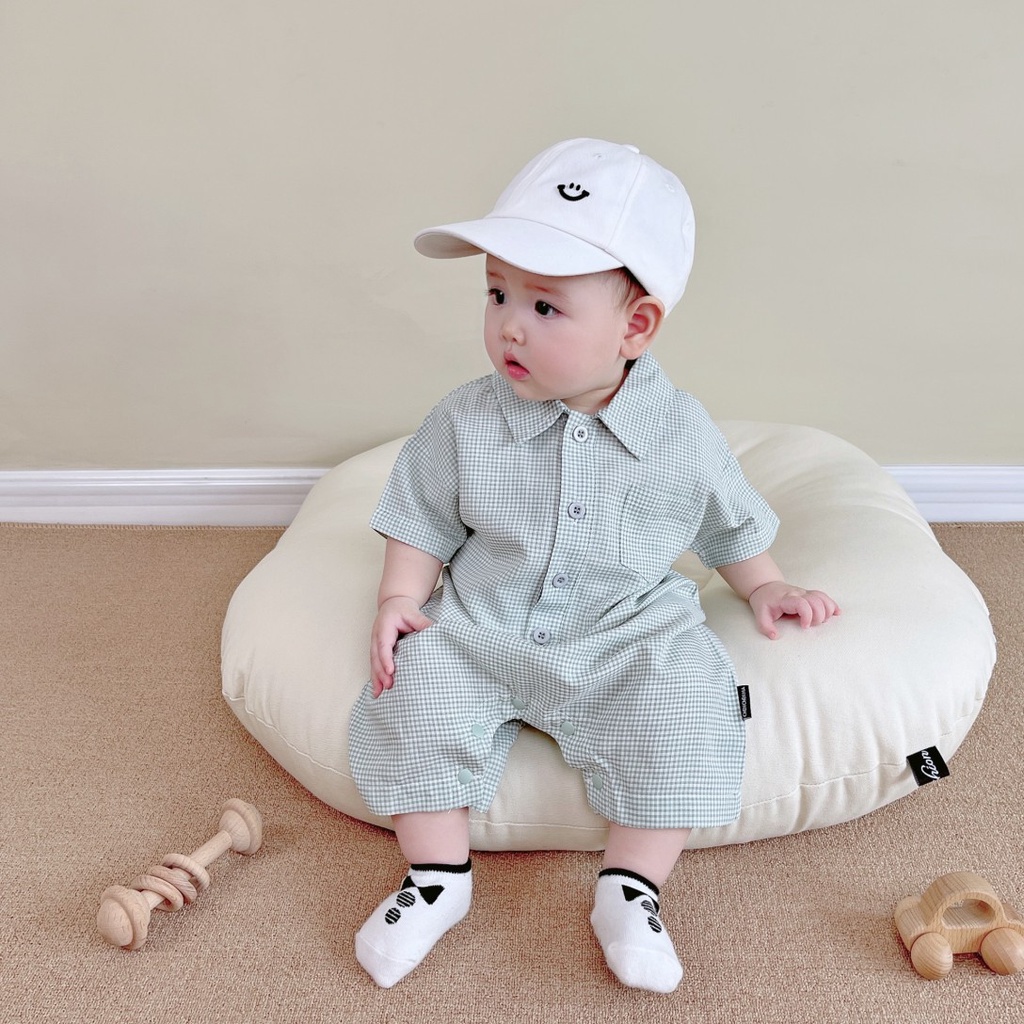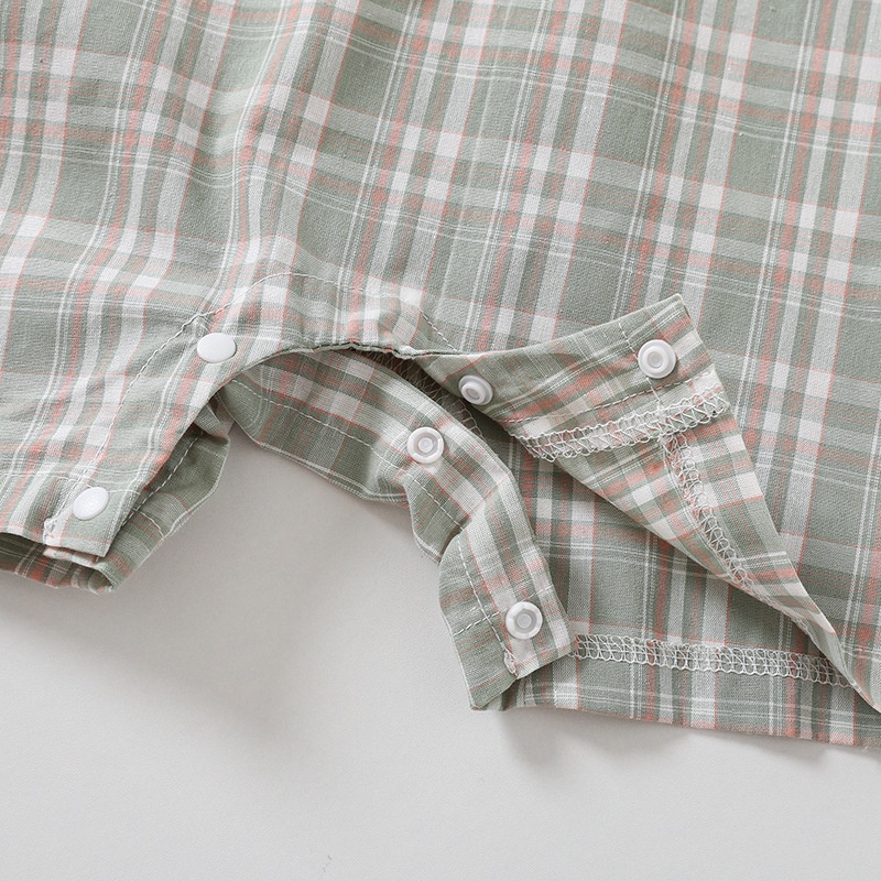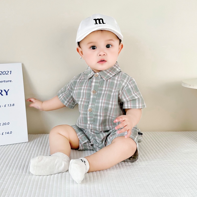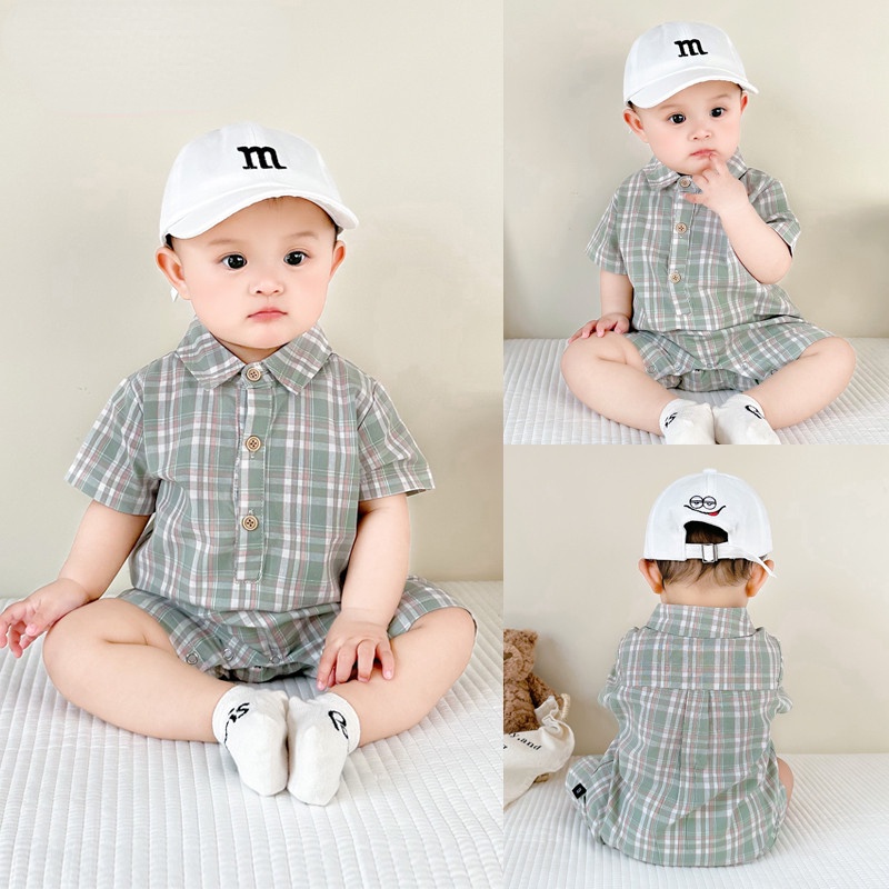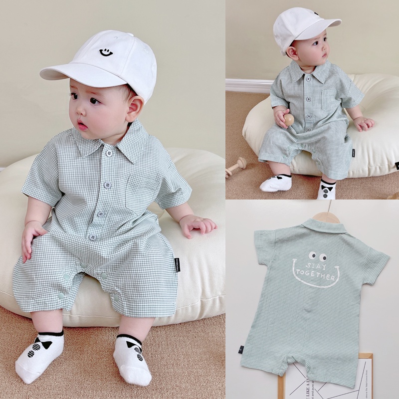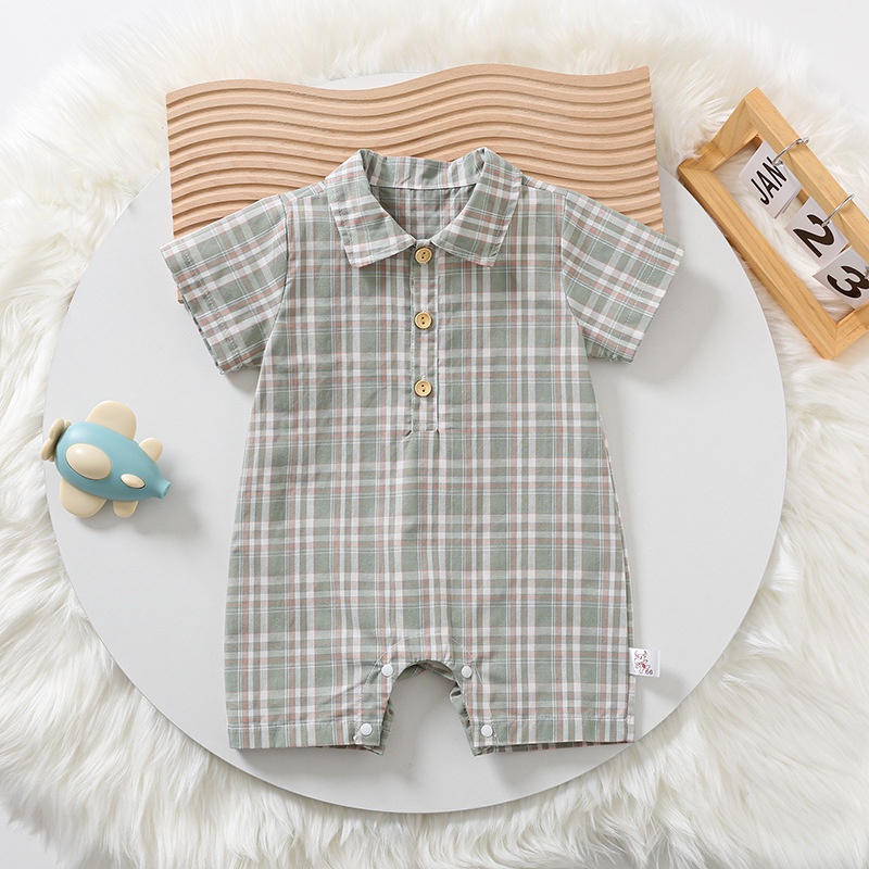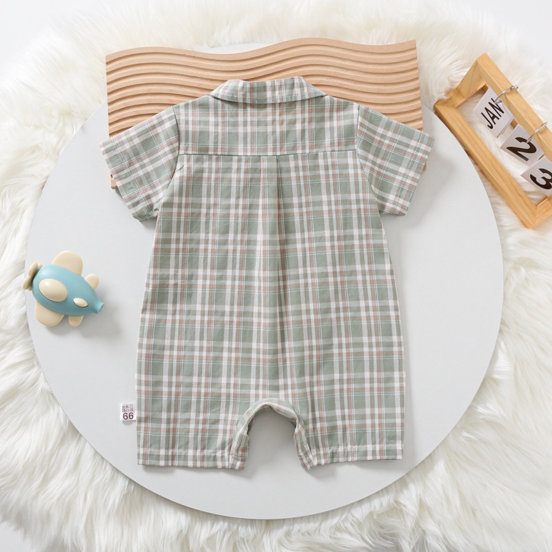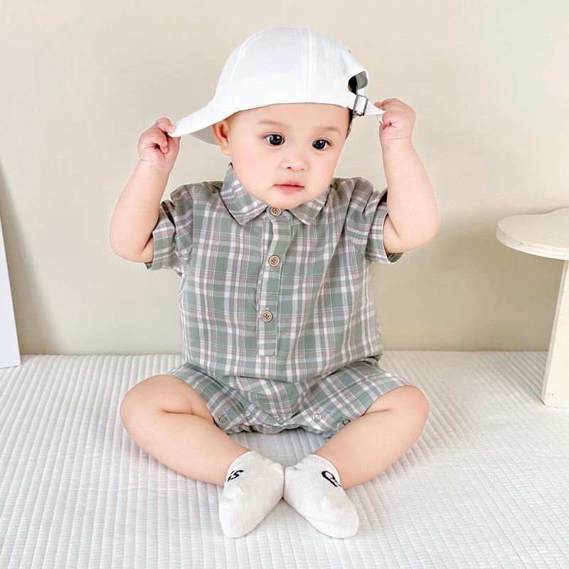 Ins ฤดูร้อน ใหม่ เด็กผู้ชาย และเด็กผู้หญิง แขนสั้น ลายตารางหมากรุก บอดี้สูท 0-18 เดือน ทารกแรกเกิด ผ้าฝ้าย แบบบาง สไตล์อังกฤษ ชุดรอมเปอร์