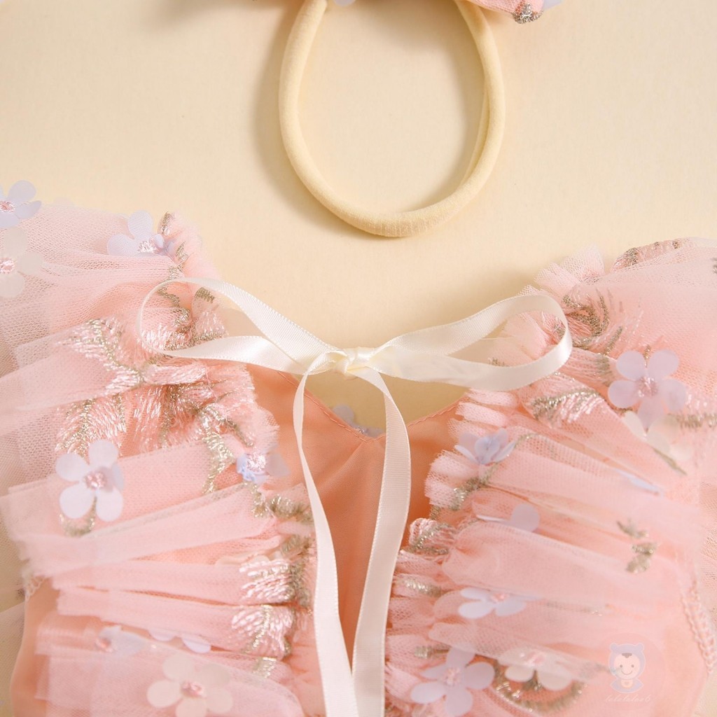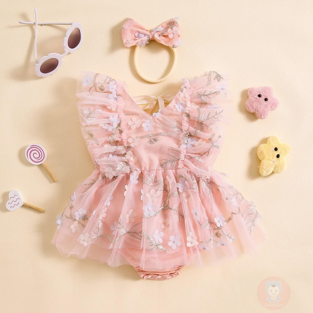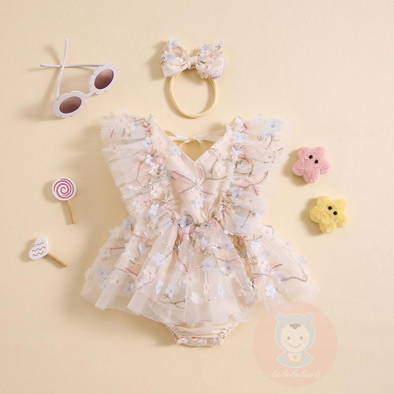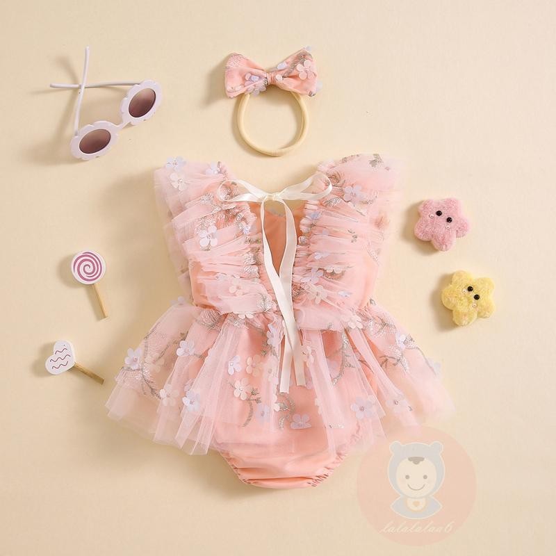 Laa6-เด็กทารกดอกไม้ปักบินแขนตาข่าย Hem ฤดูร้อน Romper พร้อมแถบคาดศีรษะ
