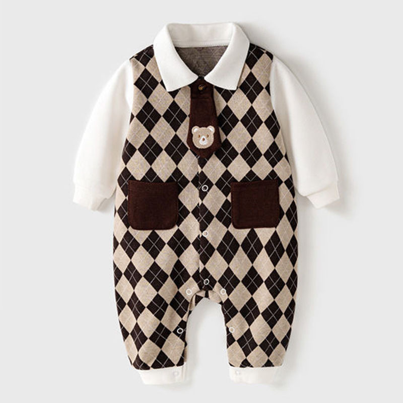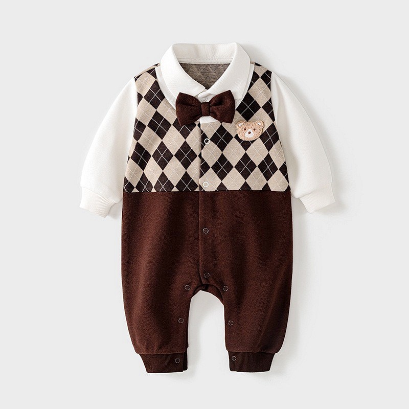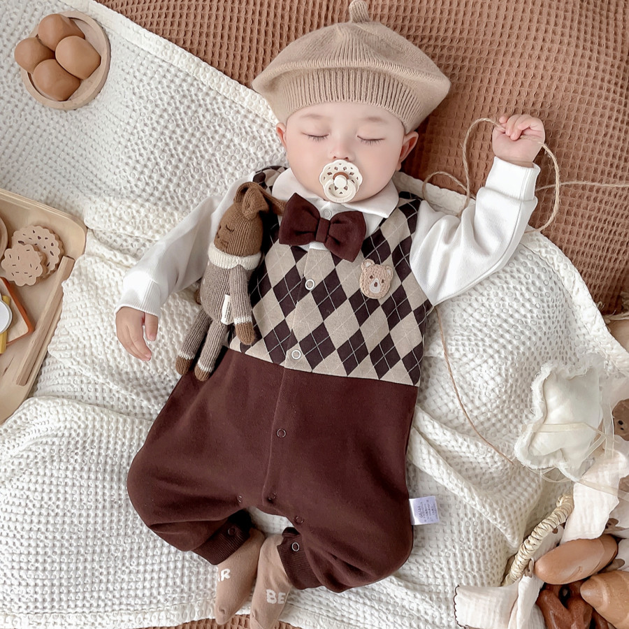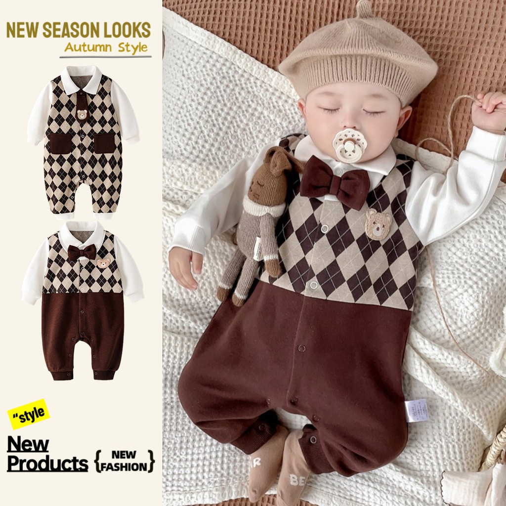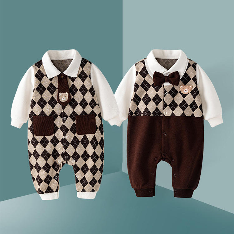 ฤดูใบไม้ผลิและฤดูใบไม้ร่วงใหม่เสื้อผ้าเด็กชายหญิงแขนยาวบอดี้สูทเด็กโปโลผูกสไตล์สุภาพบุรุษสุดหล่อ รูปสี่เหลี่ยมขนมเปียกปูน ออกแบบ ชุด