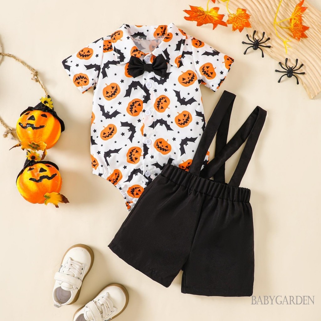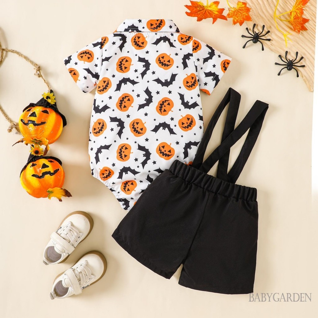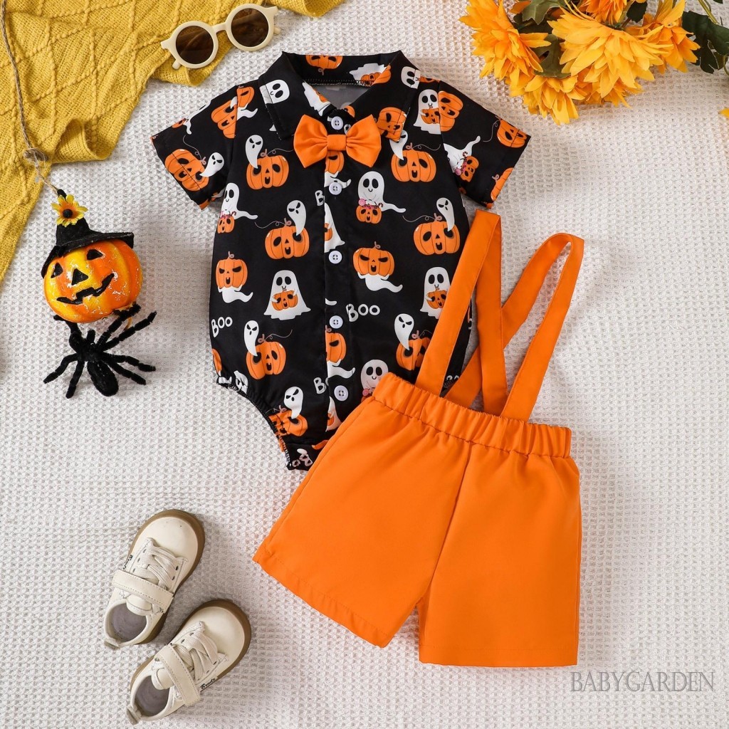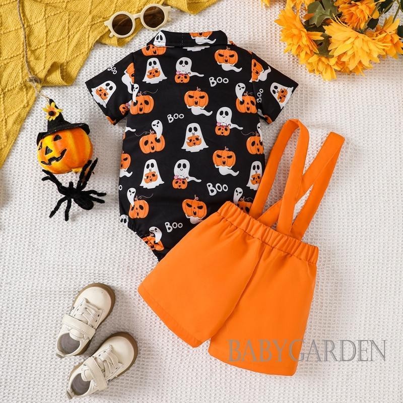 Baga-3-24months เด็กทารกฮาโลวีนชุดฟักทองพิมพ์แขนสั้นปุ่มลง Romper พร้อมกางเกงขาสั้นแขวนแข็ง 2 ชิ้นชุด