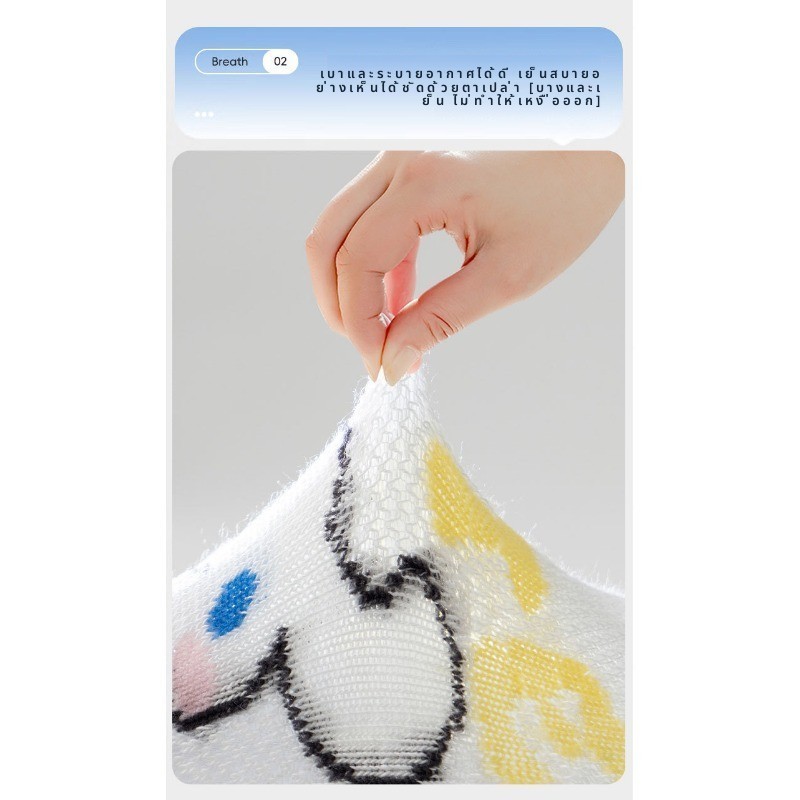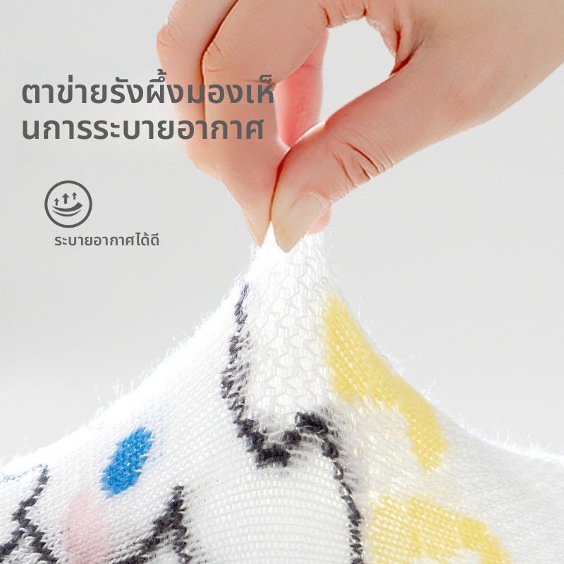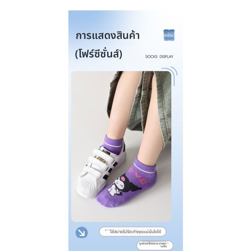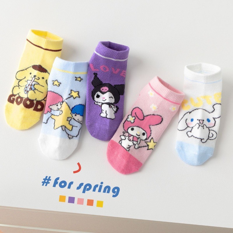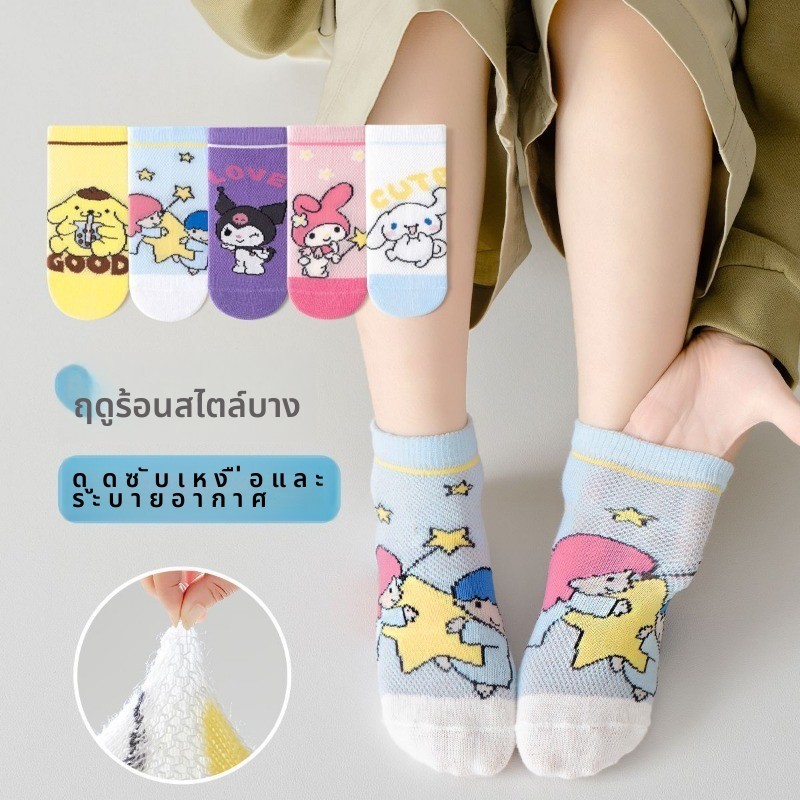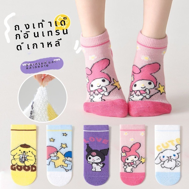 [5 คู่] ถุงเท้าเด็กผู้หญิง ซานริโอ ชุด ฤดูใบไม้ผลิฤดูร้อนการ์ตูนน่ารักตาข่ายระบายอากาศผ้าฝ้ายหลอดสั้น
