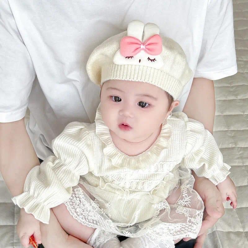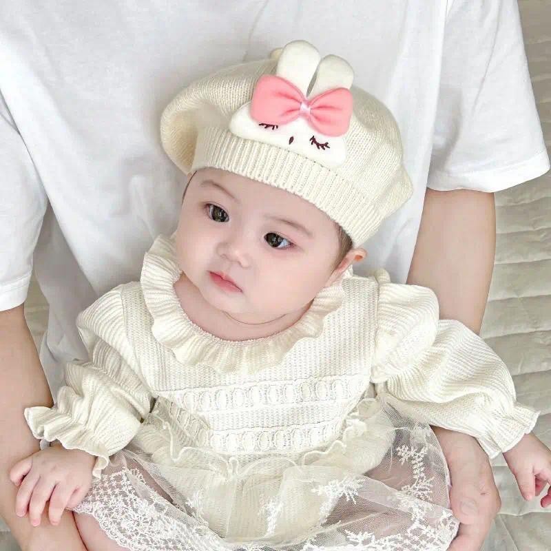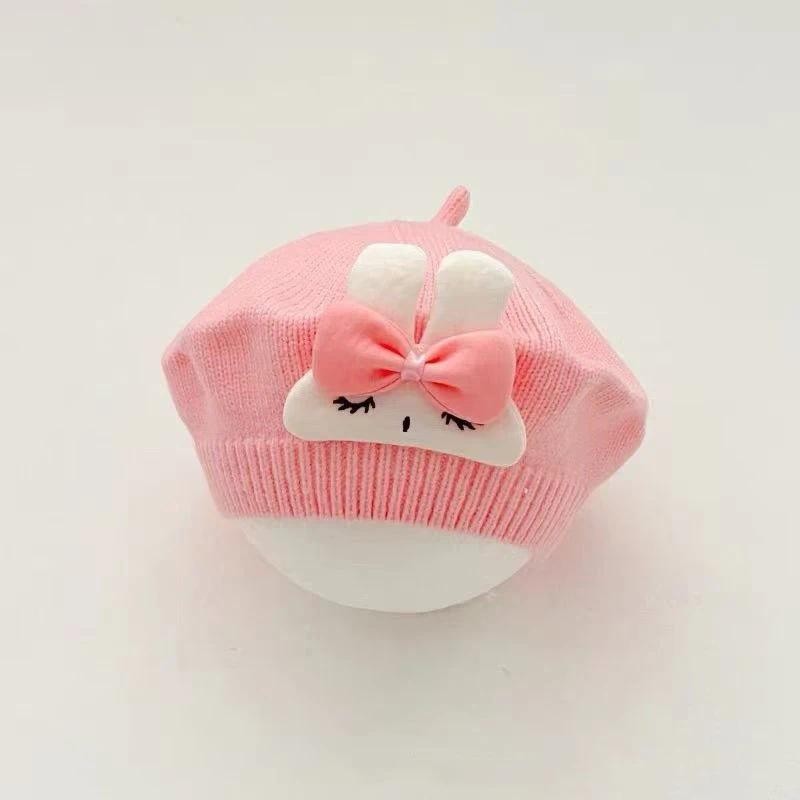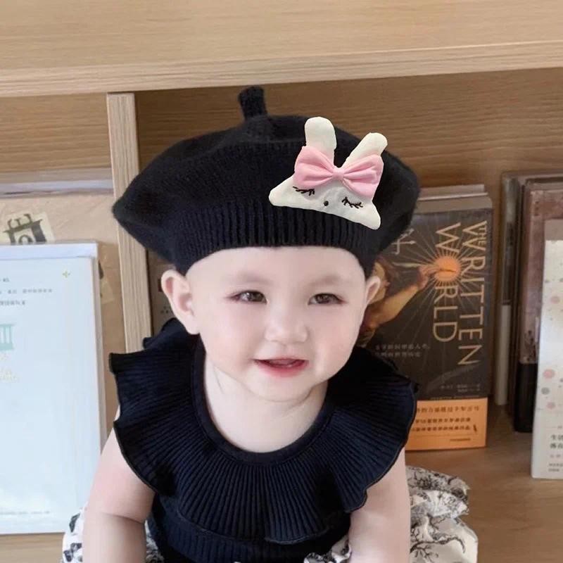 กระต่ายน่ารักหมวกเบเร่ต์เด็กเจ้าหญิงสาวเกาหลีถักหมวกอบอุ่นสําหรับเด็กวัยหัดเดินกลางแจ้ง กันลม สตรีทแวร์ ศิลปินจิตรกรหมวก