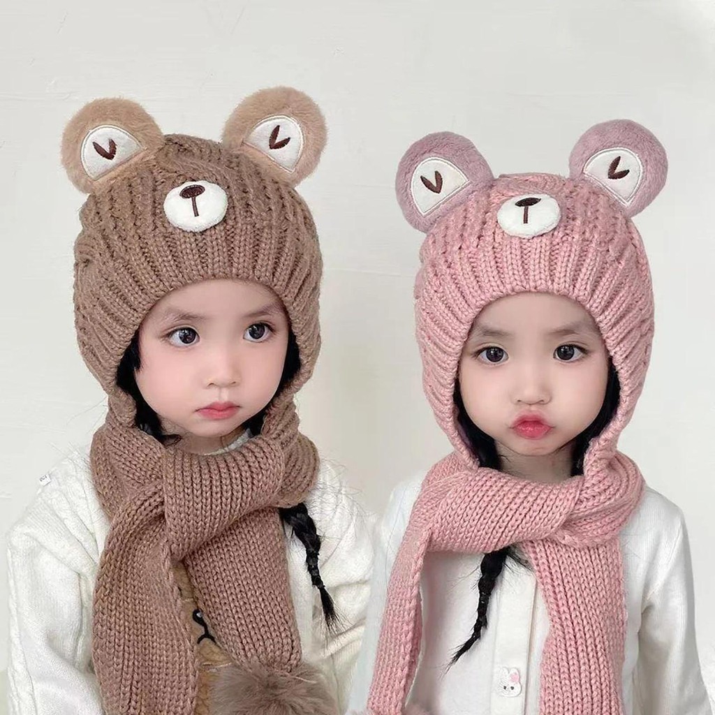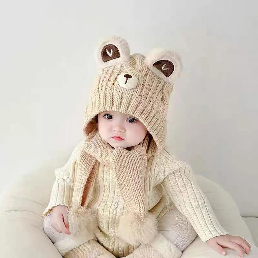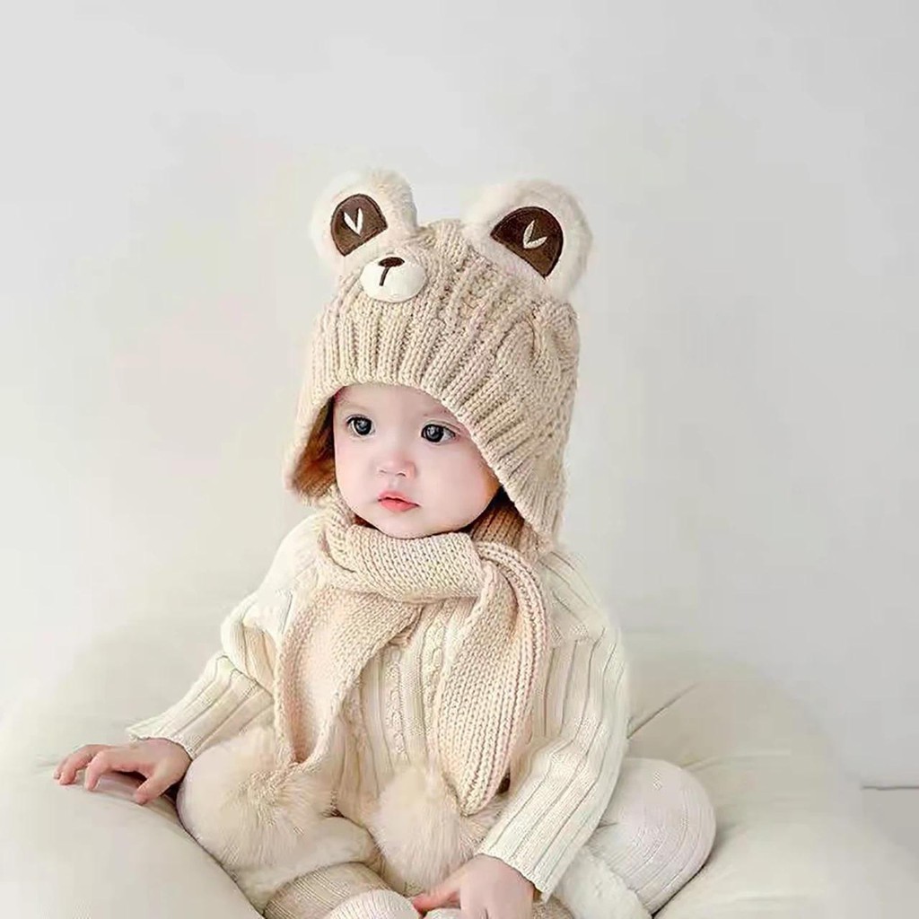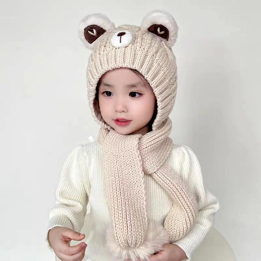 หมวกถักลายการ์ตูนหมีและผ้าพันคออุ่นสำหรับเด็กวัยหัดเดินในฤดูหนาว