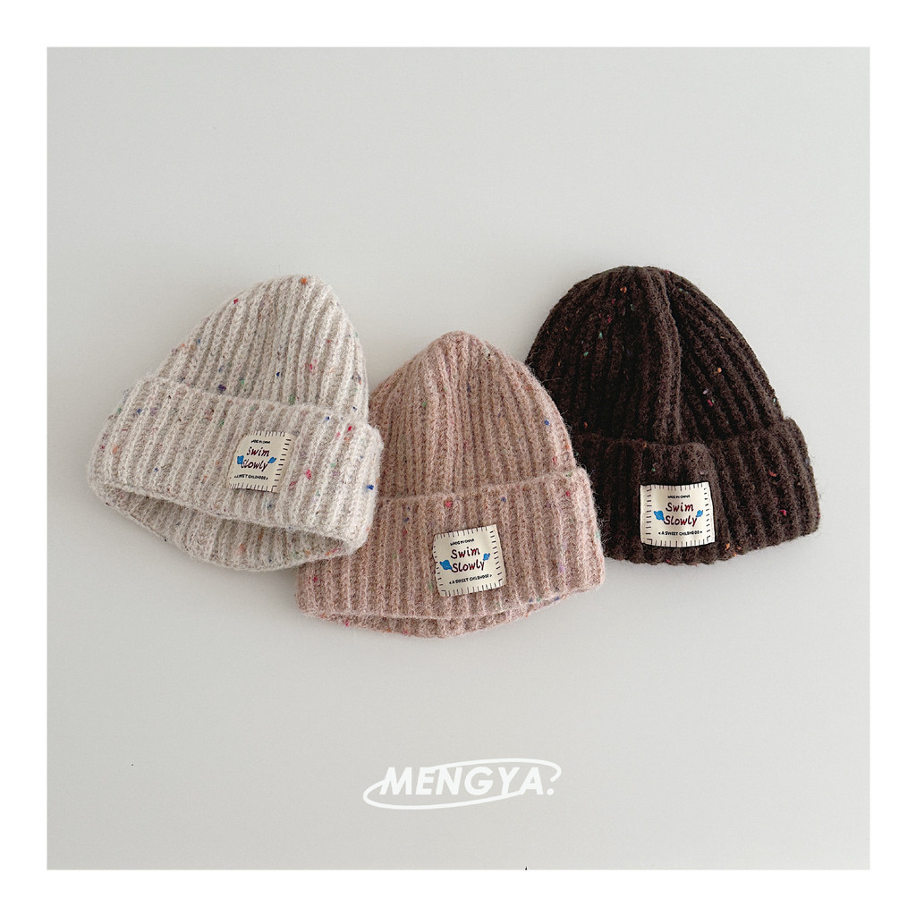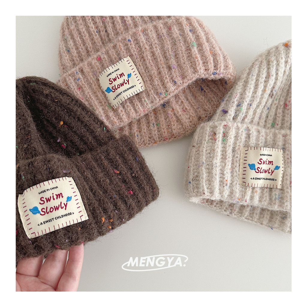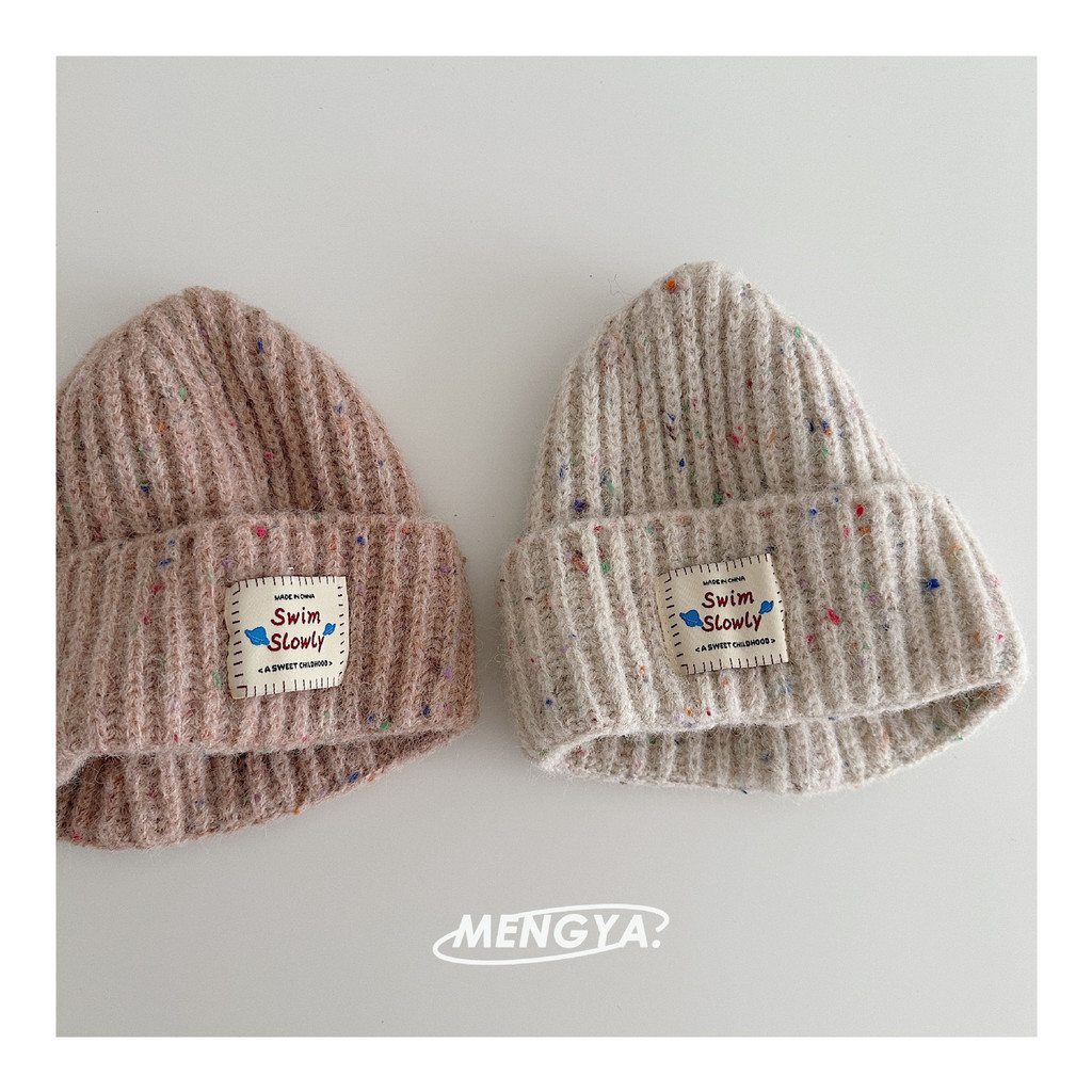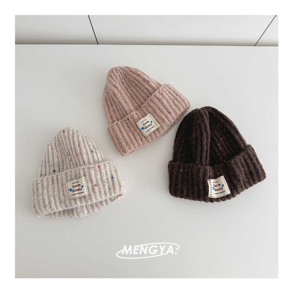 หมวกถักไหมพรมเด็ก สไตล์เกาหลี ป้ายหนังลายจุดสีสัน กันลมกันหนาว