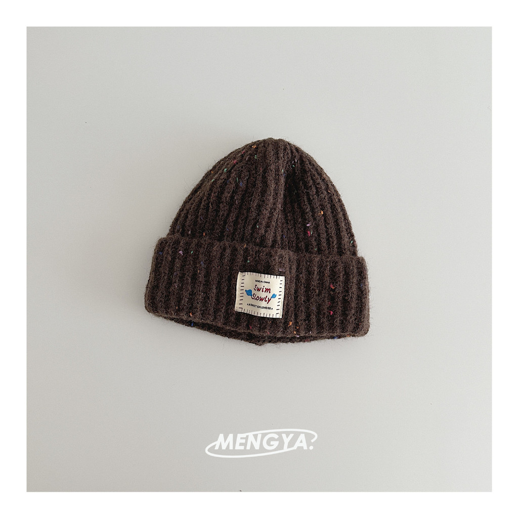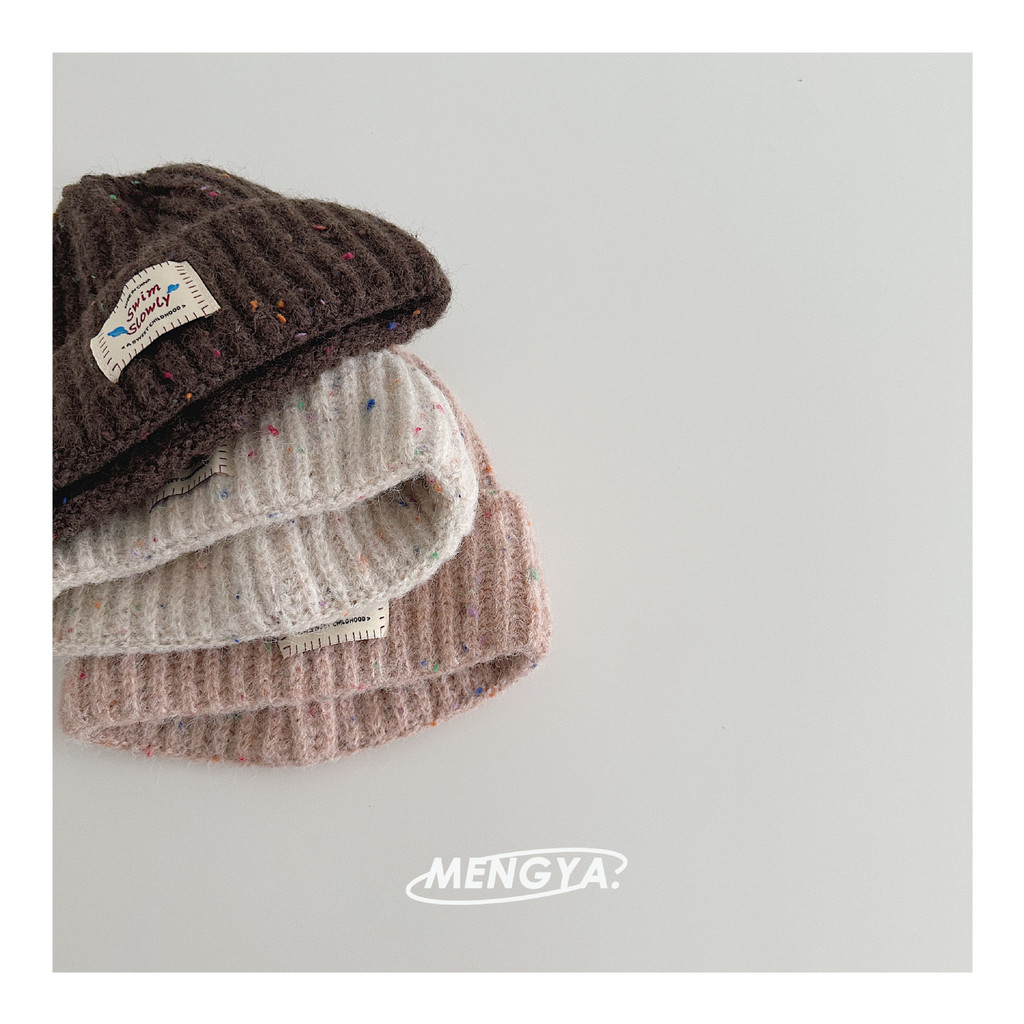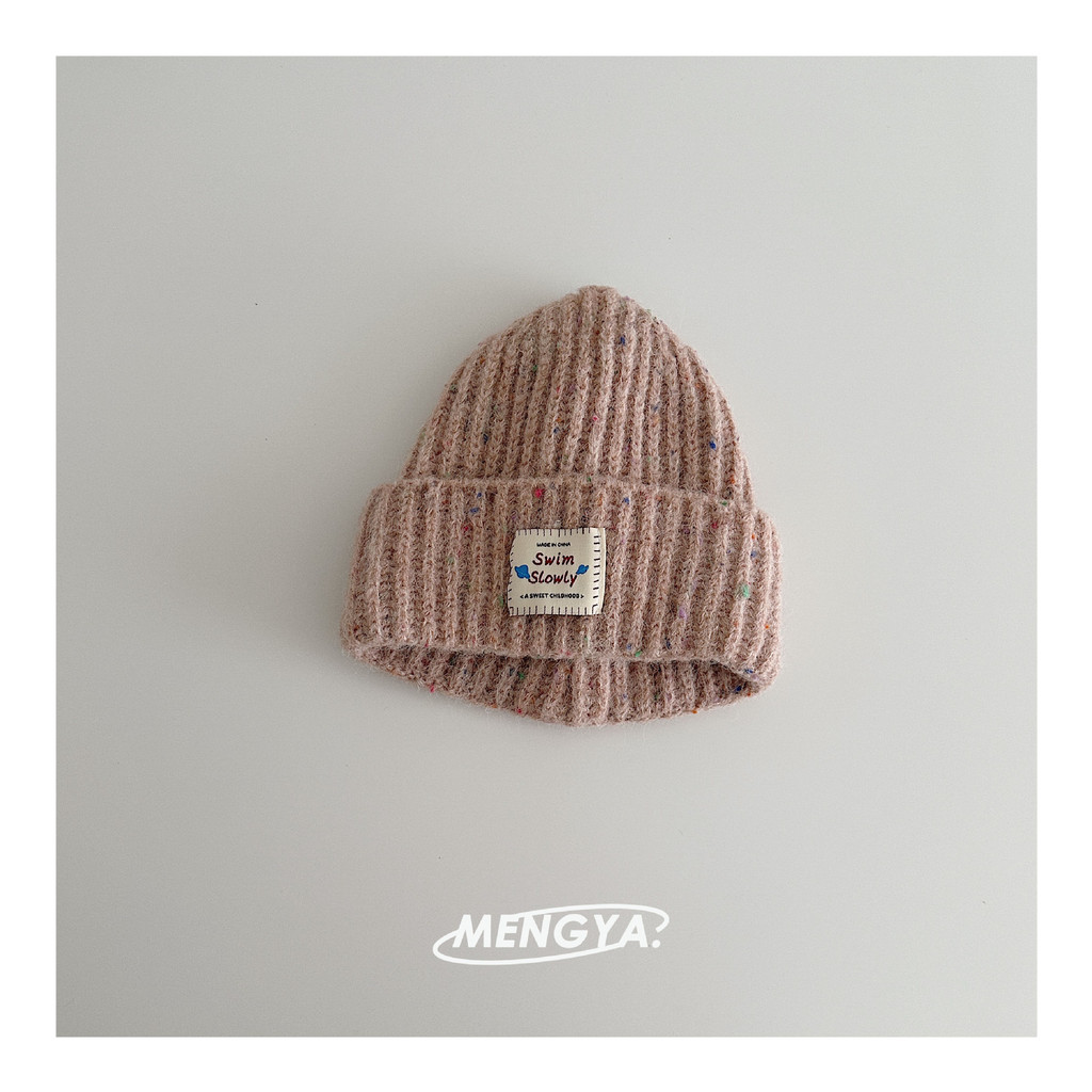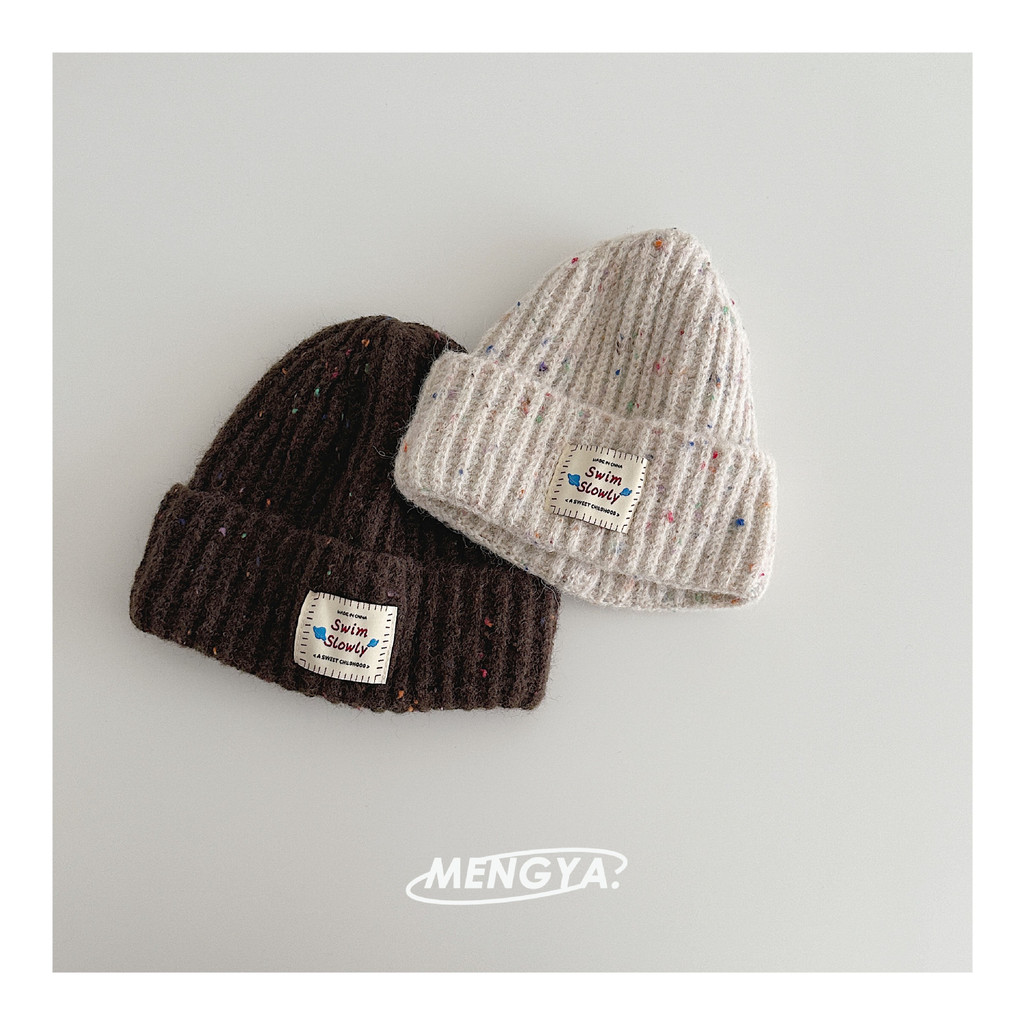 หมวกถักไหมพรมเด็ก สไตล์เกาหลี ป้ายหนังลายจุดสีสัน กันลมกันหนาว