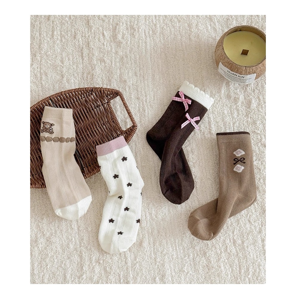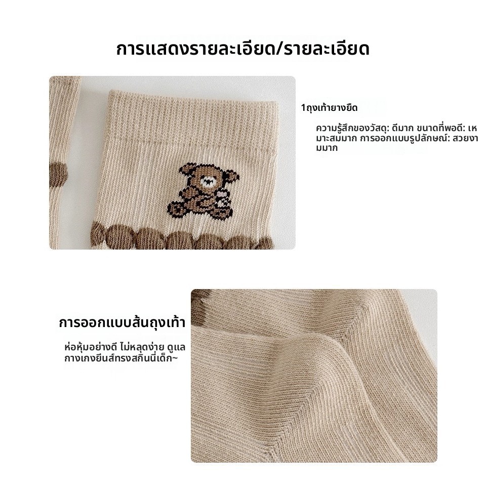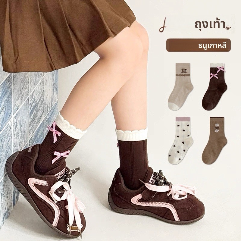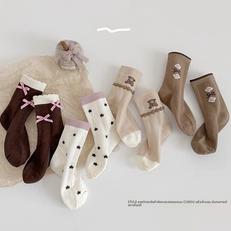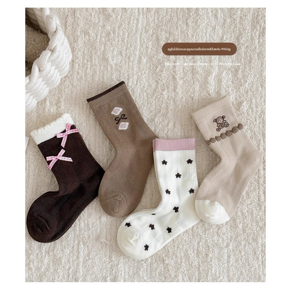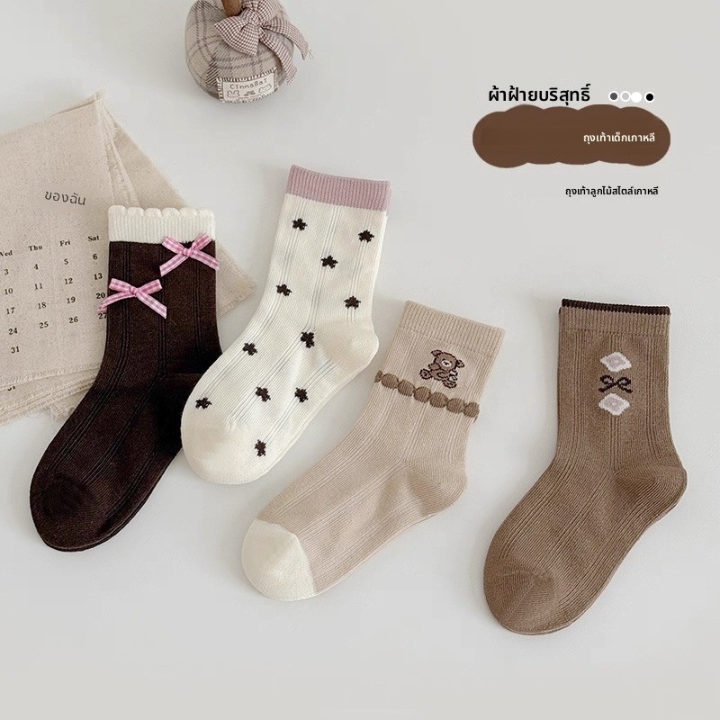 สี่คู่ 2025 ฤดูใบไม้ผลิฤดูใบไม้ร่วงสไตล์ใหม่สไตล์เกาหลีกาแฟสีชมพูกุทัณฑ์การ์ตูนหมีถุงเท้ากลางหลอดถุงเท้าเด็ก