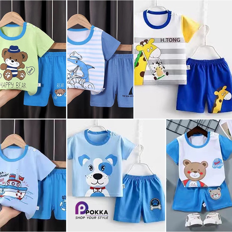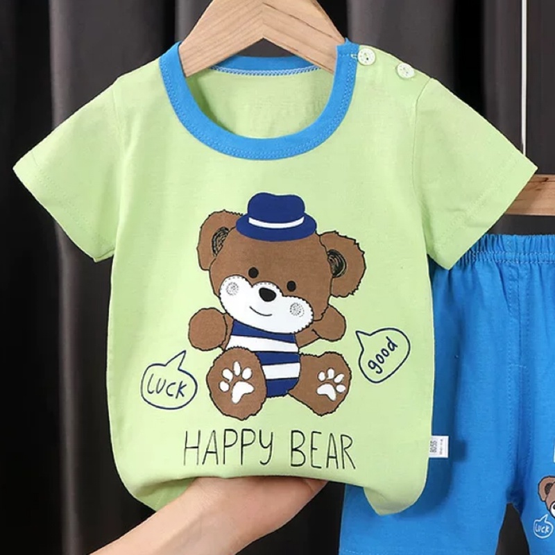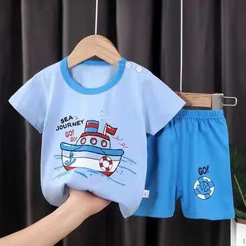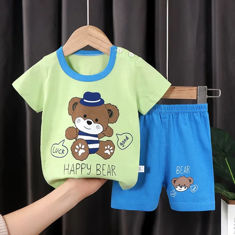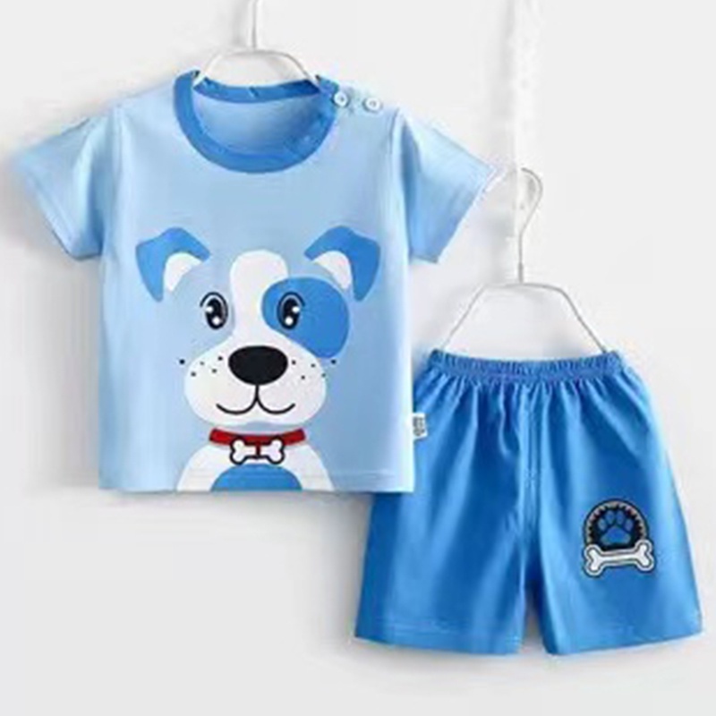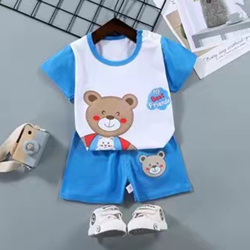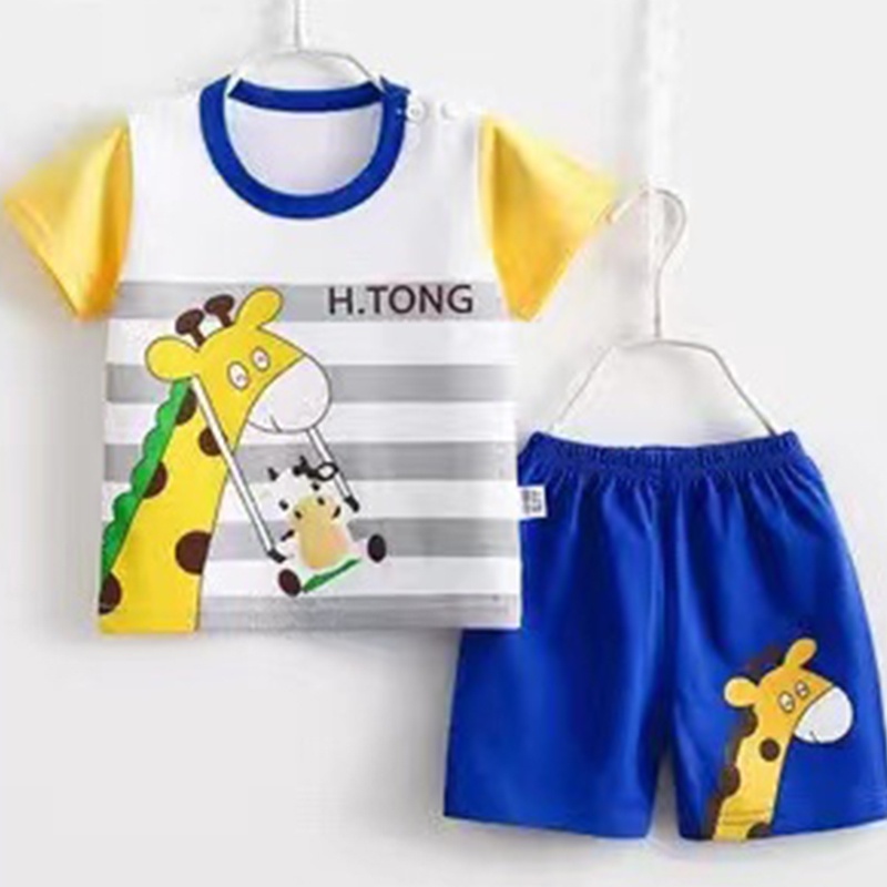 New set เสื้อผ้าเด็กผู้ชาย เสื้อยืดคอกลม กางเกงขาสั้น ตกแต่งกระดุมลายสัตว์น่ารัก