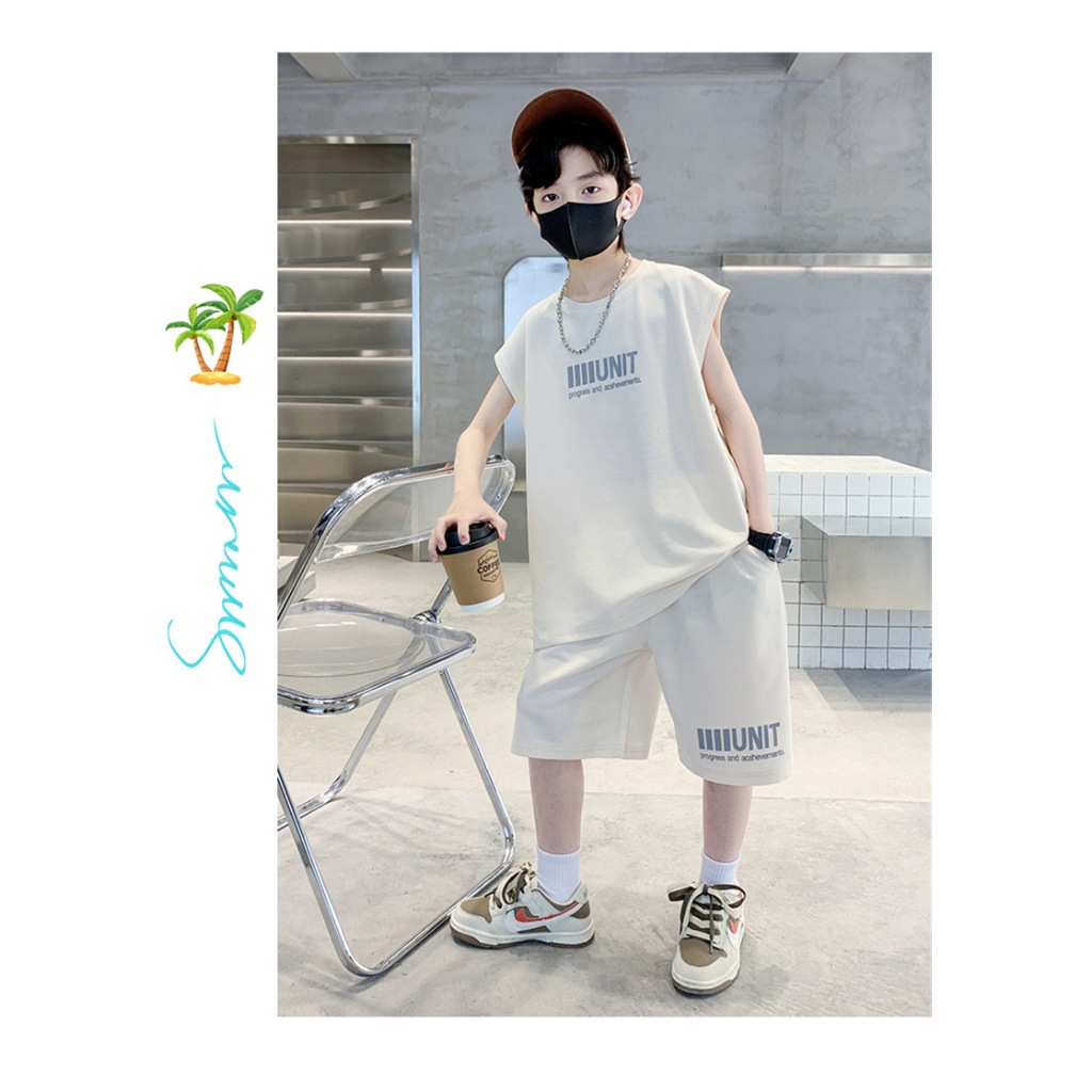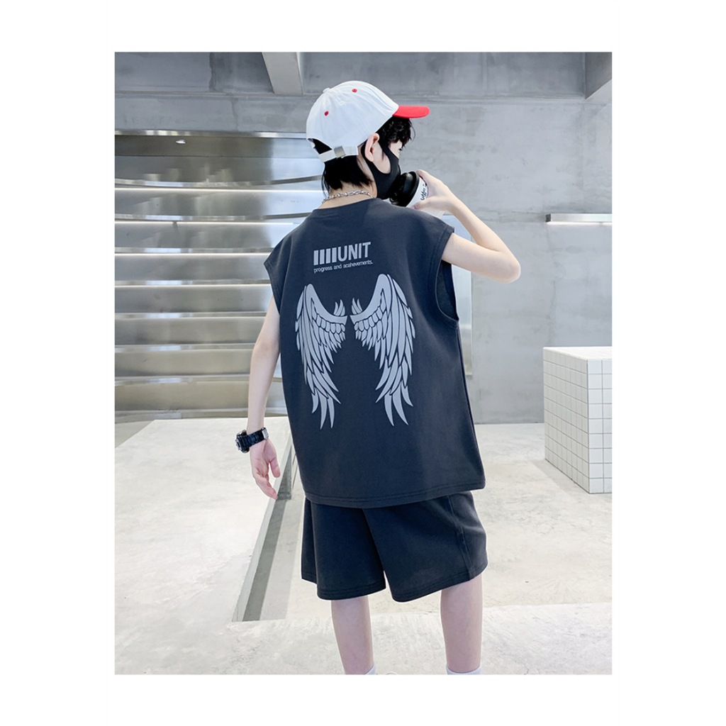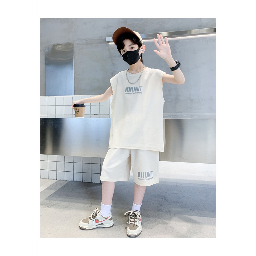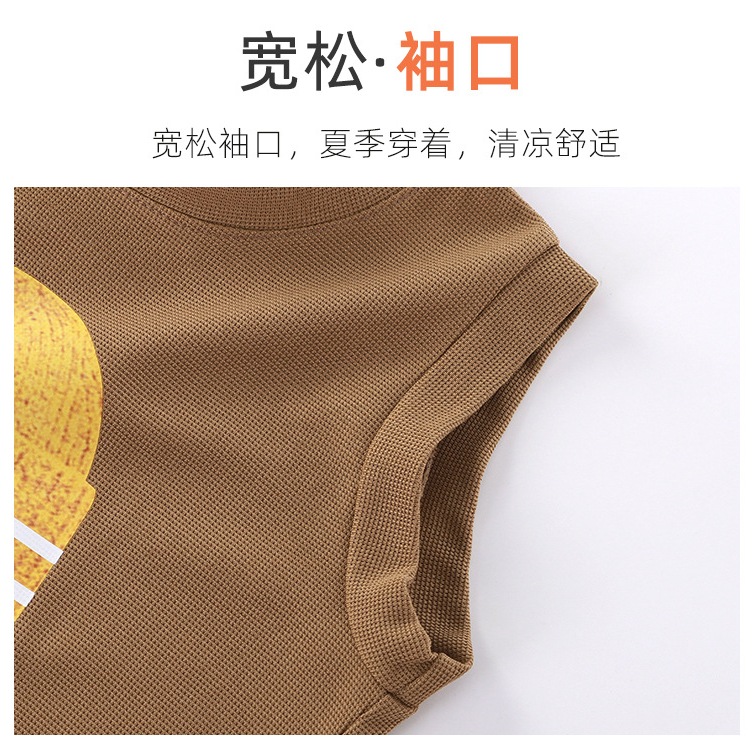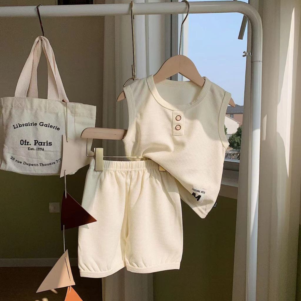 HU05 ชุดเสื้อกล้าม ใหม่เด็กเสื้อกั๊กชุดเด็กแขนสั้นสองชิ้นชุดเด็กชายและเด็กหญิงในช่วงฤดูร้อนเด็กวาฟเฟิลแฟชั่นเด็กสูทเสื้อ