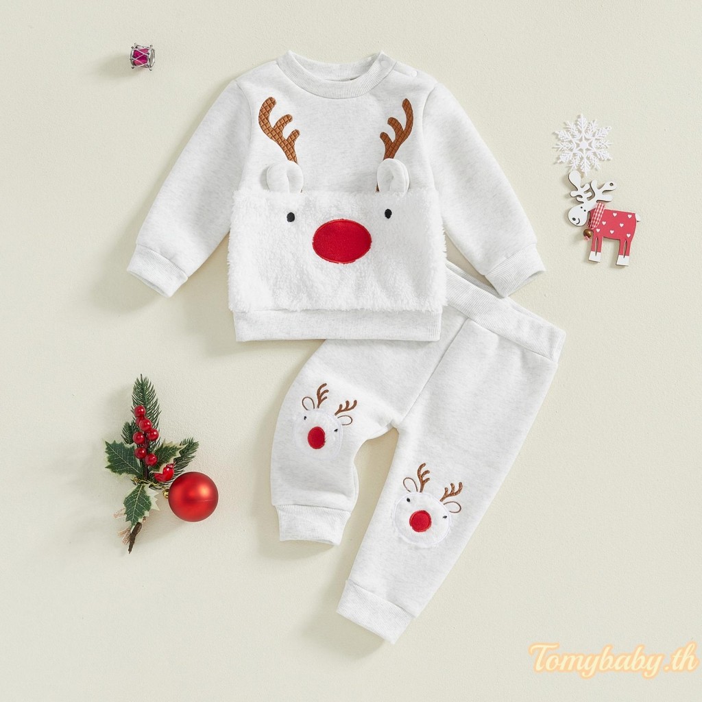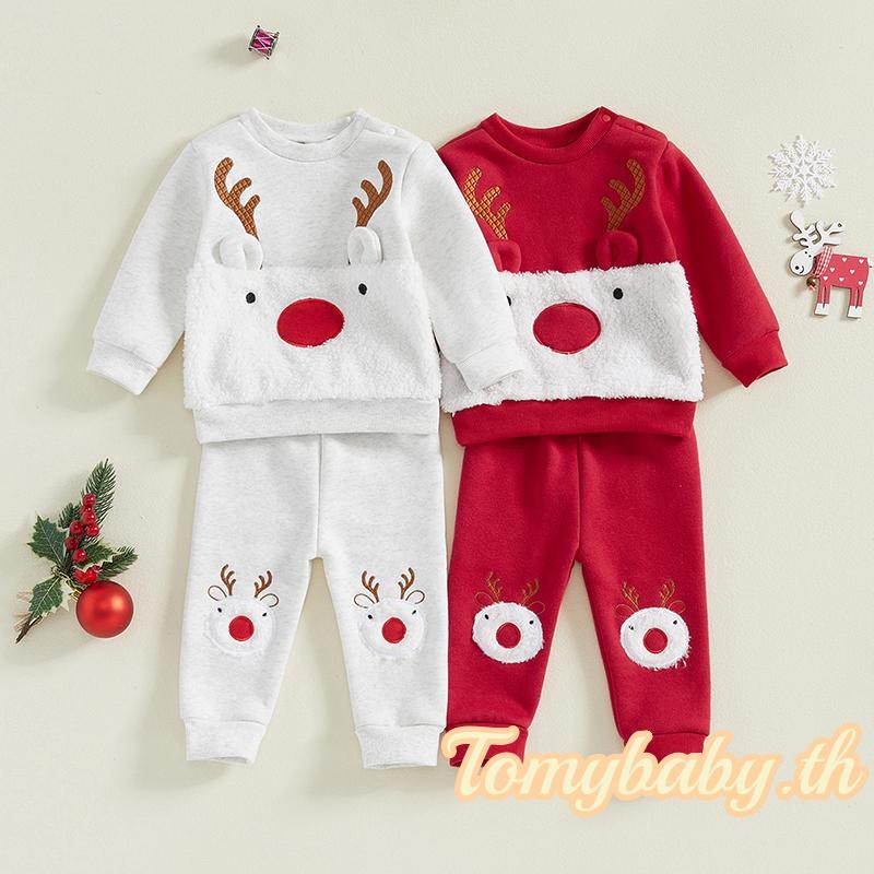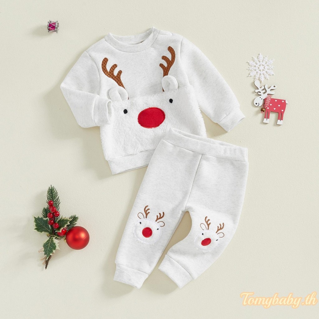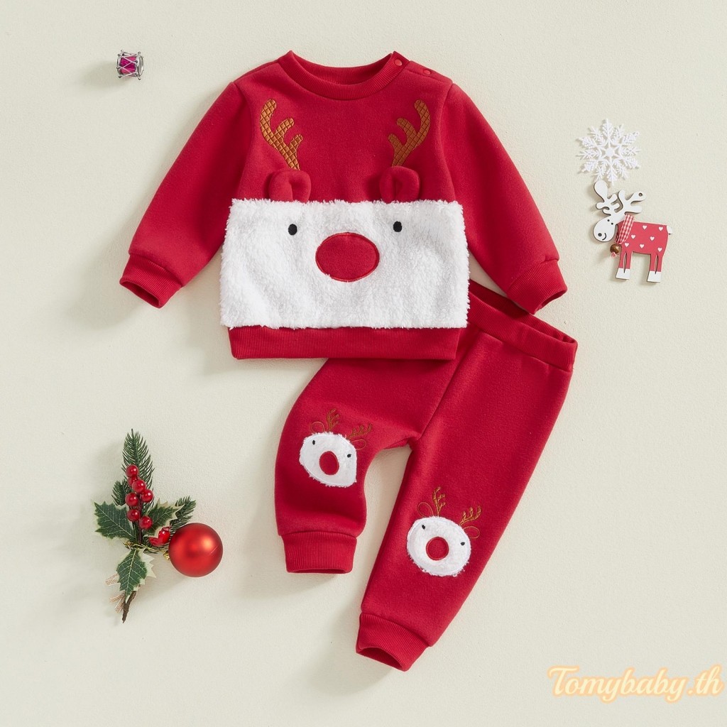 Tomybaby-ชุดคริสต์มาสสำหรับเด็กชาย เสื้อสเวตเตอร์แขนยาวปักลายกวางเรนเดียร์ + กางเกงเอวยางยืด 2 ชิ้น