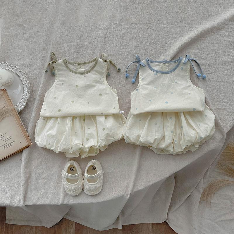 ชุดใหม่ฤดูร้อนสำหรับเด็กผู้หญิง ลายจุดสดใส เสื้อกั๊กบางและกางเกงขาสั้น ชุดสองชิ้นสำหรับเด็กผู้หญิง