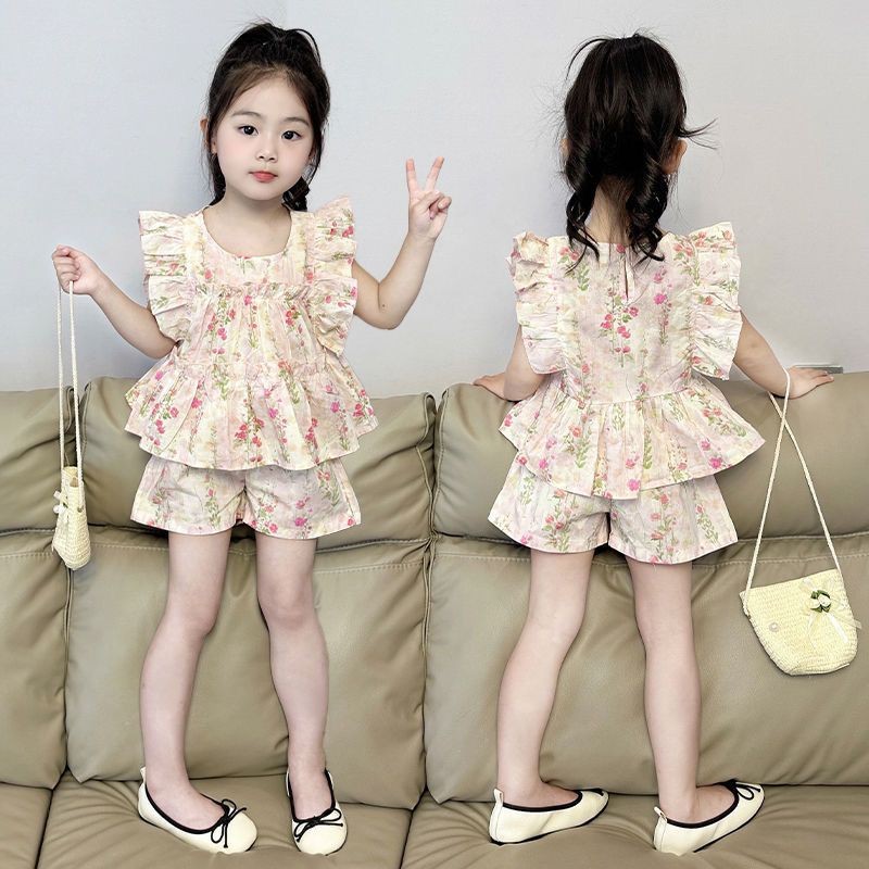 เด็กหญิง ชุดเด็กผู้หญิงฤดูร้อนสองชิ้นลายดอกไม้