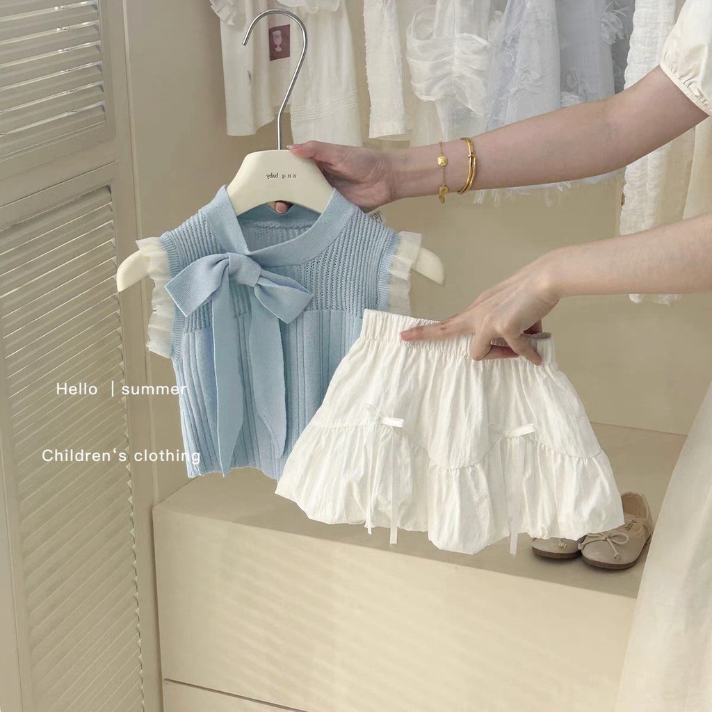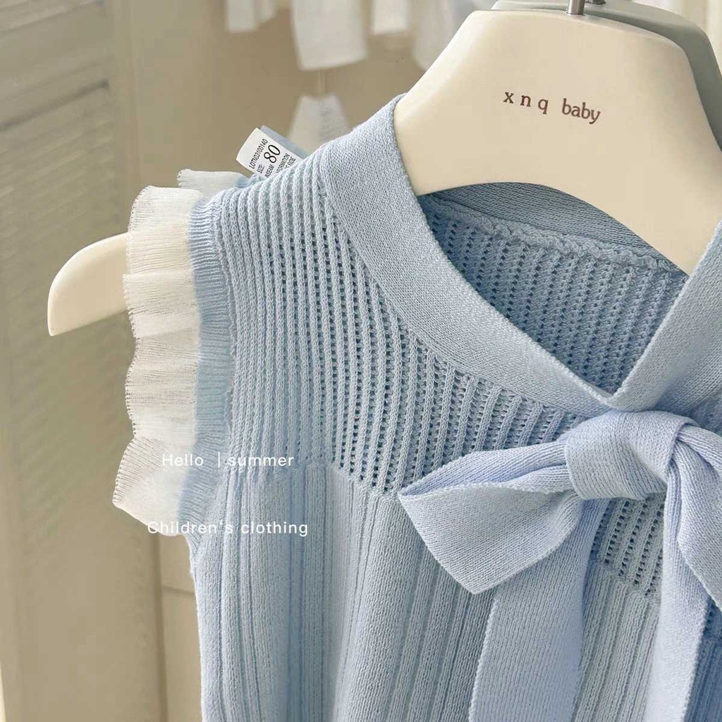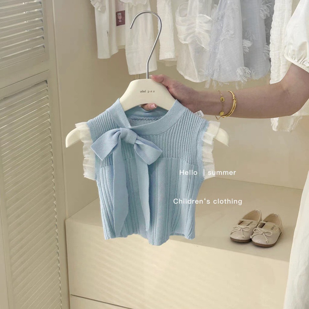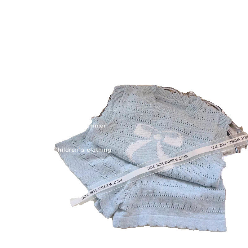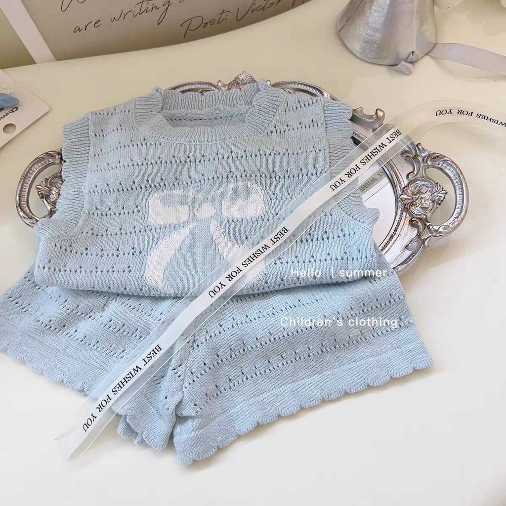เกาหลีเกาหลีเสื้อผ้าเด็กผู้หญิงฤดูร้อนสไตล์ใหม่ลูกไม้เย็นกลวงแขนกุดถักเสื้อกั๊กกางเกงขาสั้นสูท อิน