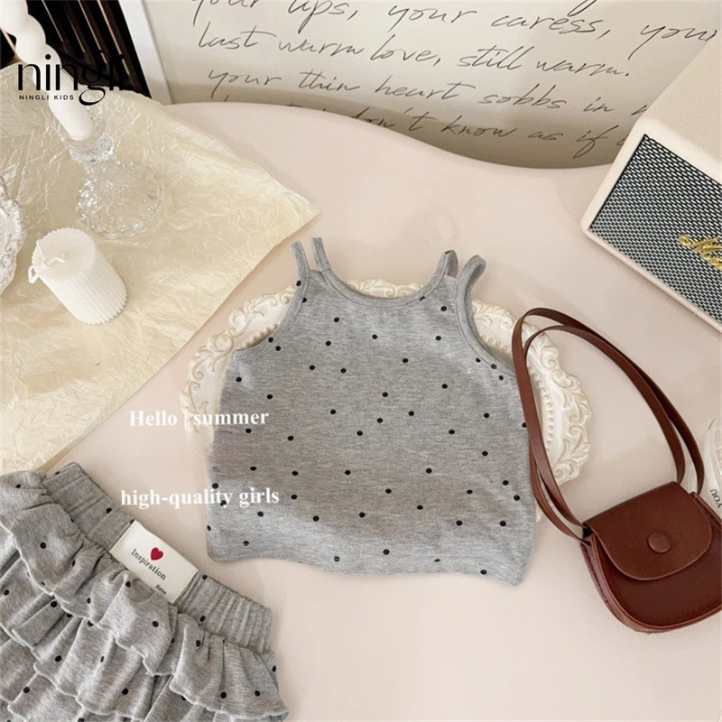 สาวฤดูร้อนชุดเด็กเสื้อกั๊กแขนกุดสีเทาด้านบน + กางเกงขาสั้นลายจุดเด็กสไตล์เกาหลีชุดสองชิ้น