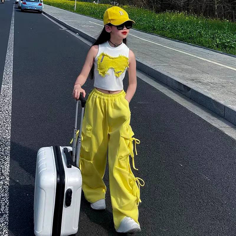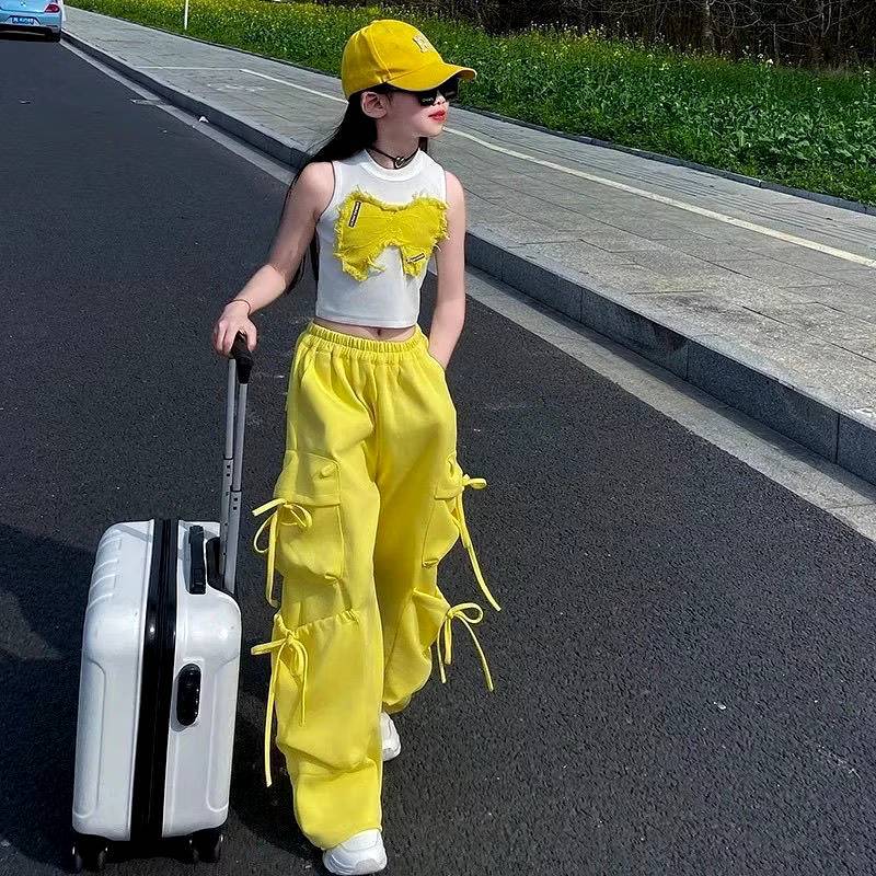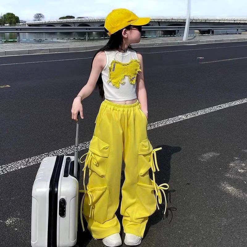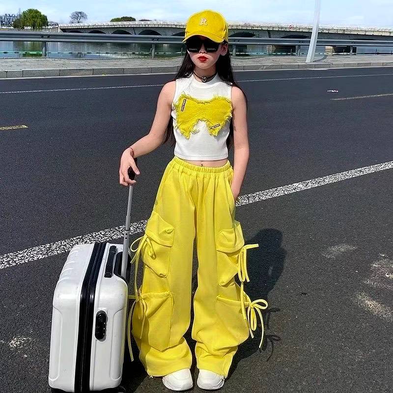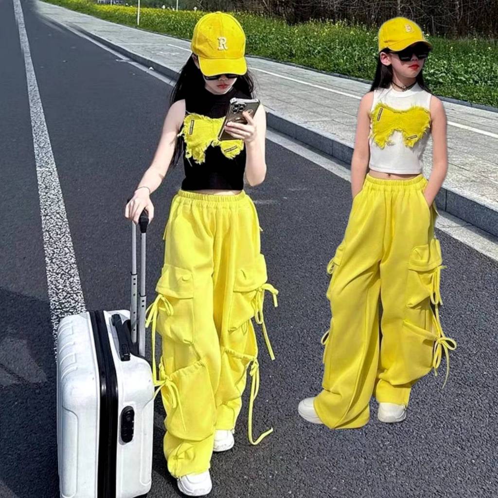 [Y D]🔥พร้อมส่ง🔥ชุดเด็กผู้หญิงน่ารัก ชุดเซ็ต 2ชิ้น เสื้อลายผีเสื้อ+กางเกงคาร์โก้สีเหลือง สไตล์แฟชั่นฤดูร้อน #421